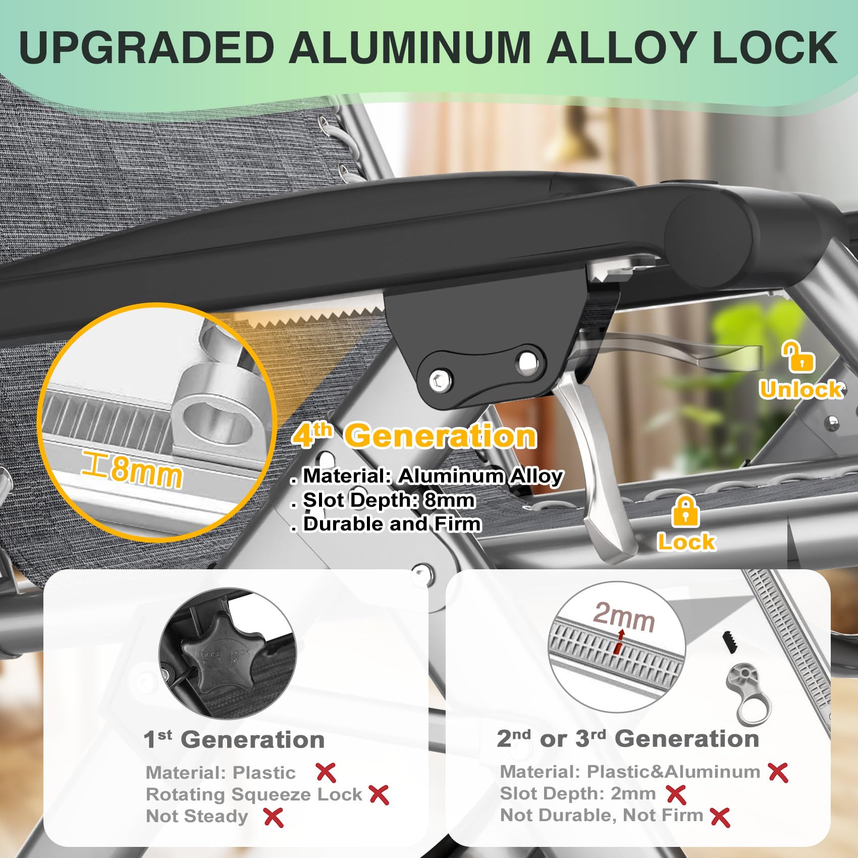 【Easier to Adjust and Lock Chair】Zero gravity recliner with the fourth-generation upgraded aluminum alloy lock makes it easier to adjust the chair from 90º to 170º. The 8mm deep groove locks the recliner more firmly, and is more durable than the previous 3-generation 2mm plastic and aluminum buckles, making the recliner safer to use and will not fall from it. Smoothly adjustment, easy to get a stress-free weightlessness, to achieve the best state of relaxation