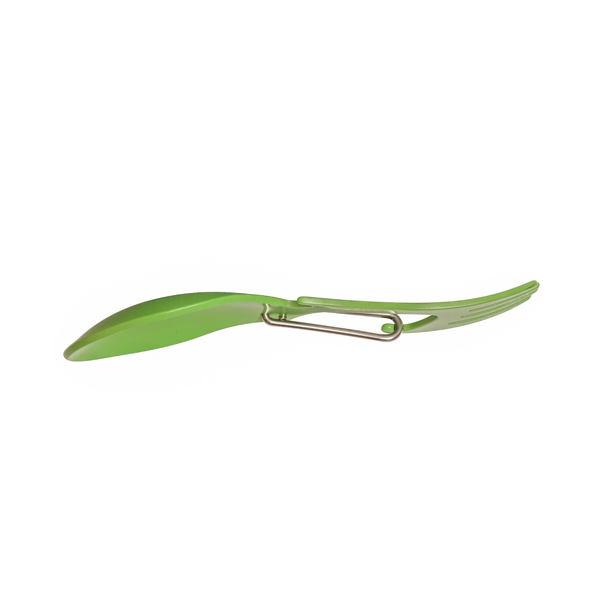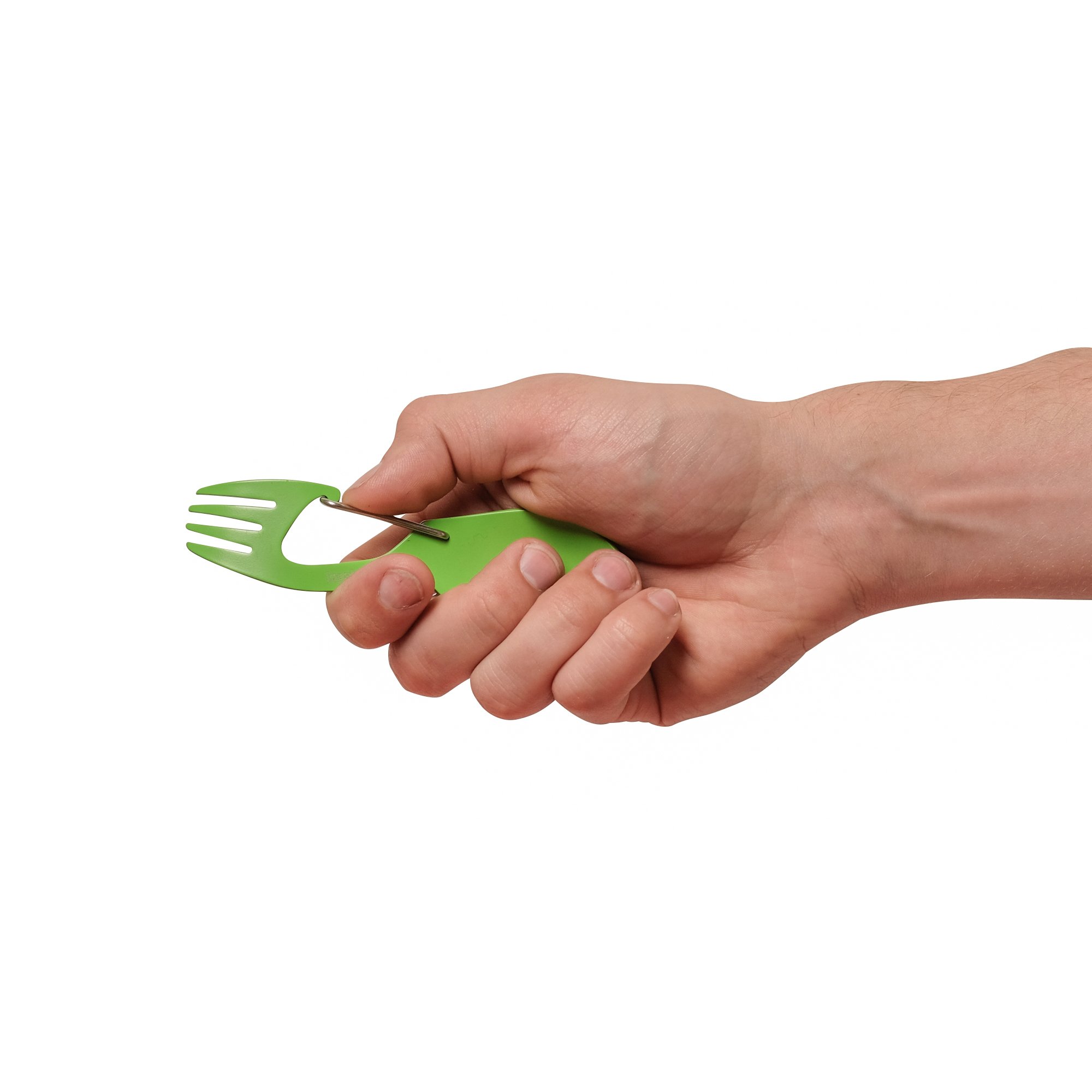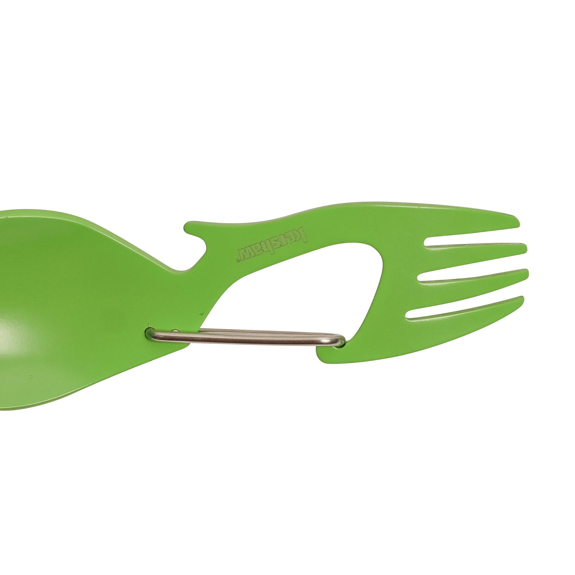 RATION SPORK MULTI-TOOL: Essential camping and outdoor utensil featuring a generously sized spoon, functional fork, bottle opener and carabiner gate clip for versatile everyday carry.
