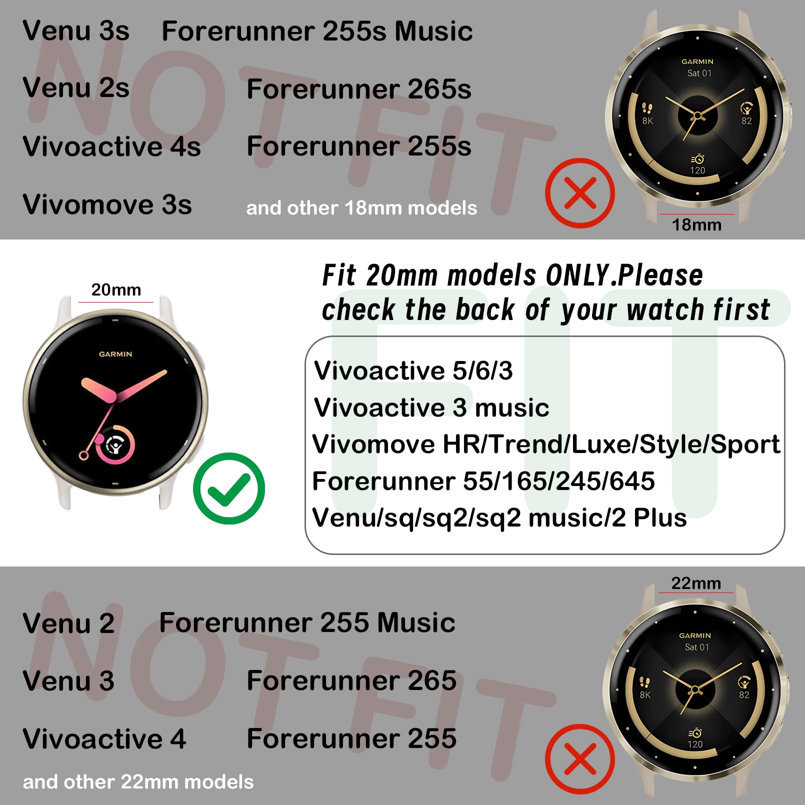 【Compatible Models】Specially designed compatible for Garmin Venu/Venu Sq /Venu Music/Sq Music/Venu Sq 2/Sq 2 Music/Garmin Vivoactive 3 Music/3/5/6/Forerunner 165/645/245/55 Music/570 42mm/Venu 2 Plus(NOT Venu 2/2s)/Approach S50/S44/S42/S40/S12/Vivomove HR/Trend/Luxe /Style.Please check your watch model before buy it.Also determine the size(20mm) of the watch band to be used by measuring the distance between 2 lugs of the watch face