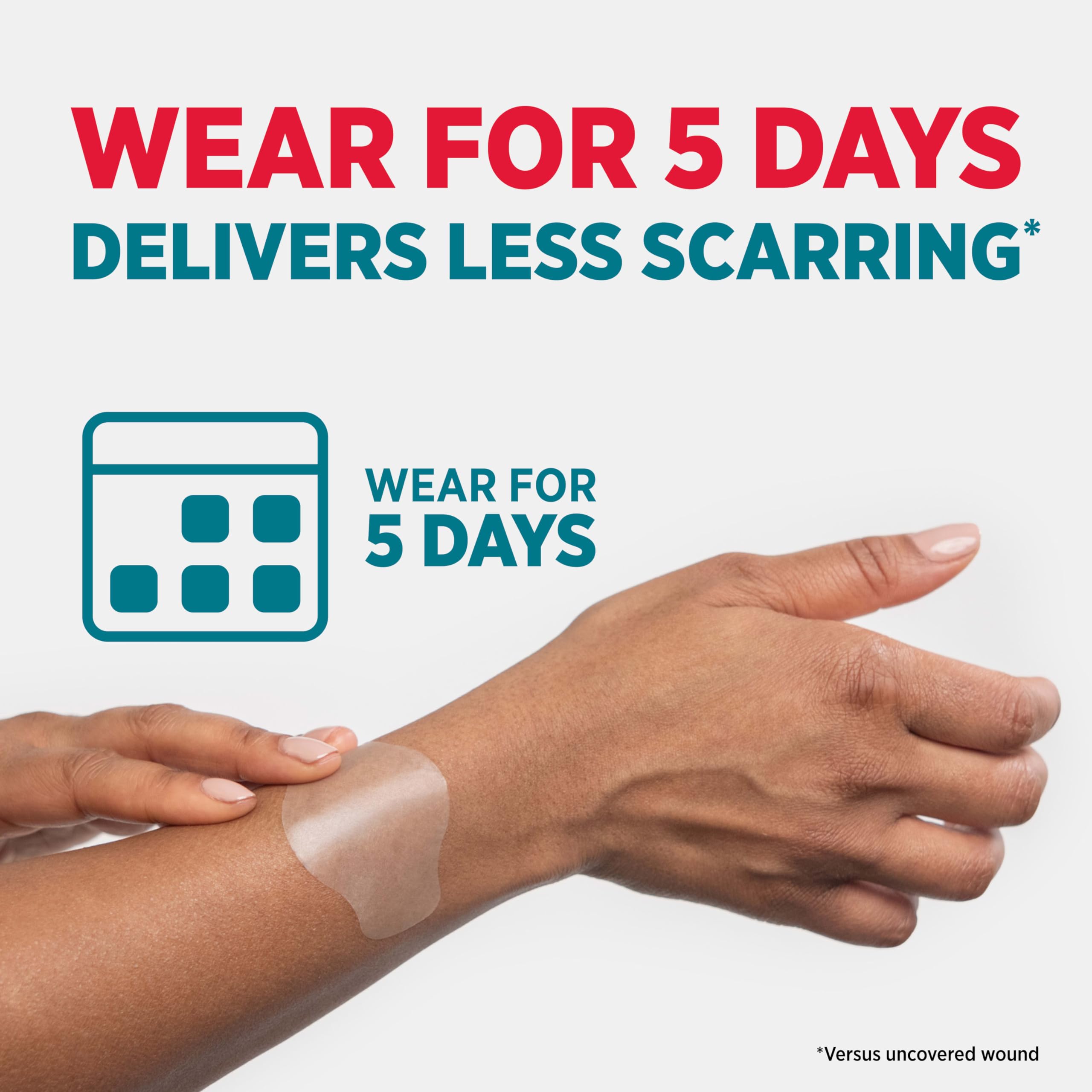 100 percent waterproof bandages stay in place for up to 5 days, even through handwashing and showering, providing continuous wound protection and an optimal healing environment for long-lasting comfort and less scarring*