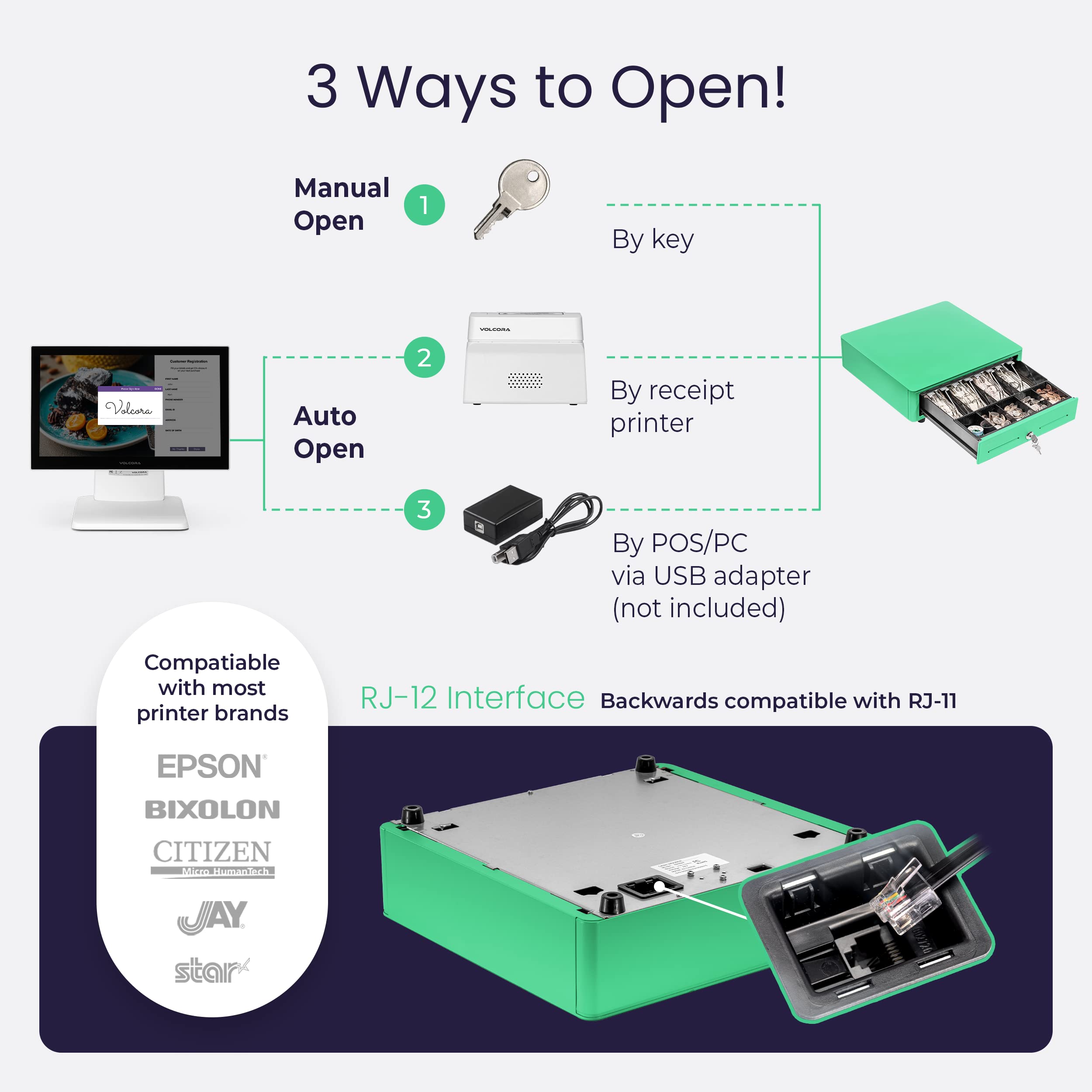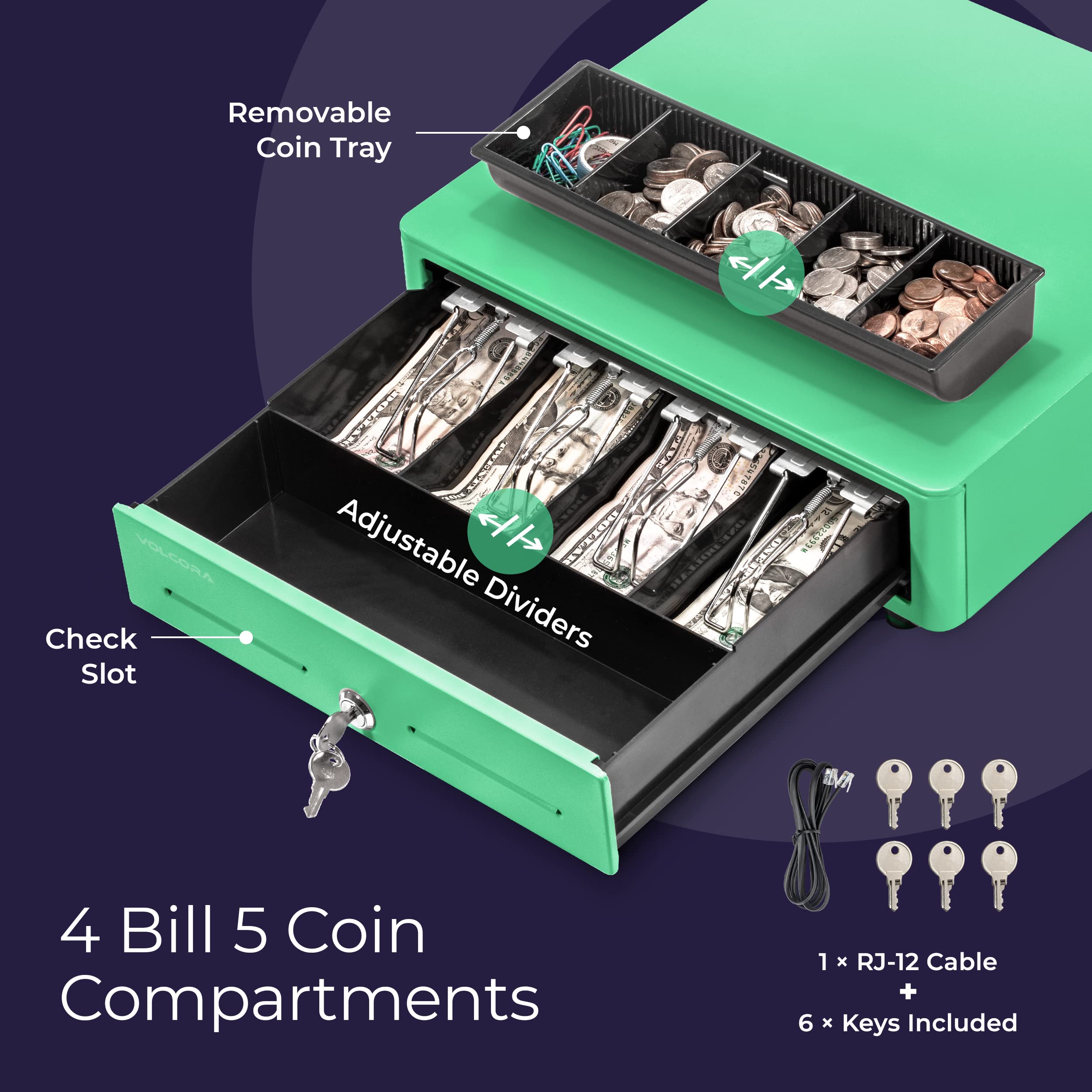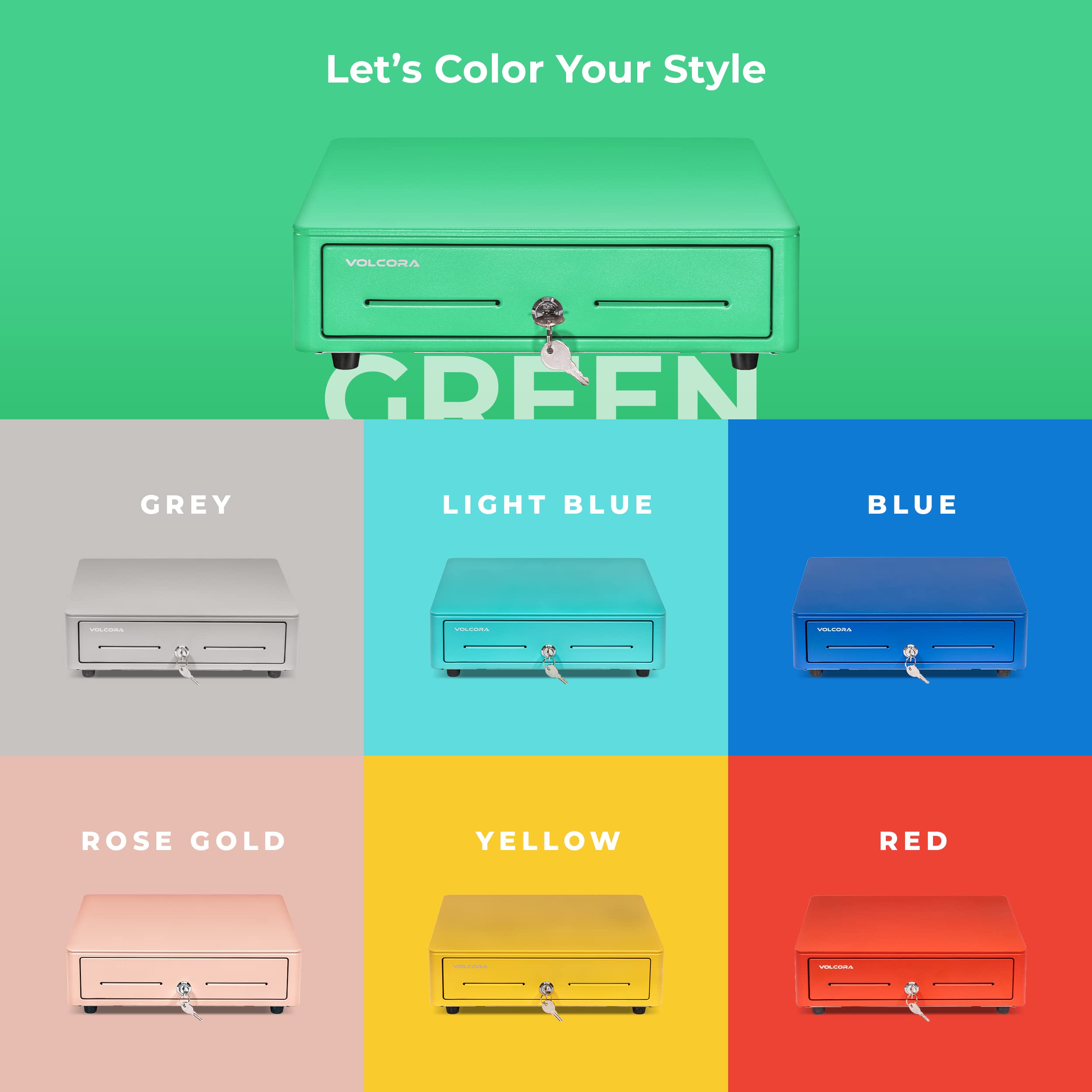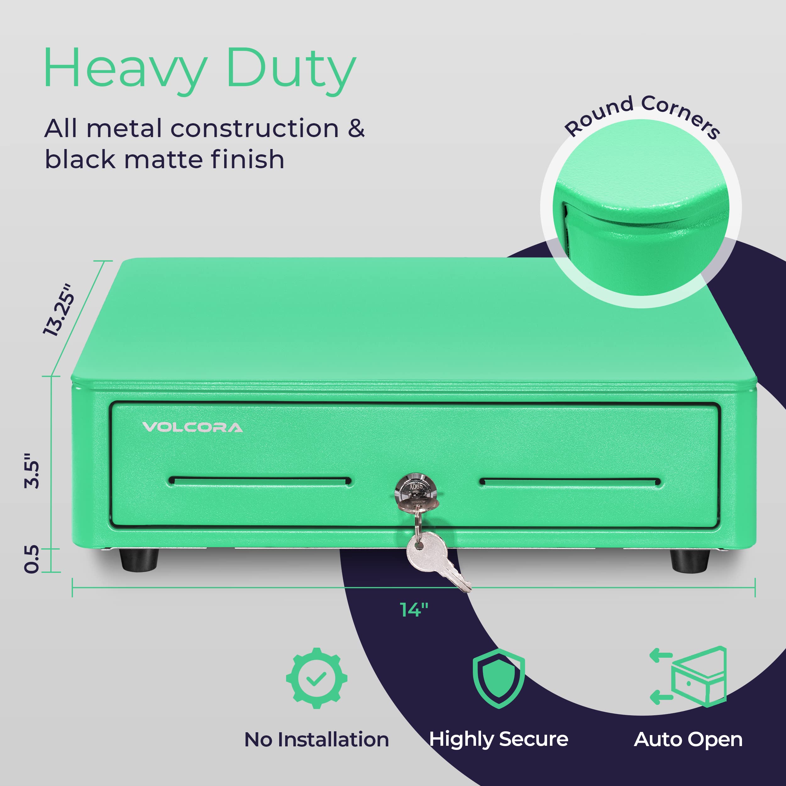 DURABLE POS CASH DRAWER: Volcora cash register drawer with round corners measures 14"x13.25"x4", Color: green, and Voltage: 24VDC. Our cash drawer has a heavy duty durable metal frame that is an ideal cash register for small businesses and even big establishments too.