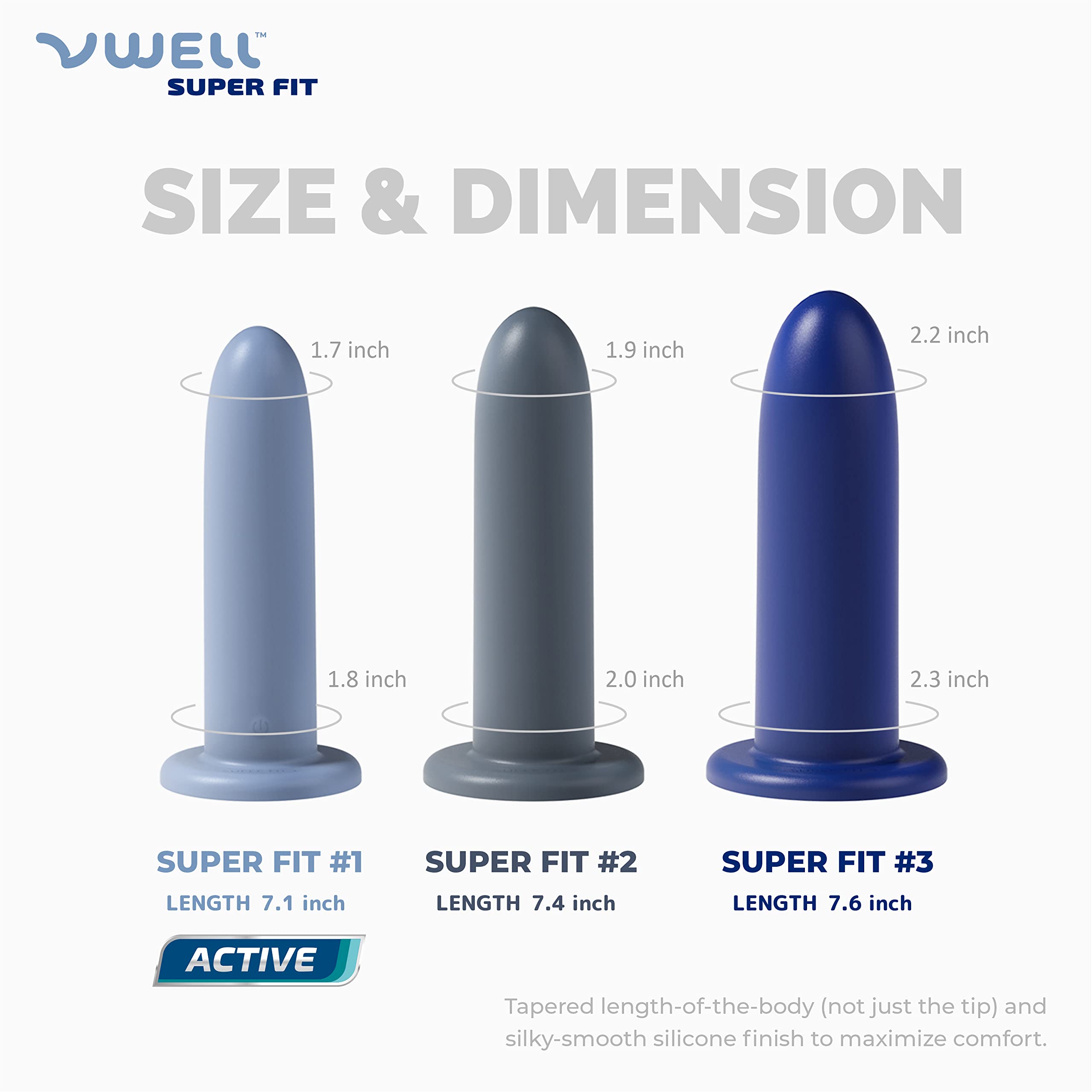 Your partner is larger-than-life in every way. Making a connection should be a delight, not a test of endurance. Super Fit #1 (1.8” diameter / 5.7” girth), #2 (2.0” diameter / 6.3” girth), #3 (2.3” diameter / 7.2” girth) VWELL Super Fit can help.