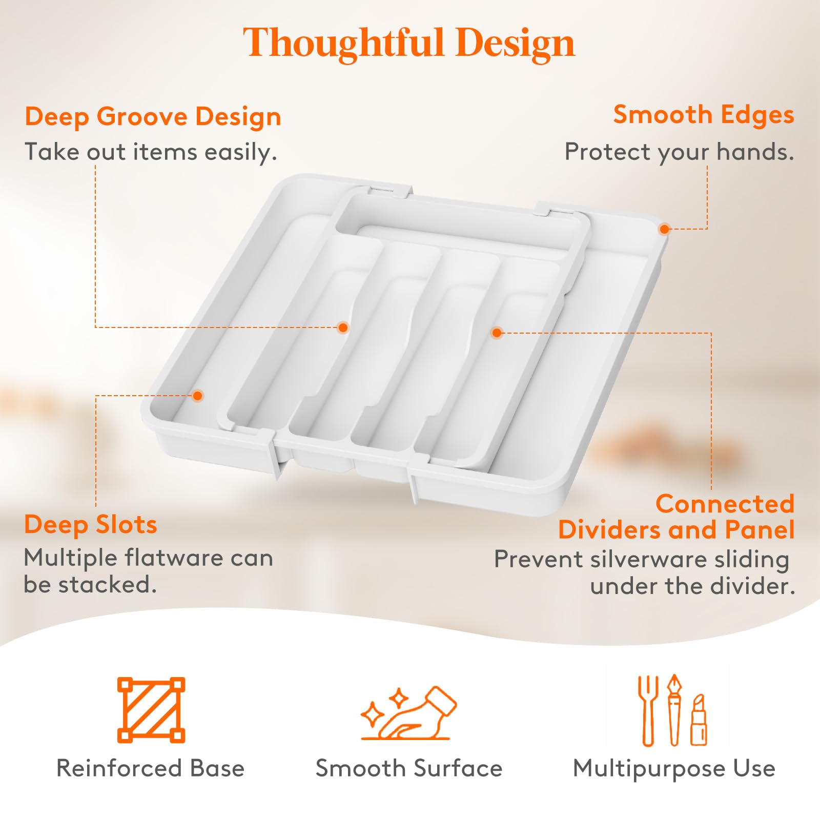 Robust and Safe: This kitchen drawer organizer is crafted from premium PP material, BPA-free and built to last. It ensures your silverware is stored in a healthy, safe environment for worry-free use