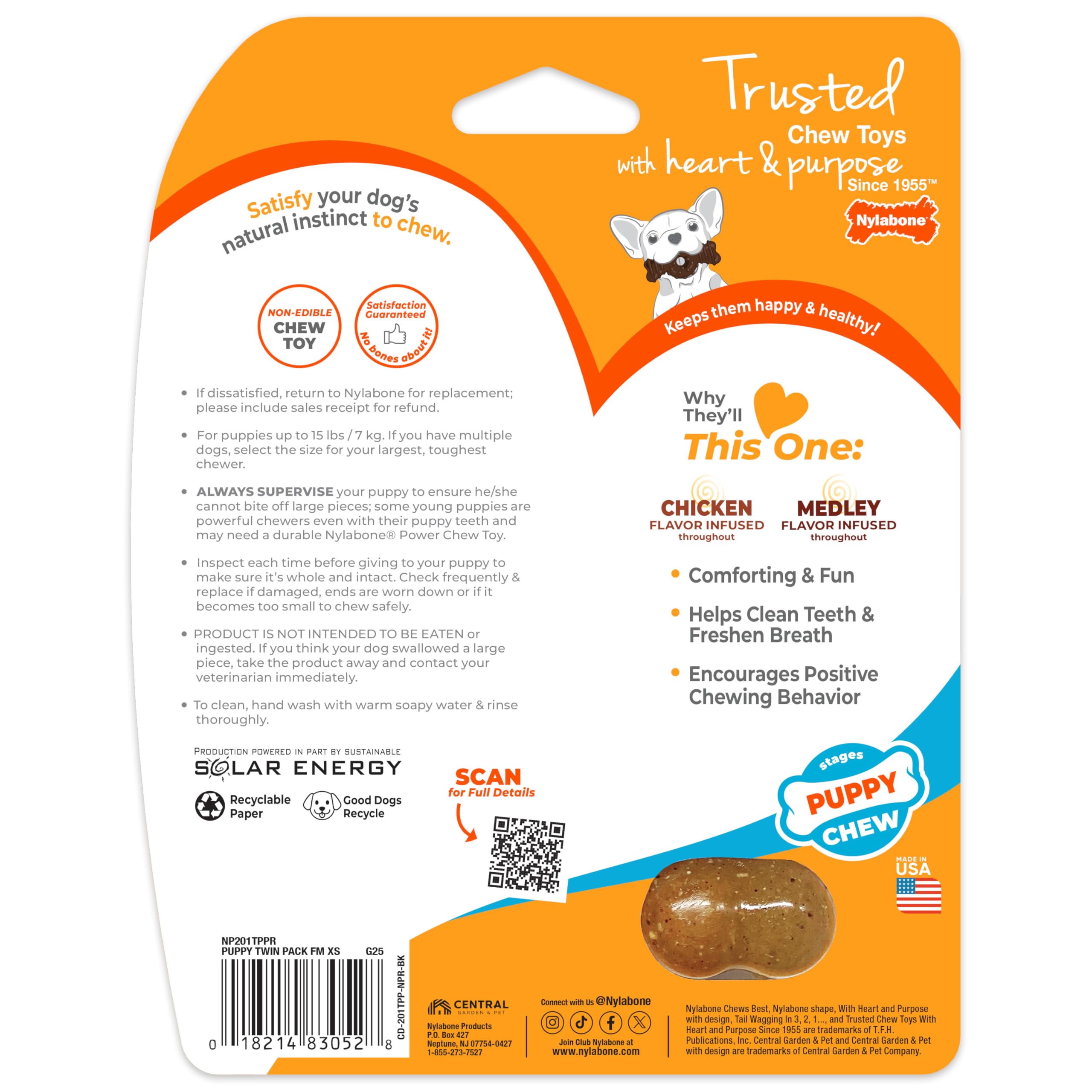 Treat your new family member to this perfect combination of puppy toys! This value pack includes two long lasting chew toys designed to encourage positive chewing habits. The first puppy toy is made of softer, flexible material made just for teething puppies! The second is a durable nylon bone for your puppy to chew when he has all of his adult teeth. Both toys help promote clean teeth and discourage destructive chewing. These chew toys are the perfect pastime for your teething puppy! Color may vary. What your dog chews matters! With destructive behavior among the leading reasons dogs are returned to shelters, we know healthy habits can make a life-changing difference. For 70 years, our family-founded brand continues to safely satisfy dogs’ chewing instincts and help them stay in loving forever homes!