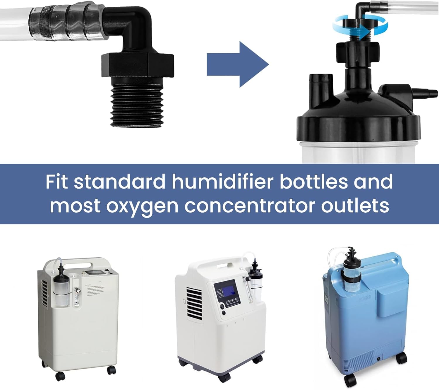 Easy to use. Screw the male thread grip into the oxygen inlet port located on top of the humidifier bottle. Attach the connector tube's ribbed end to the concentrator's oxygen outlet port.