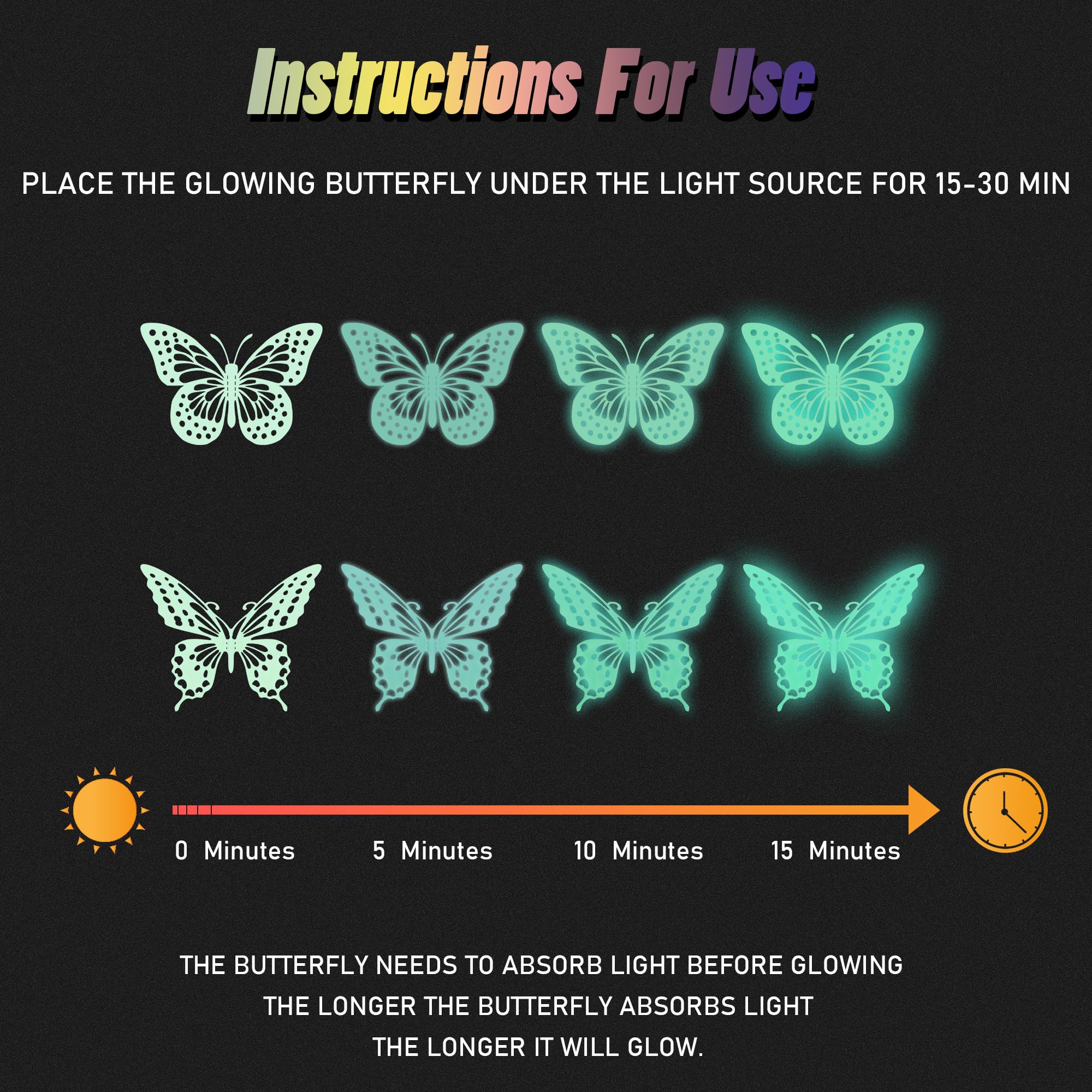 【How to Use】The butterfly needs to absorb light before glowing, the longer the butterfly absorbs light, the longer it will glow. Just place the glowing butterfly under the light source for 15-30 minutes and they will glow in the dark.
