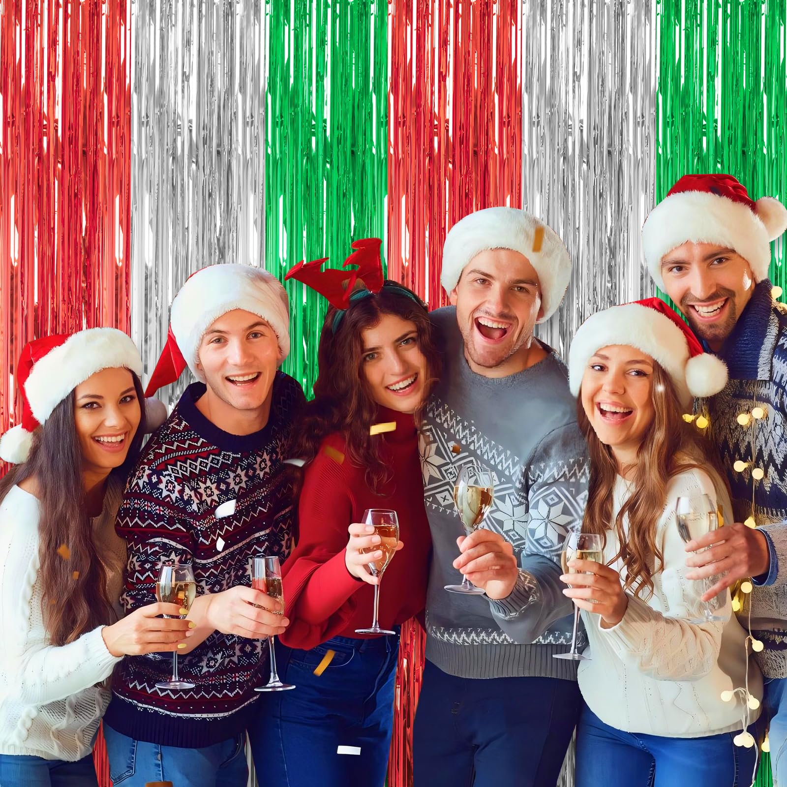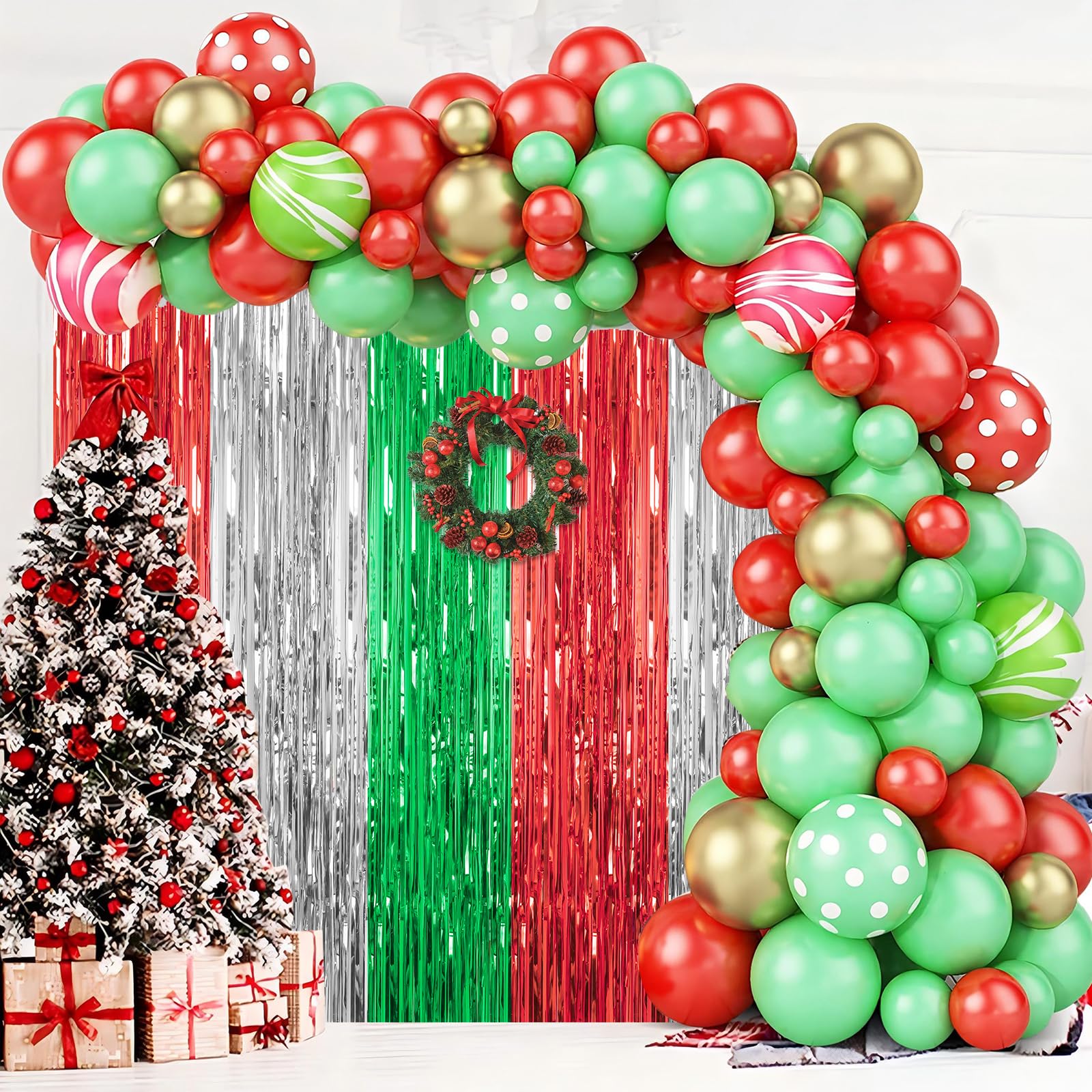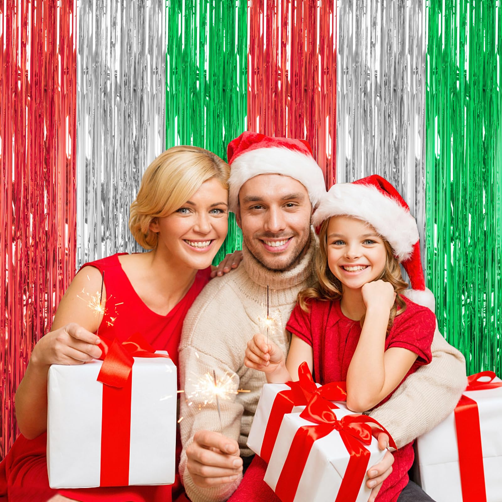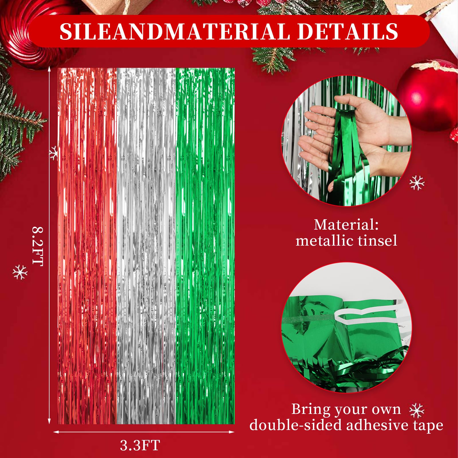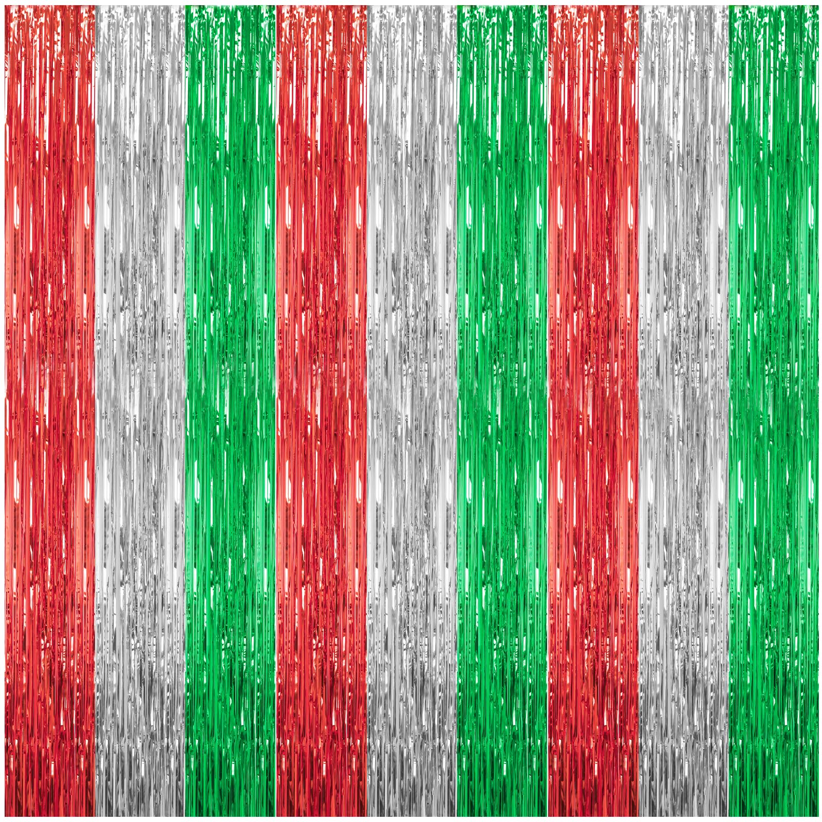 DECOCKRAT 3 Pack Foil Fringe Backdrop - Red&Silver&Green Shiny Tinsel Curtains for Party Decoration/Photo Booth Props - 3.3x8.2FT Metallic Foil Backdrop for Birthday, Wedding, Graduation, Christmas