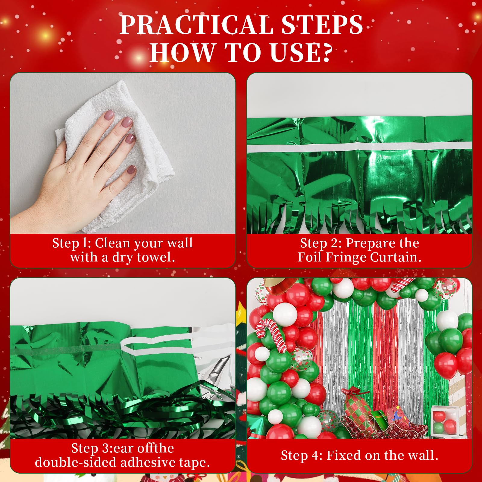 【Easy and Convenient Installation】These foil fringe curtains are easy to install and can be quickly hung on smooth surfaces using the included double-sided adhesive tape. No extra tools or materials required.