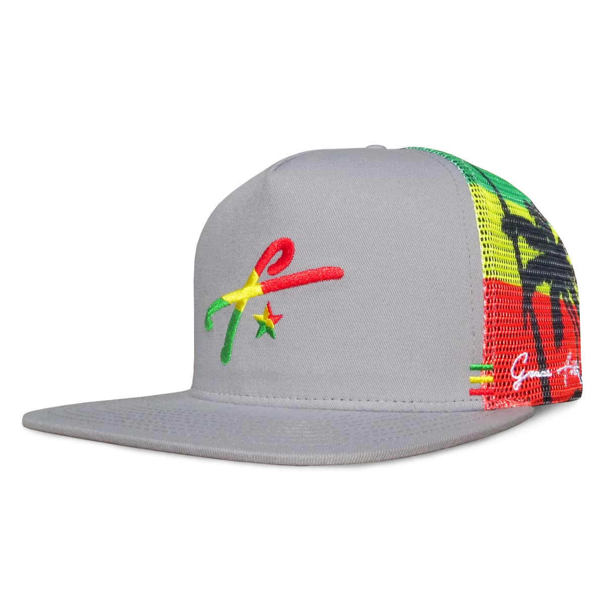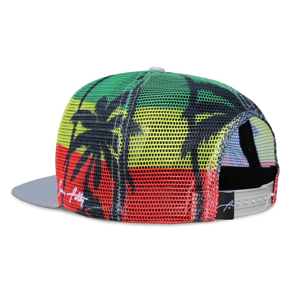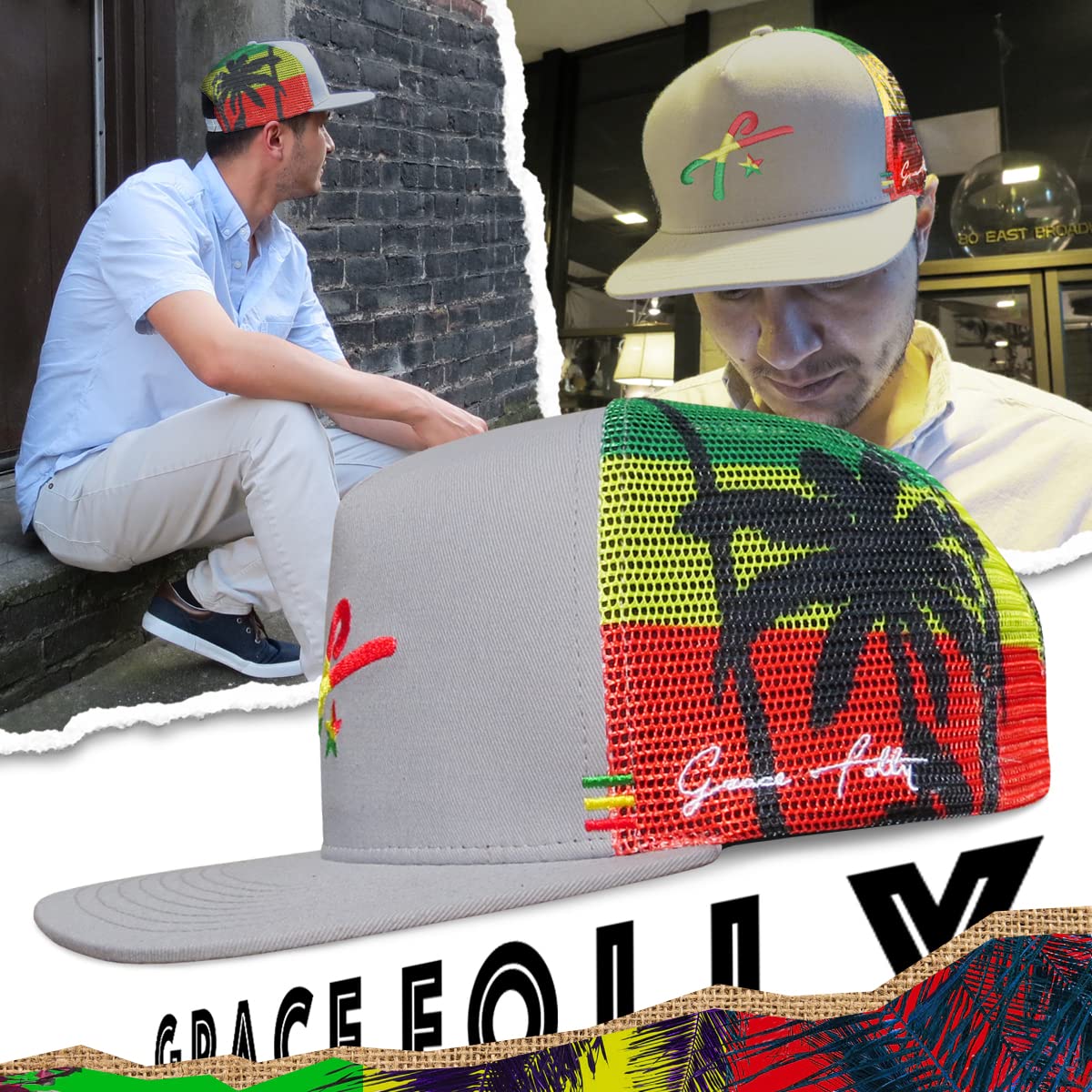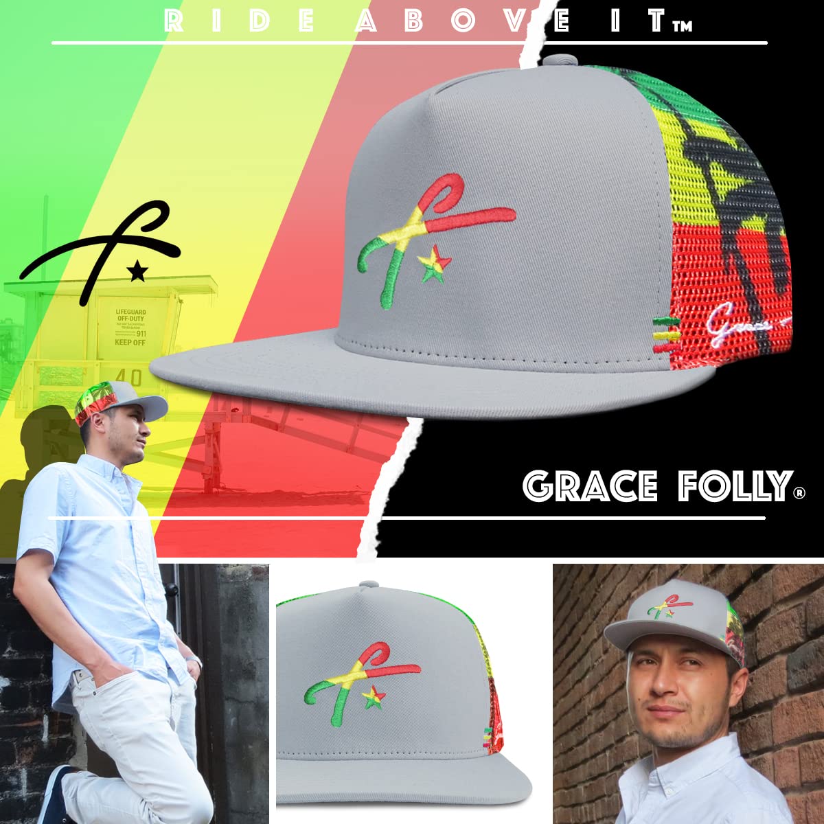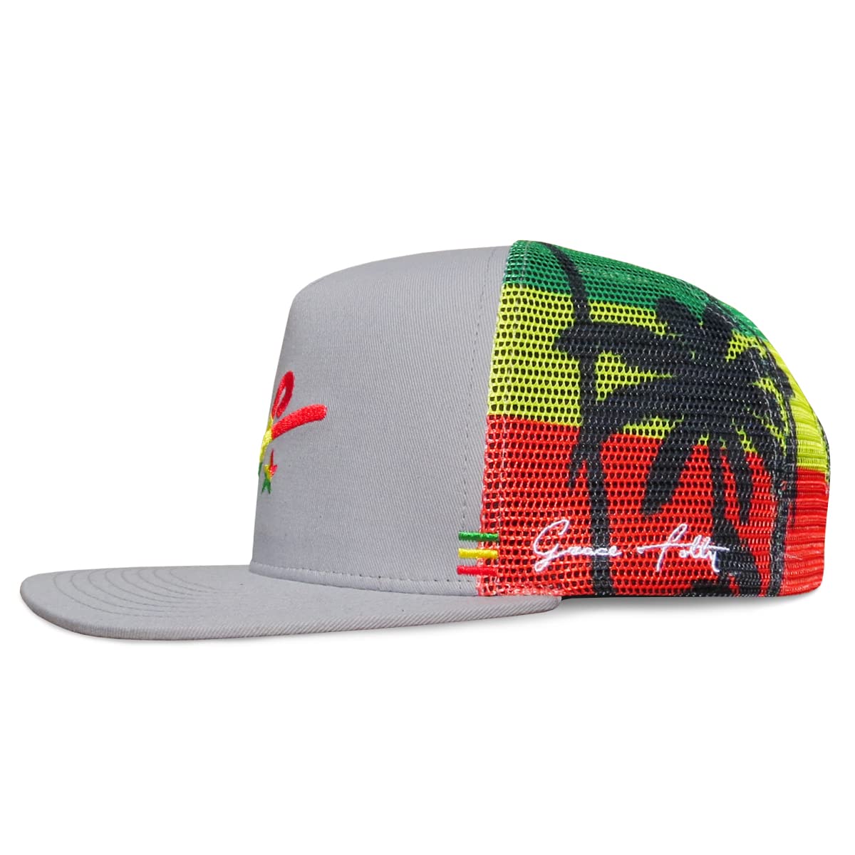 SMOOTH TRUCKER- This Rasta Grace Folly flat bill trucker hat is sure to impress! Structured 5 panel trucker cap with mesh back and adjustable snapback. Be the envy of your friends in this old school trucker.