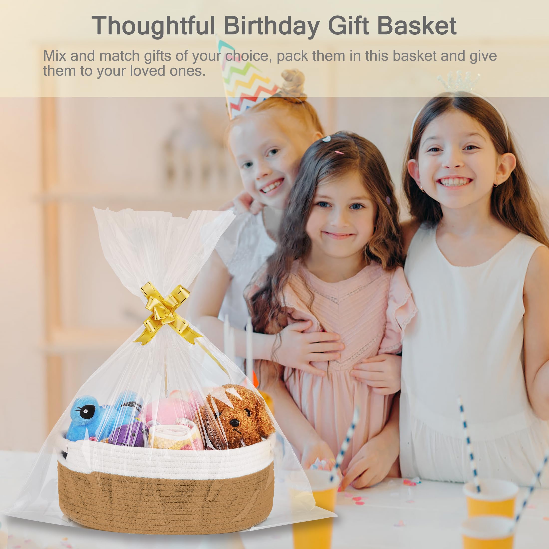 【Best Gift Set】The small storage basket comes with one clear cellophane bag and three ribbons of different colors. Mix and match gifts of your choice, pack them in this basket and give them to your loved ones. It's perfect for various occasions like Birthdays, Baby Showers, Mother's Day, Father's Day, Valentine's Day, Graduation Gifts, Easter, Christmas and more. This woven basket is a great gift in itself.