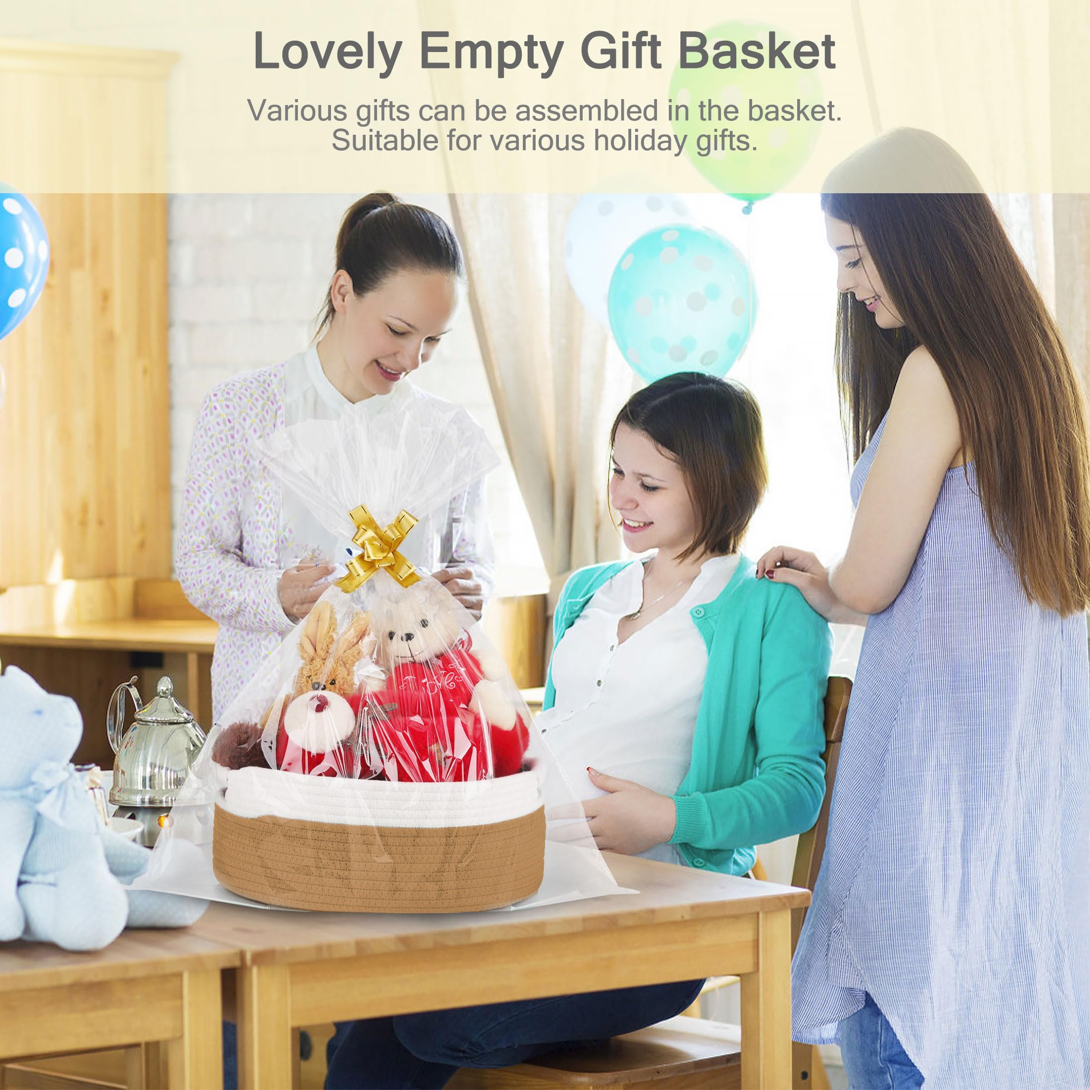 【Ideal Size and Material】Our lovely empty gift basket measures 13“ x 9” x 5.5". It is made of high quality natural cotton rope, soft and skin-friendly, chemical free, and won't scratch clothes or furniture. It's a perfect storage basket for families with babies or pets.