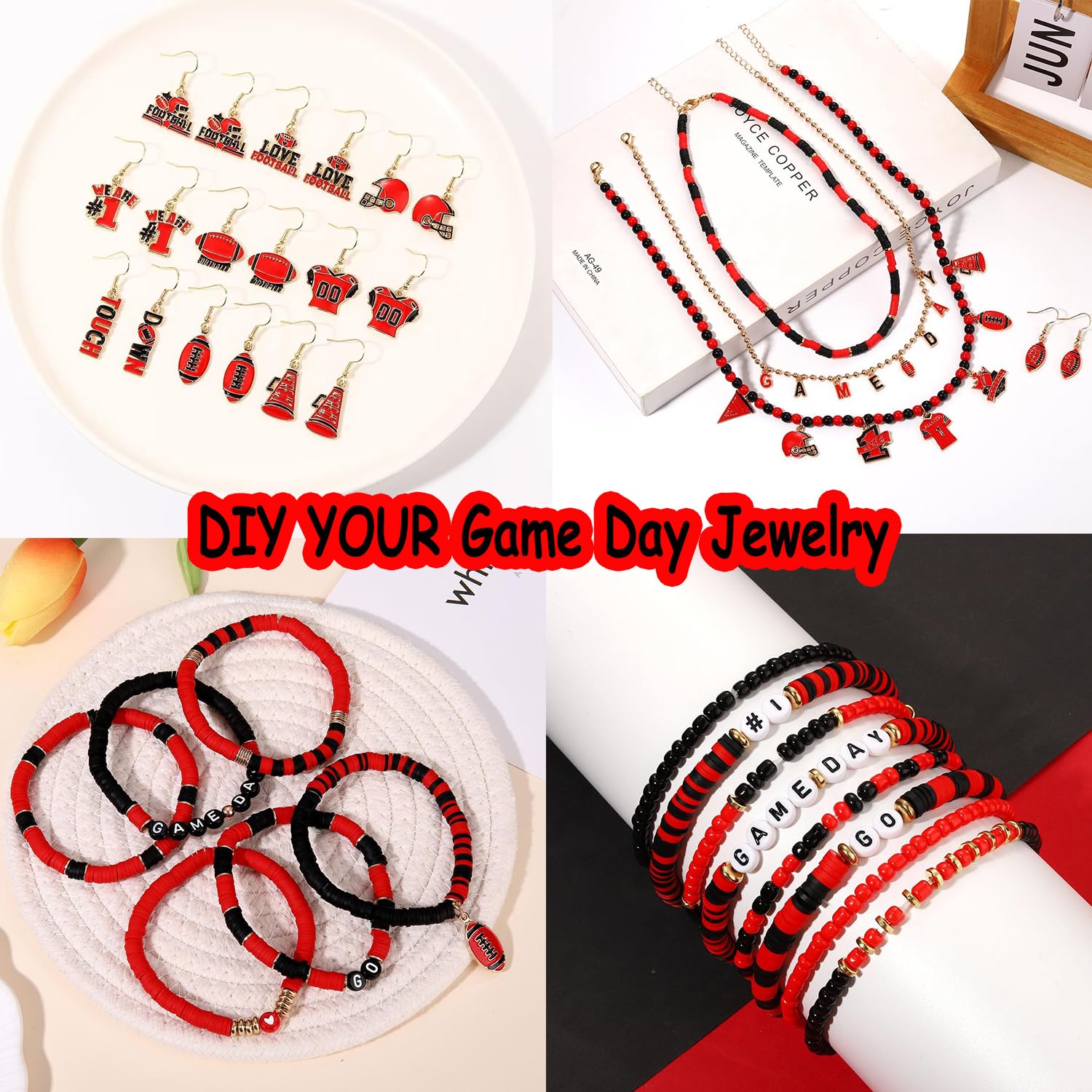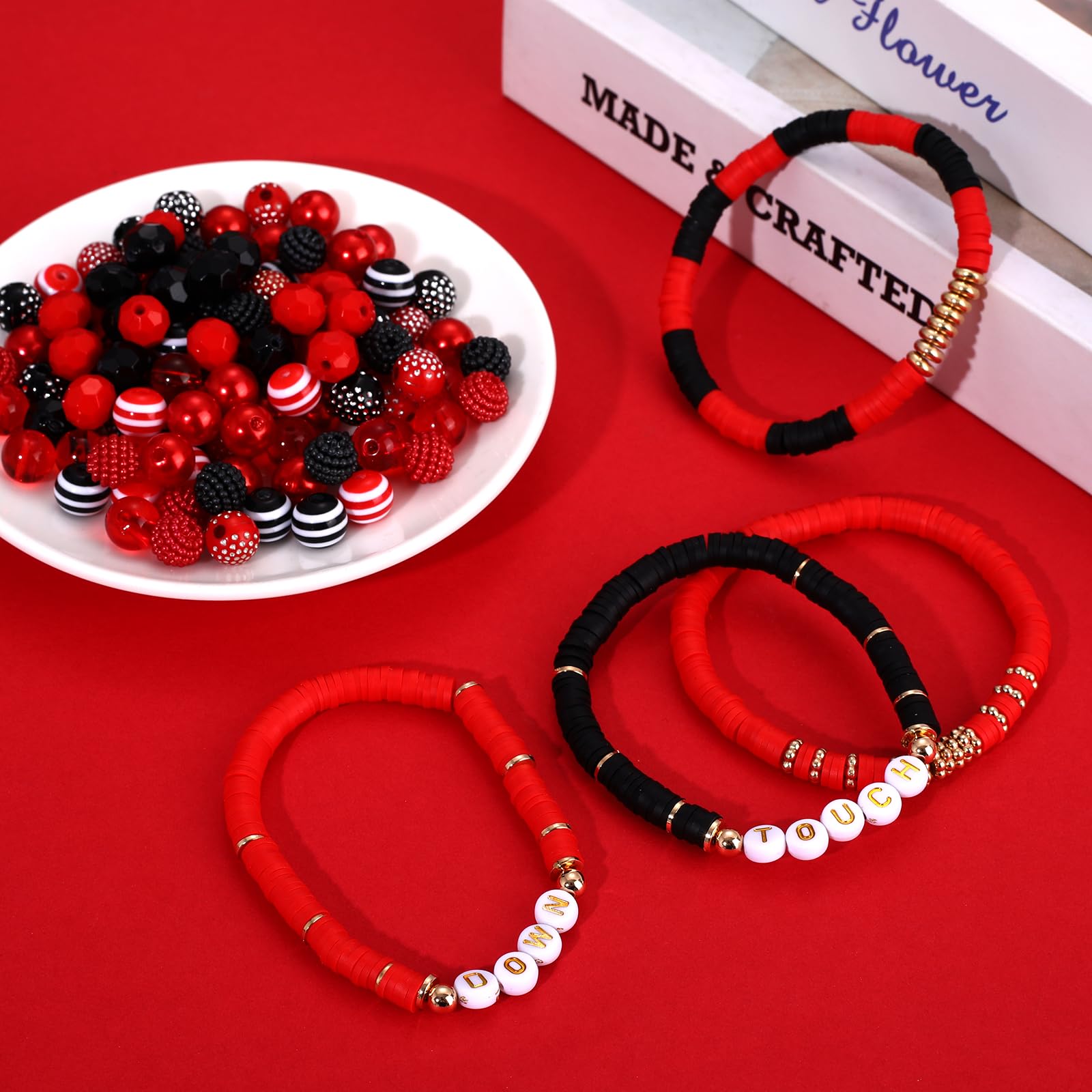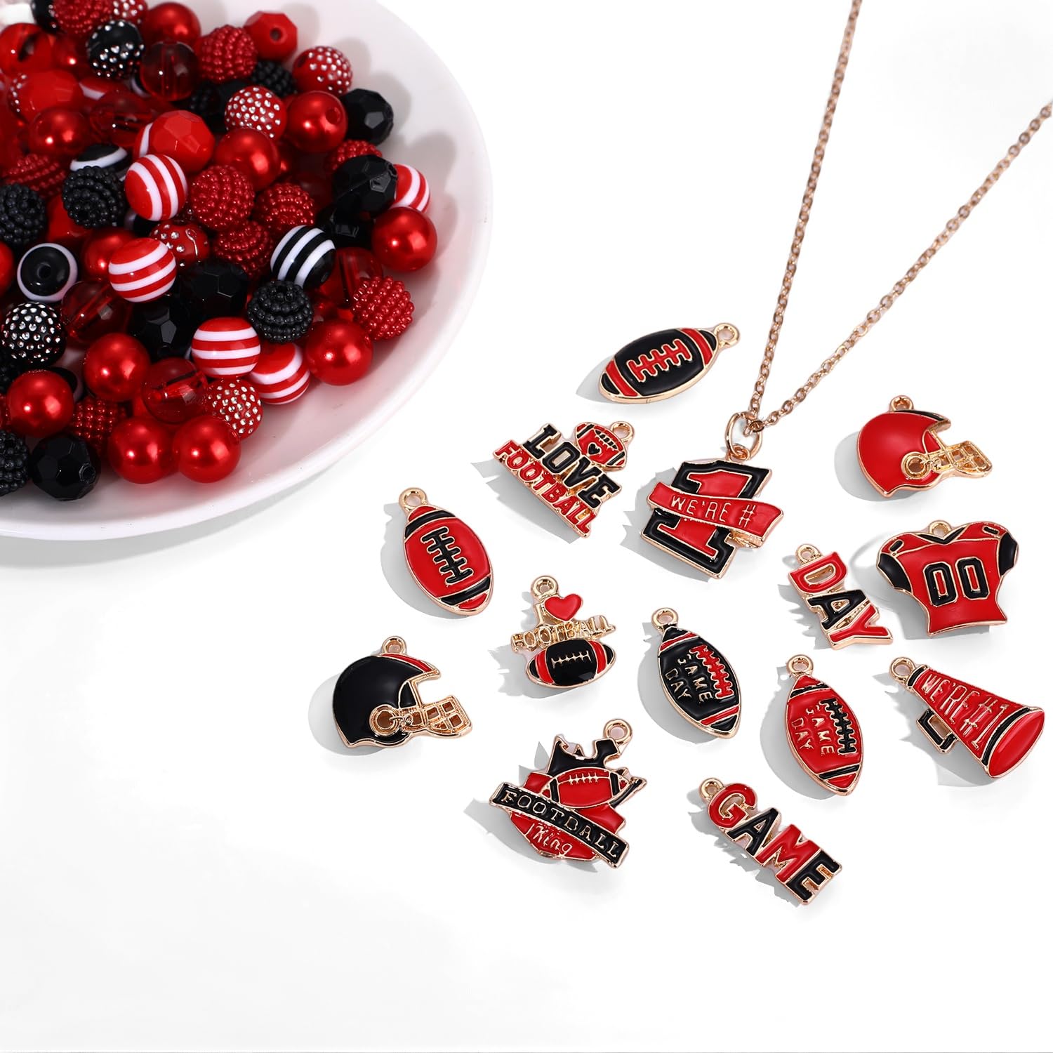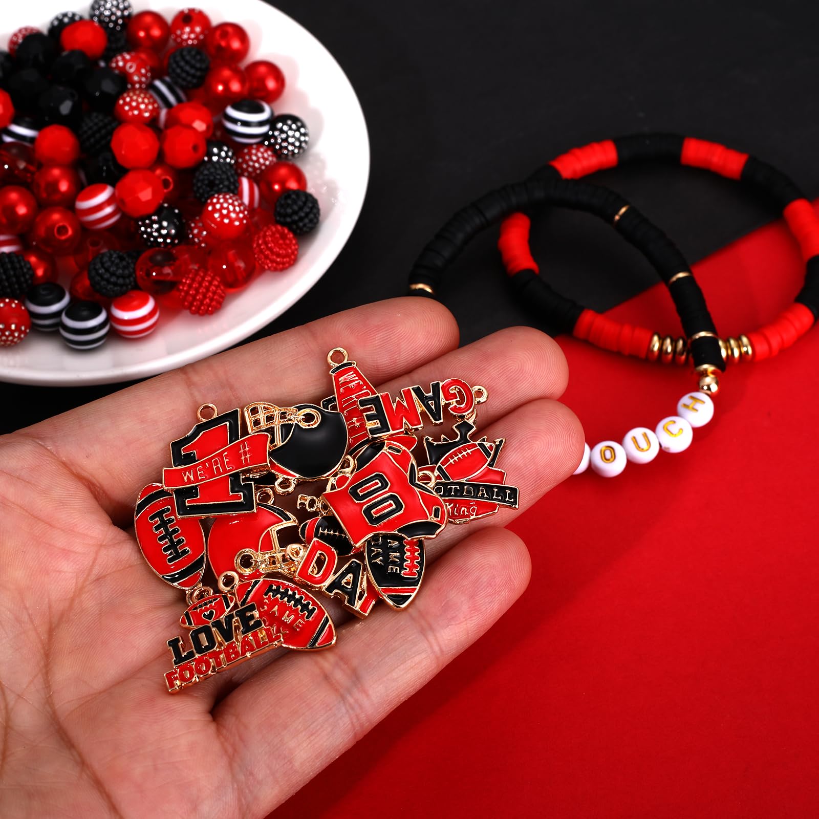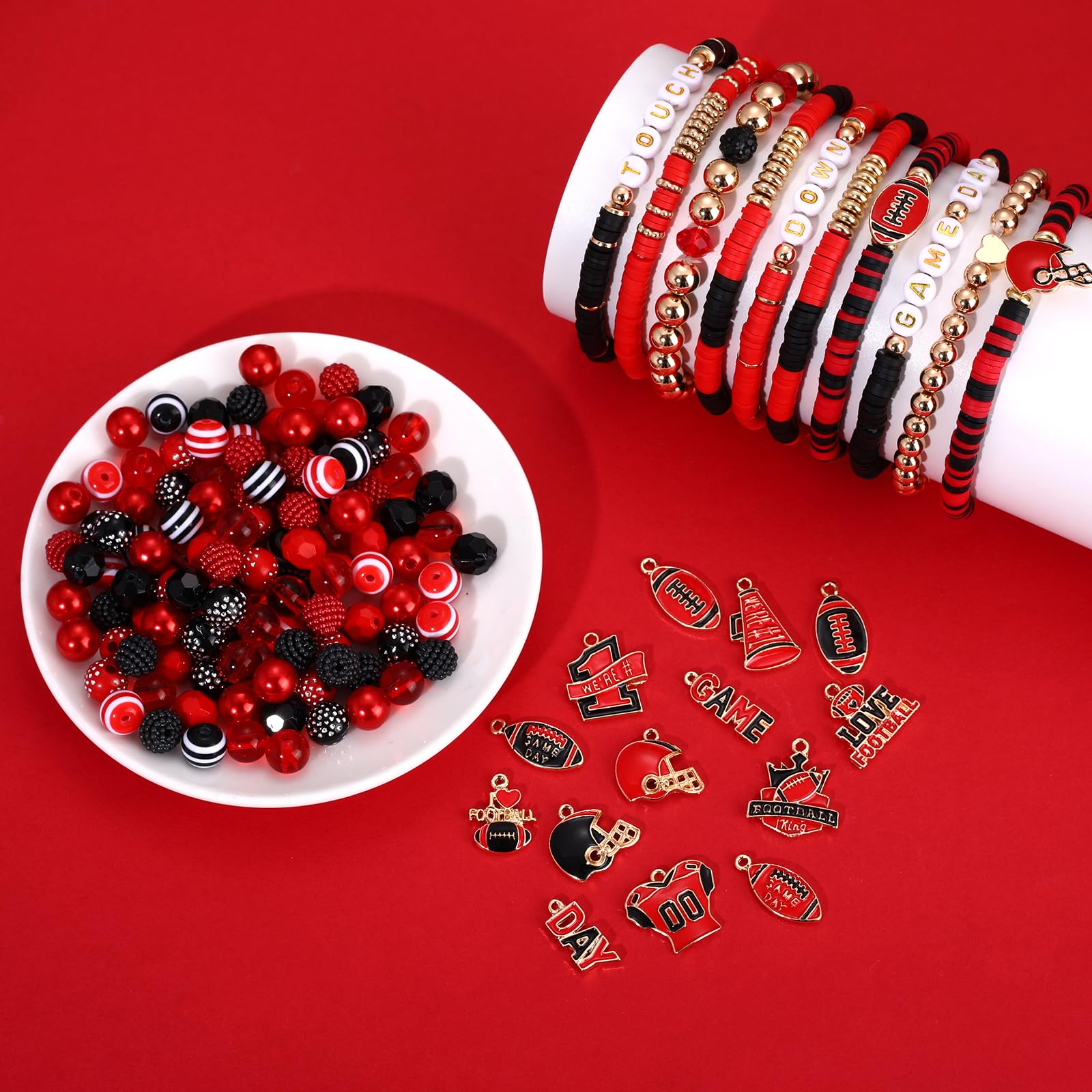 ♥ Game Day Bracelet Making Kit -- You will receive more than 2200pcs game day beads charms for jewelry making. Including 960PCS red black heishi beads, 400PCS tiny rice beads, 100pcs letter beads, 80pcs crystal beads in 4 style, 20pcs pearl beads, 100pcs acrylic beads, 20pcs acrylic heart beads, 40pcs star beads, 20pcs striped beads, 50pcs rhinestone beads, 20pcs clay charm beads, 100pcs heart beads, 320pcs gold space beads in 6 style, 30pcs gold ball beads. And 14pcs enamel football charms