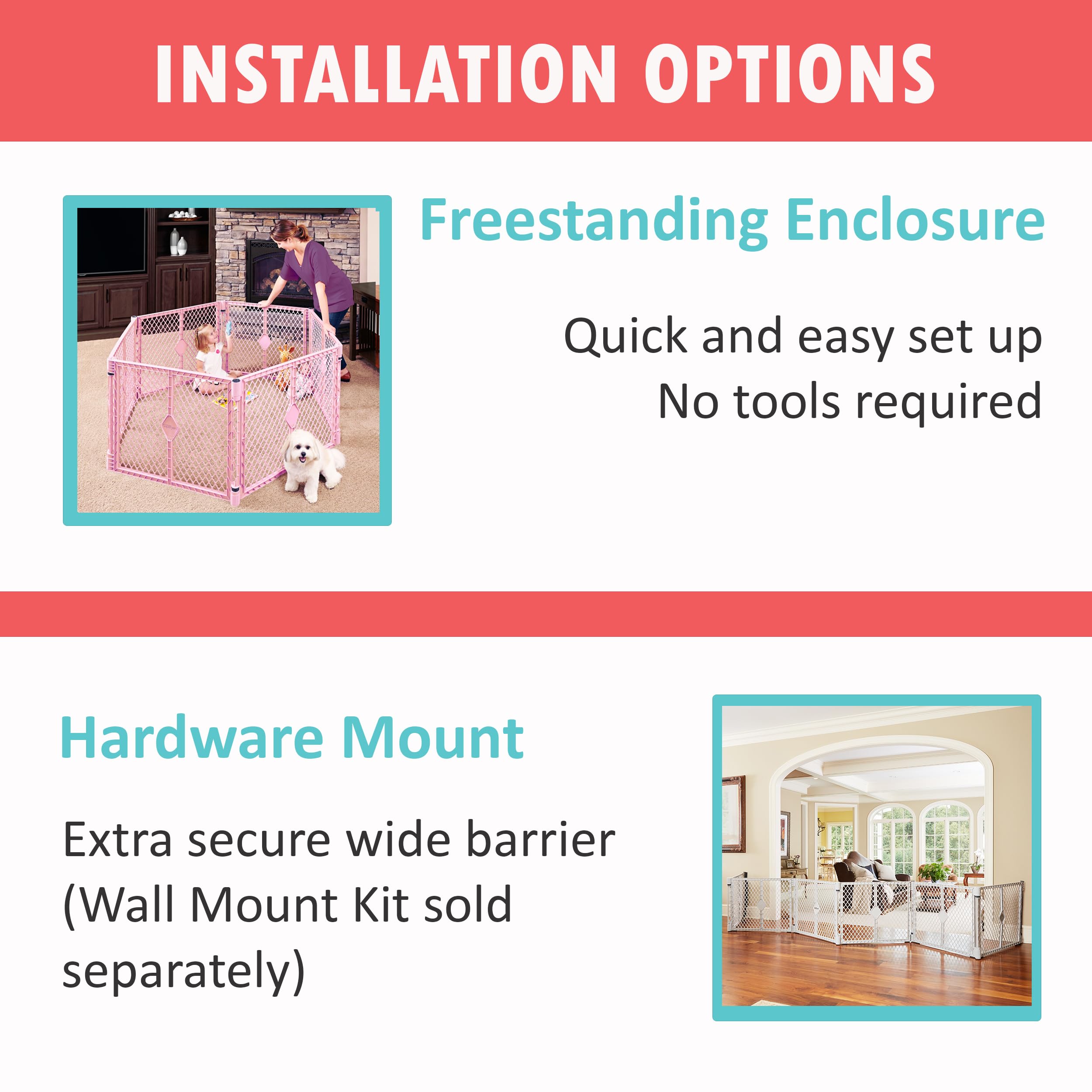 EASY TO USE - The baby fence has self-locking hinges that only bend in one direction. The clicking noise ensures the hinges are locked. Use our Superyard Wall Mount Kit (sold separately) to convert the play yard into an extra-wide baby gate.