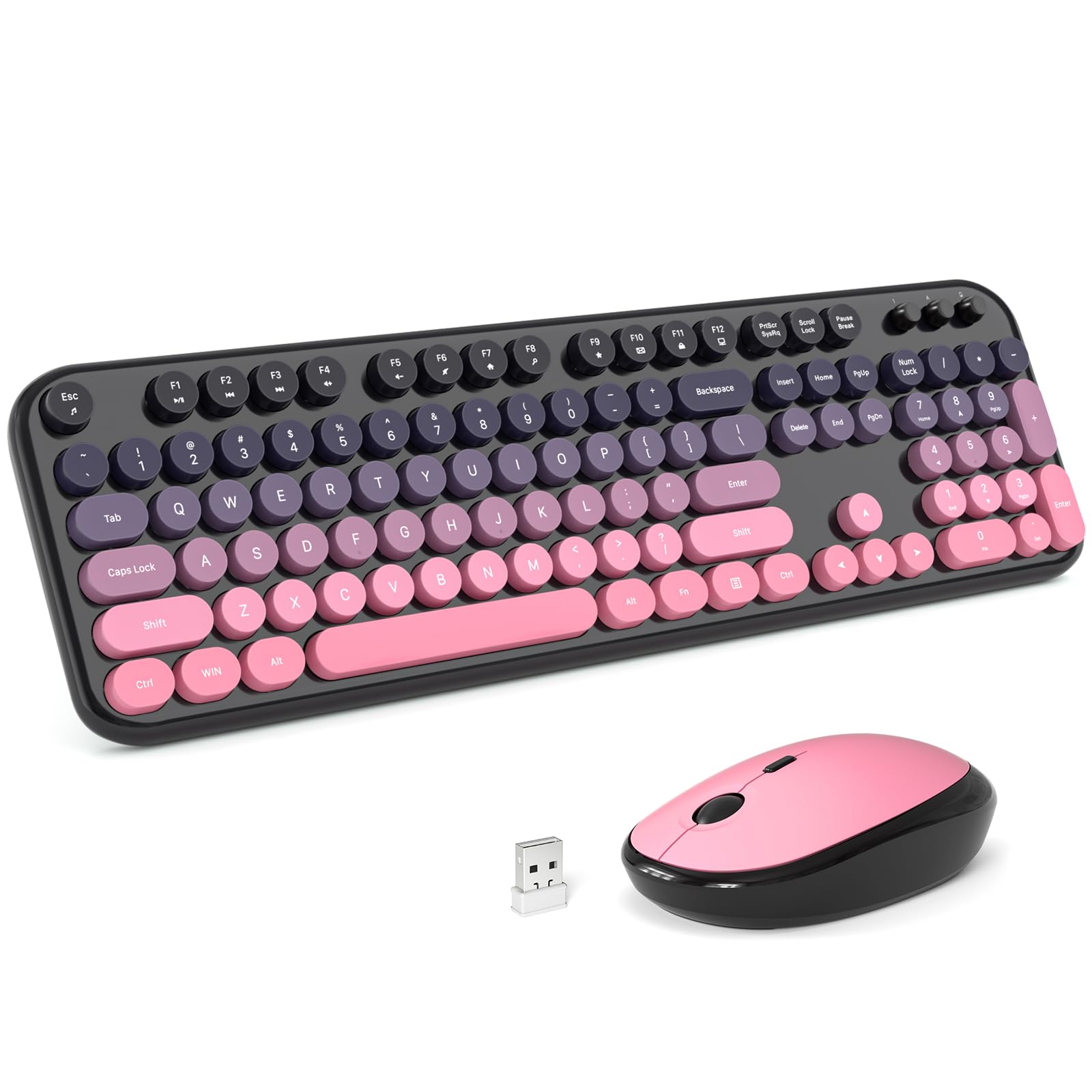 Fashion Multi-color Wireless keyboard and Mouse Combo- Enjoy Wireless Freedom. Stable wireless connection 2.4G wireless Keyboard and Mouse provides a powerful and reliable connection up to 10m(35 feet) no any delays. This wireless keyboard adopts a mixed-color design, using Laser printing, the letters on the keycaps will not easily blur or fall off. All 104 Keys non-conflict. Specifications: Transmission distance: 10m/35ft Package Included: Wireless Keyboard x 1 Wireless Mouse x 1 USB Nano receiver x1 User manual x 1