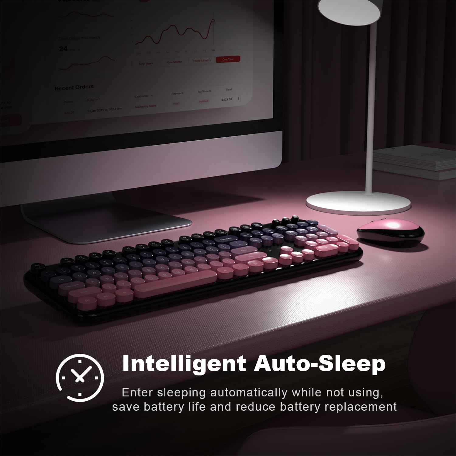 【Automatic Power Saving Functionmode】If you don't use the keyboard for more than a minute, the keyboard will auto-enter the sleep mode to save power, which greatly prolongs the battery life, Click any key or button to wakes up within 2 seconds, If one day the keyboard suddenly does not work, please replace the battery and try to use it, when the battery is dying, the low battery indicator on the keyboard will remind you to replace the battery.
