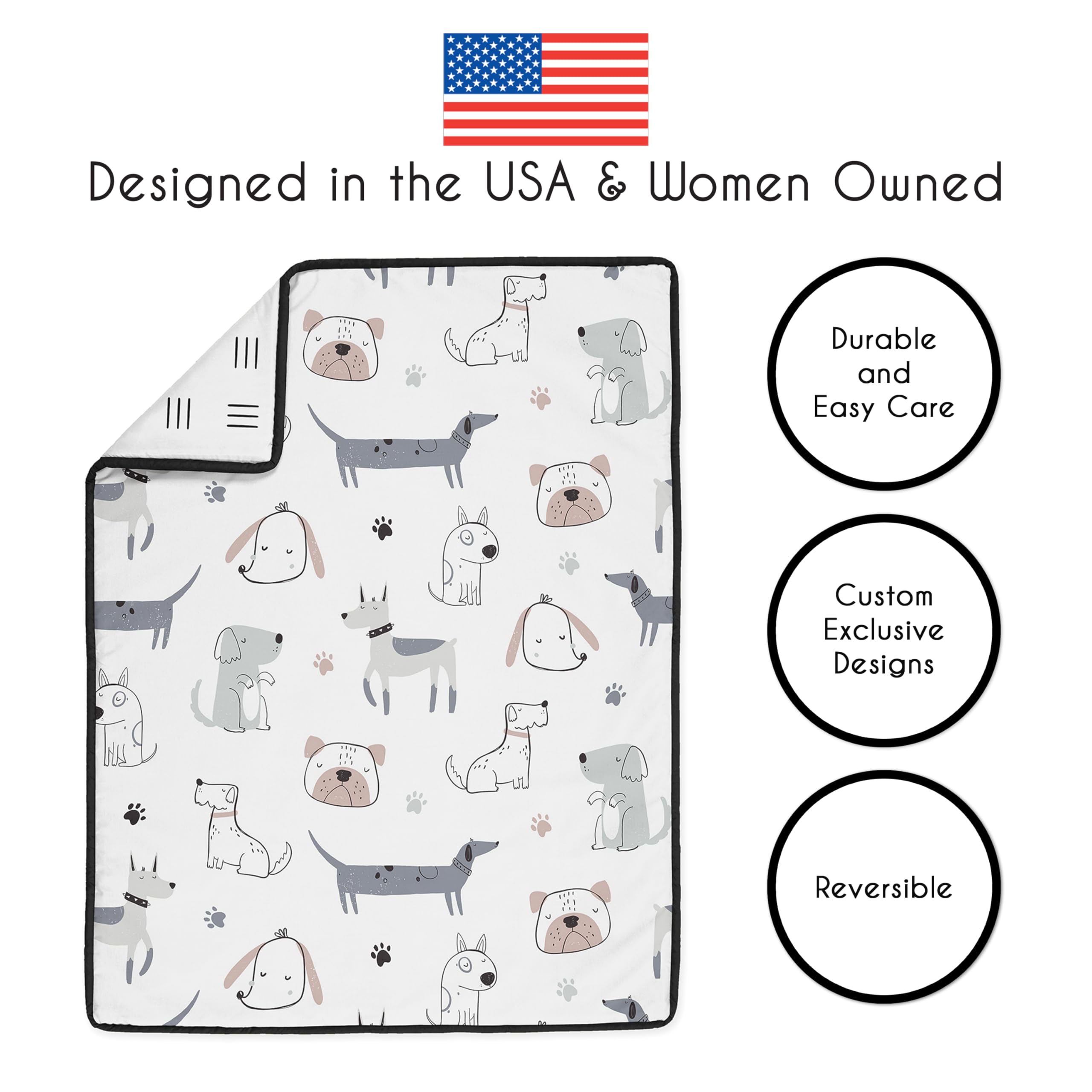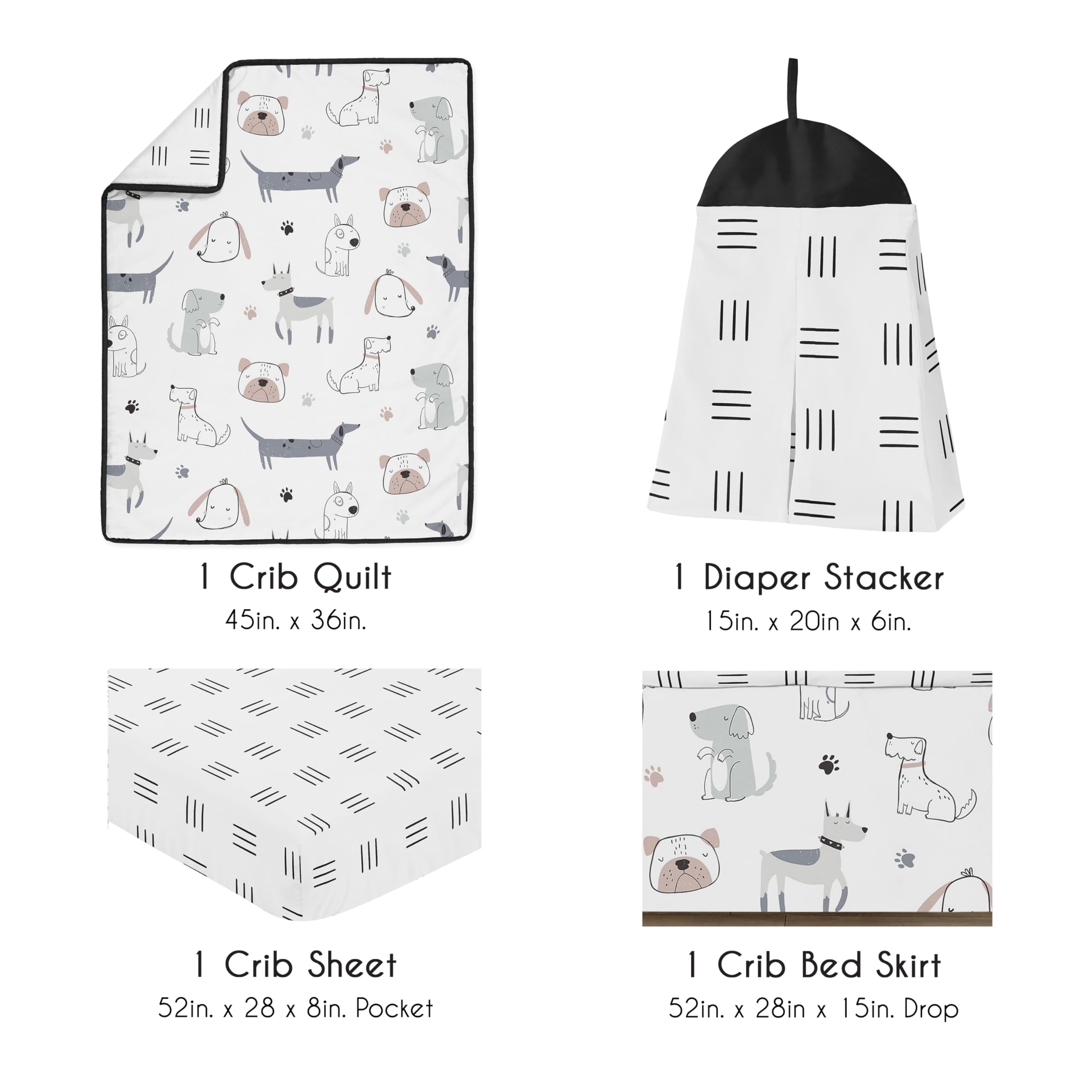 CARTOON DOGS THEME: This baby boy bedding set boasts a gender neutral crib blanket featuring adorable whimsical dog illustrations pups in various breeds such as pugs, bull dogs, & dachshunds & reverses to a black & white hatch print. The classic skirt is adorned with the same dog print. The hatch breathable crib sheet has elastic sewn around the bottom edge for a secure fit on most standard cribs. The matching diaper stacker keeps nappies conveniently organized. Machine washable. Tumble dry low.