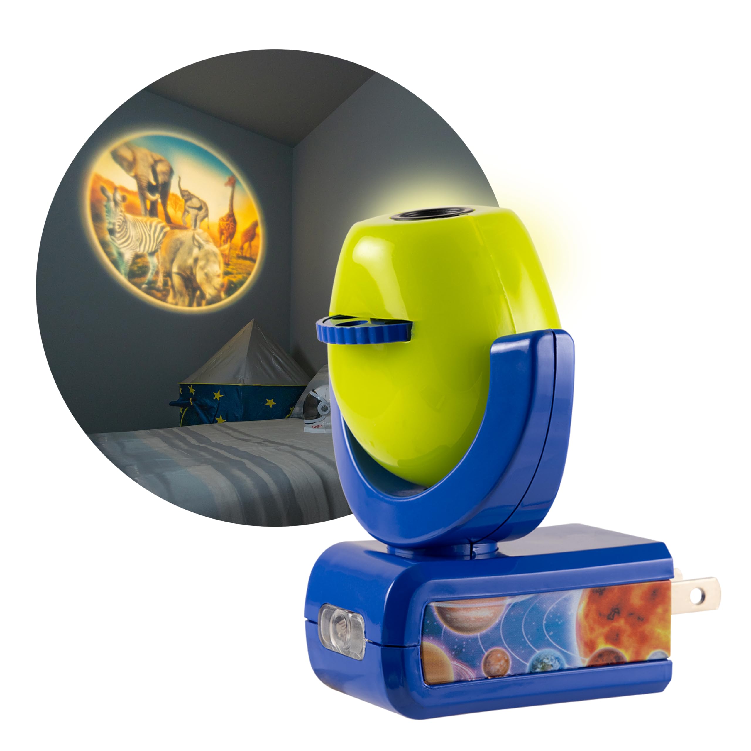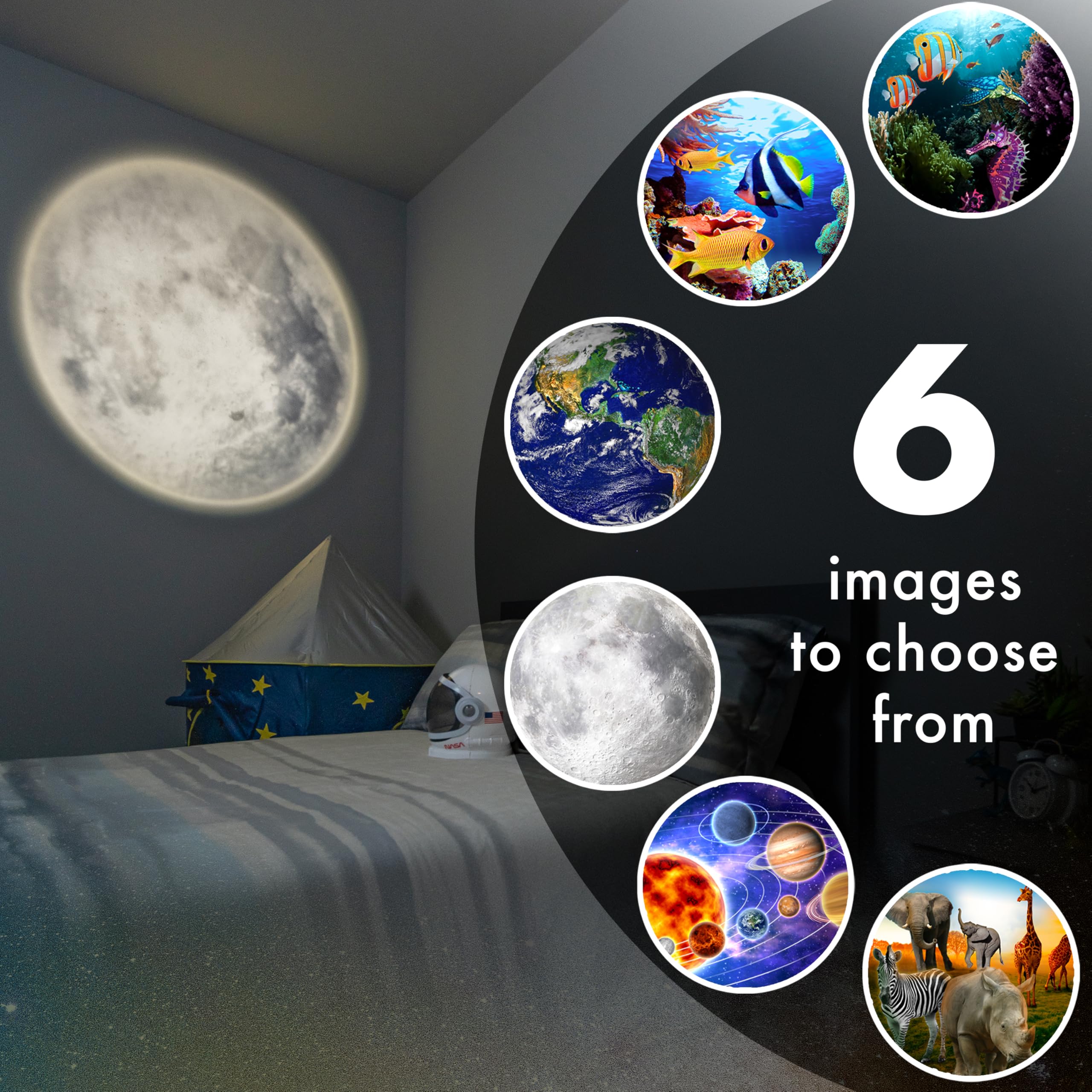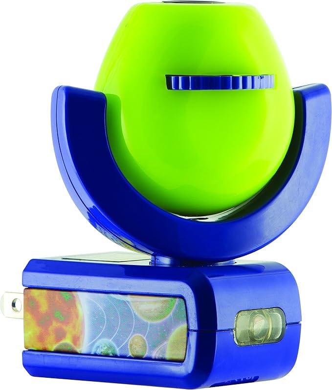 Provides soft green glow while projecting adventurous images featuring the Solar System, Planet Earth, Moon, Safari, Aquarium, and Coral Reef on ceiling, wall, or floor