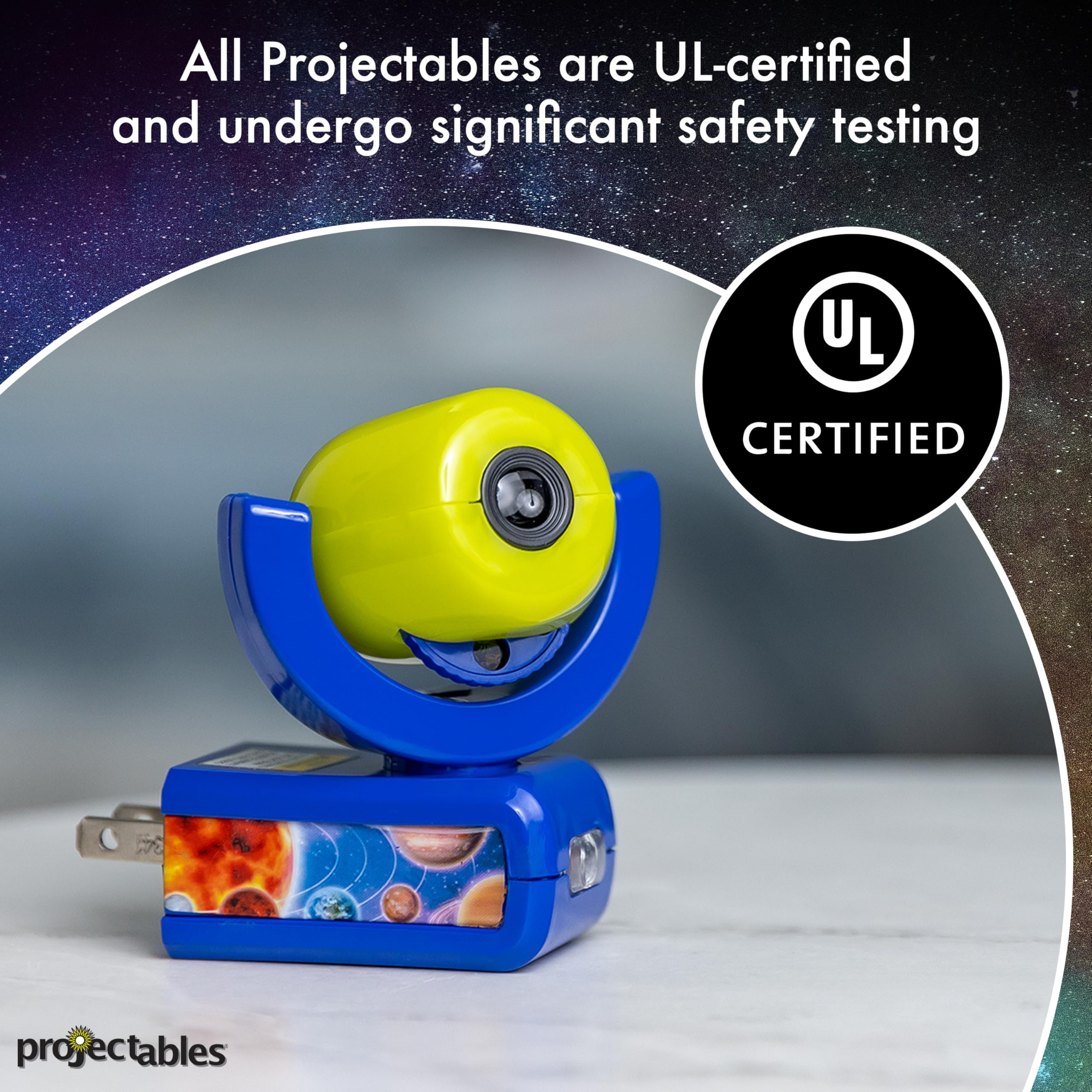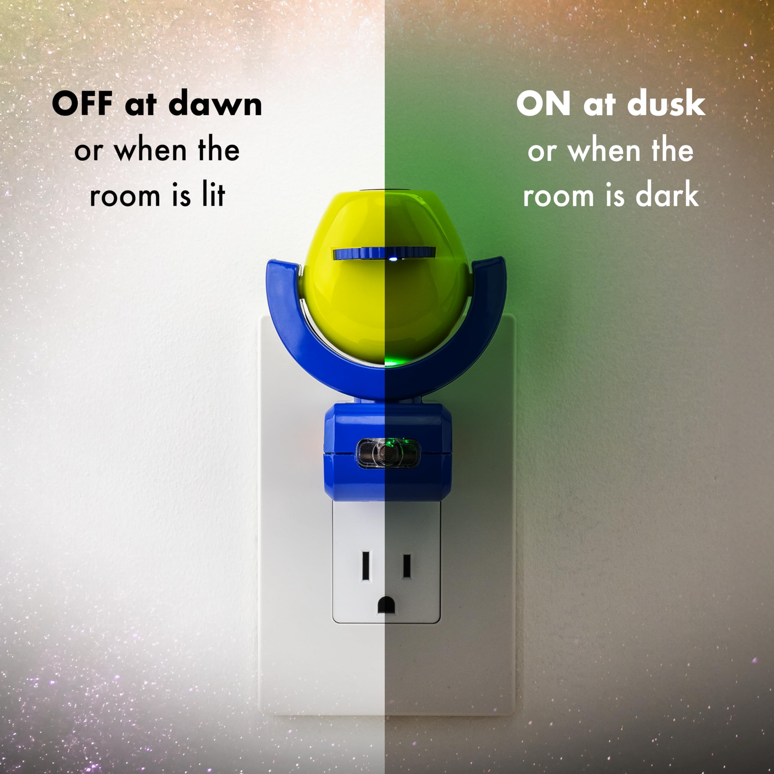 Bring your night to life with the Projectables LED Night Light! The Projectables LED Night Light provides a soothing guide light while projecting a colorful, 3-foot, outdoor fun image onto the wall or ceiling. Light-sensing technology means it's on at dusk and off at dawn. Long-life LEDs and cool-to-the-touch globes deliver peace of mind. Perfect for kids of all ages.