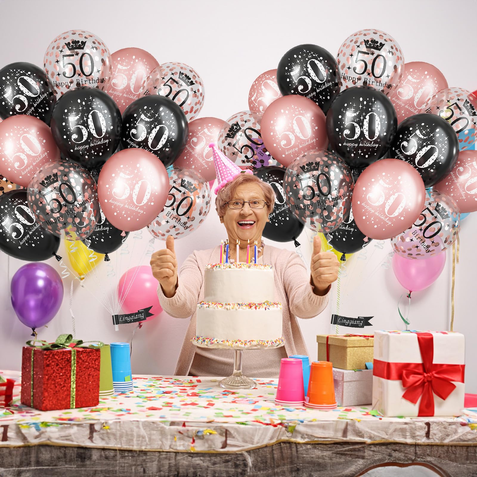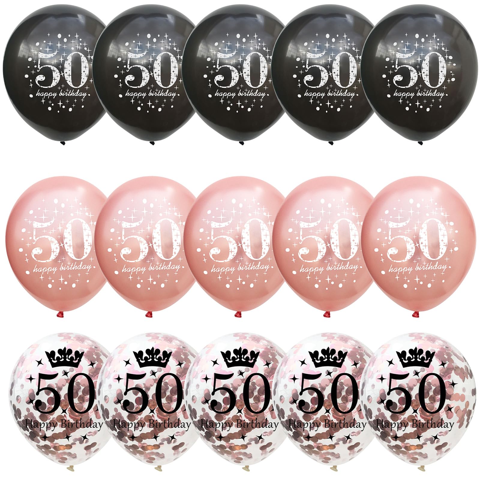 🎂 50th Birthday Balloons - You will get total 15 pieces 12 inch rose gold black happy 50th birthday latex balloons, inclulde 5 pcs rose gold print balloons, 5 pcs black print balloons, 5 pcs rose gold confetti print balloons, come with a balloon ribbon. Perfect for her women 50th birthday party decorations supplies.