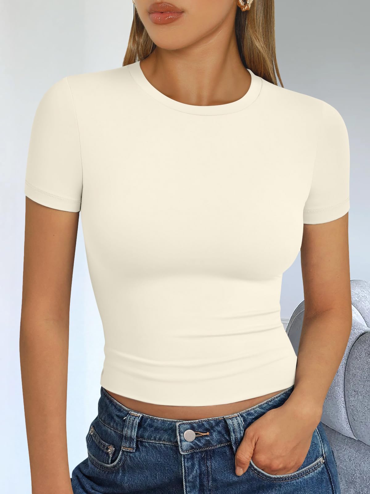 Design: Cropped and regular style,you can wear it regularly or fold it up like a crop top.cute,slim fitted,casual style,scoop neck,short sleeve