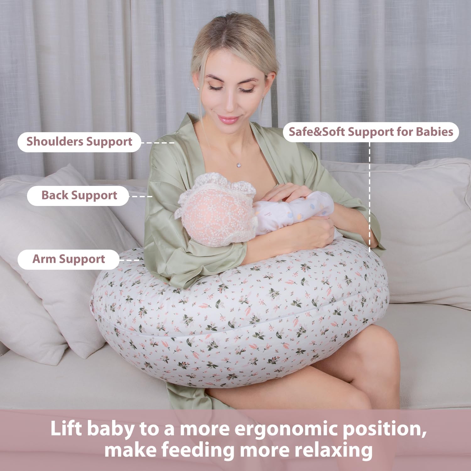 Removable & Machine Washable -- With its 100% cotton, removable and machine washable cover for easy maintenance, hidden zipper to prevent any contact with your baby's skin, and filling of premium polyester cotton which you can add or remove the filling as needed to find your ideal nursing height, it provides a plush yet supportive surface for both you and your infant.