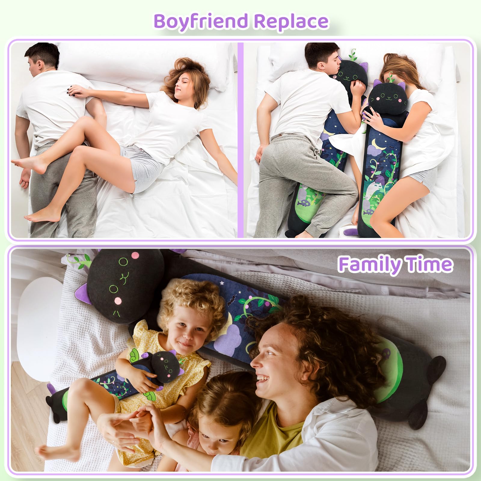 Cat Body Pillow Multipurpose: We provide you not only a multiple-size hugging pillow, but also the best lumbar body pillow when you sitting on a sofa, and also the most comfortable sleeping pillow for a sweet sleep on the bed.