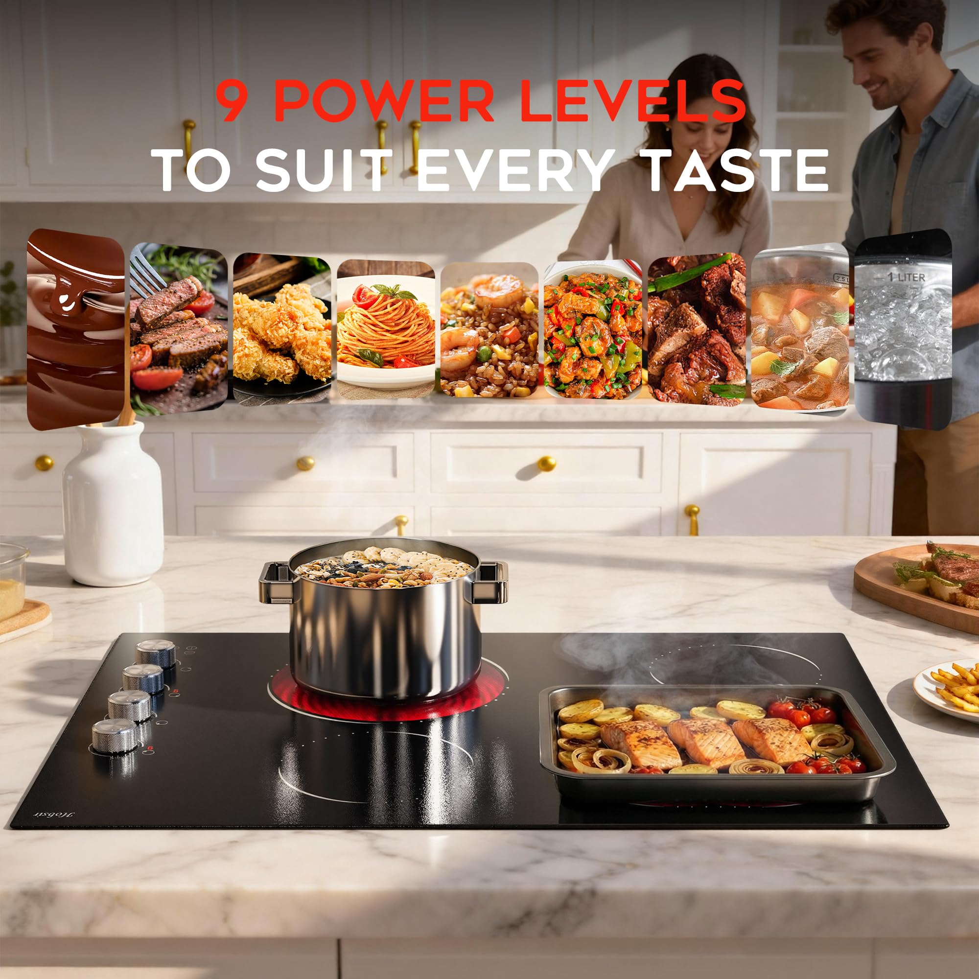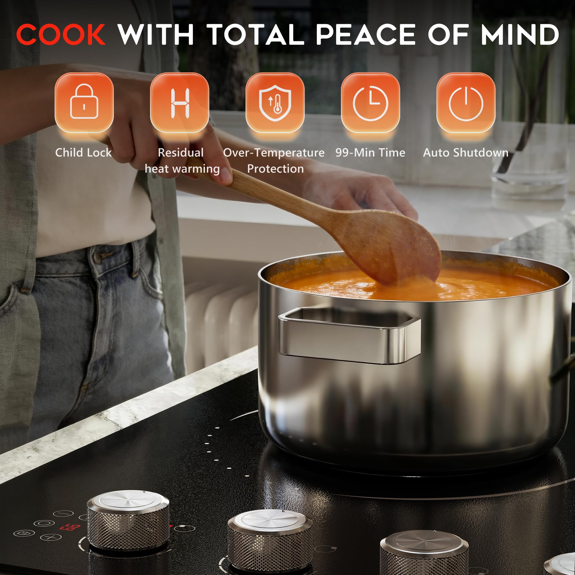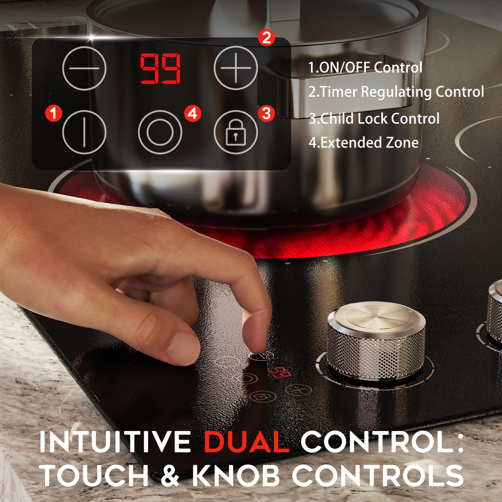 【Electric Cooktop: Dual Control & Safe Protection Design】Equipped with both knob and touch controls, this electric cooktop offers convenient operation: 9-level power adjustment via knobs, plus touch control for on/off, child safety lock and 99-minute timer. The electric stove top burner ensures safe cooking, preventing accidental activation and overheating, giving you peace of mind while preparing meals.