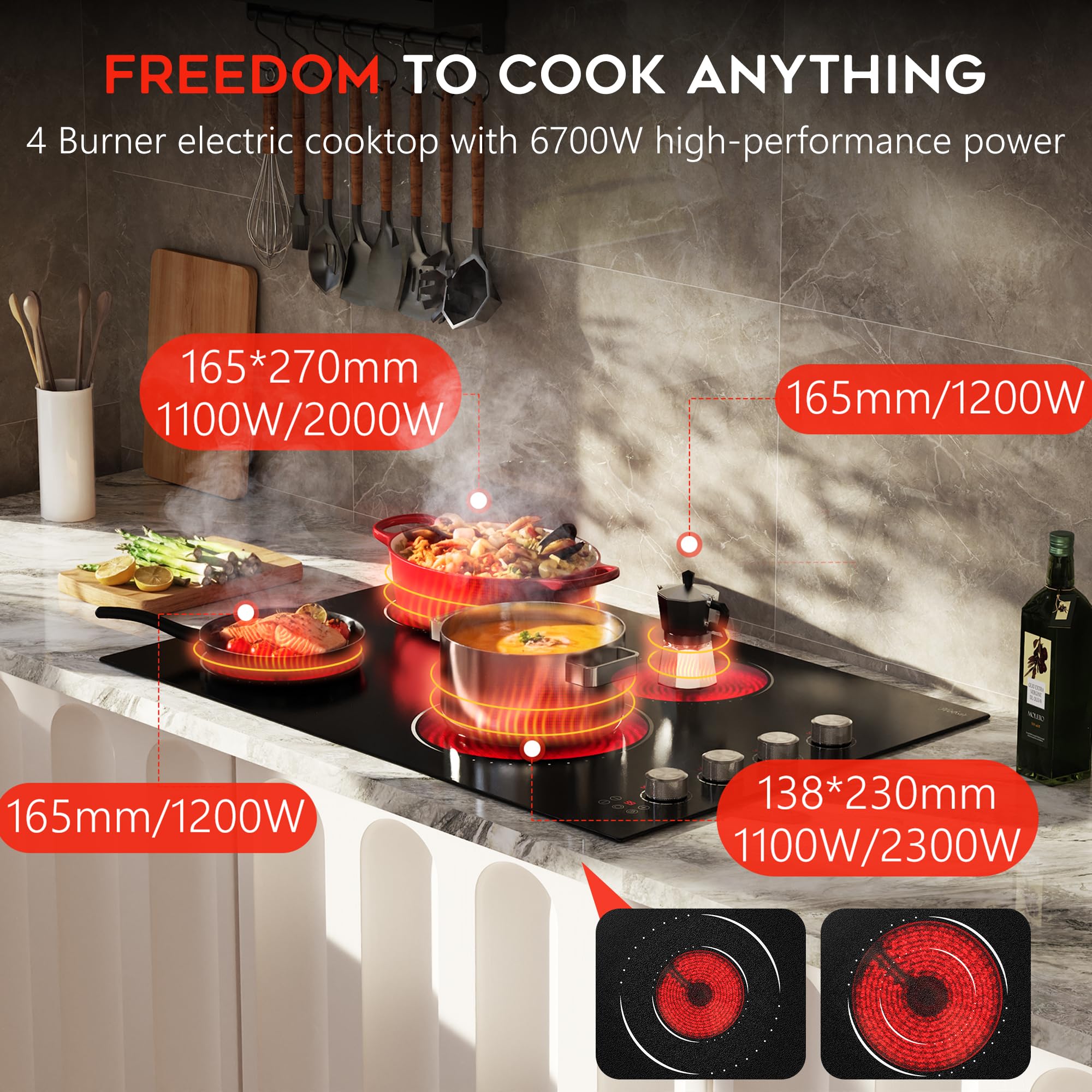 【4 Burner Electric Cooktop: Powerful 6700W Electric Stove Top】The 4 burner electric cooktop features a total power of 6700W, including 2*1200W burners, a special oval burner (1100W/2000W) and a dual-ring burner (1100W/2300W). This electric stove top provides instant heat for boiling, frying, simmering and more, allowing you to cook multiple dishes at once—ideal for family dinners or gatherings.
