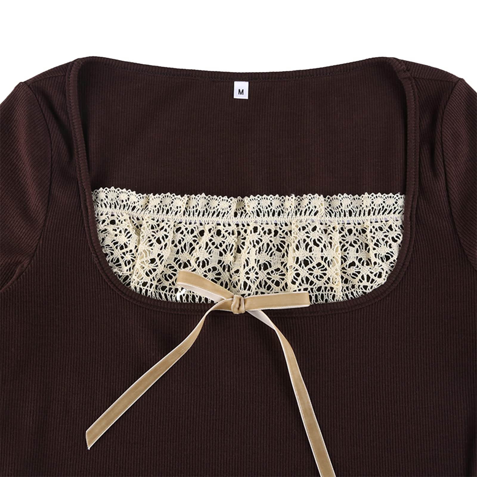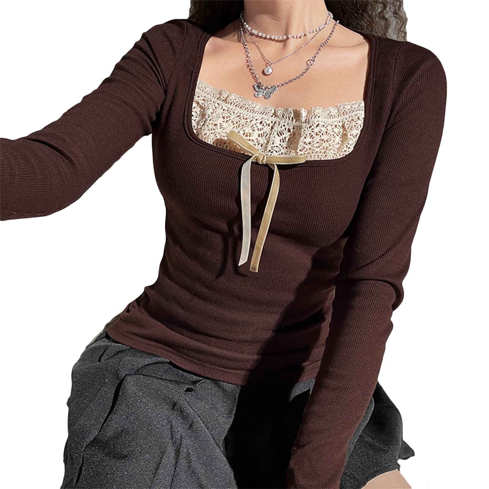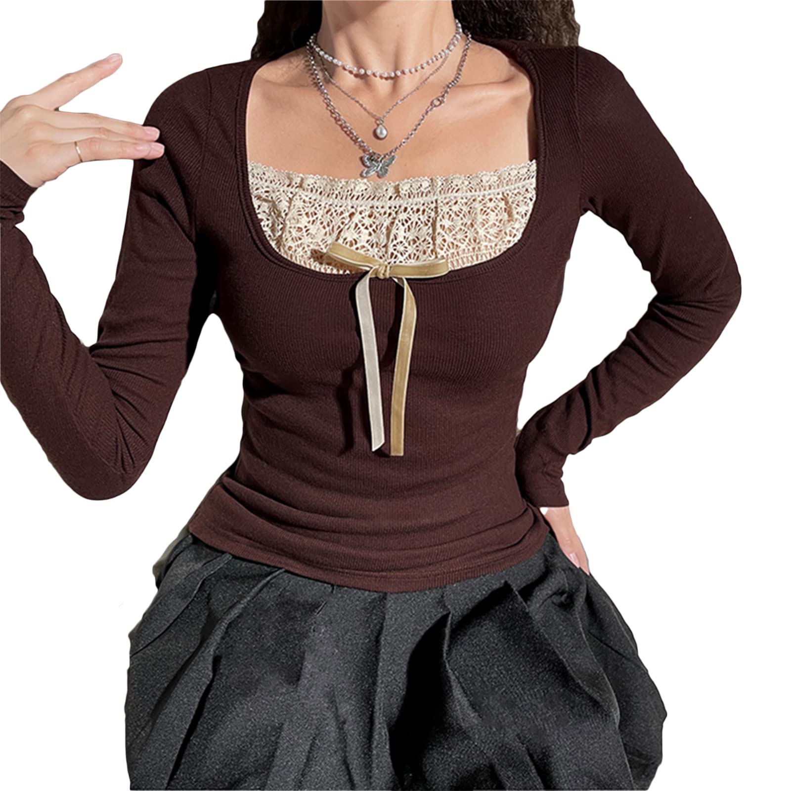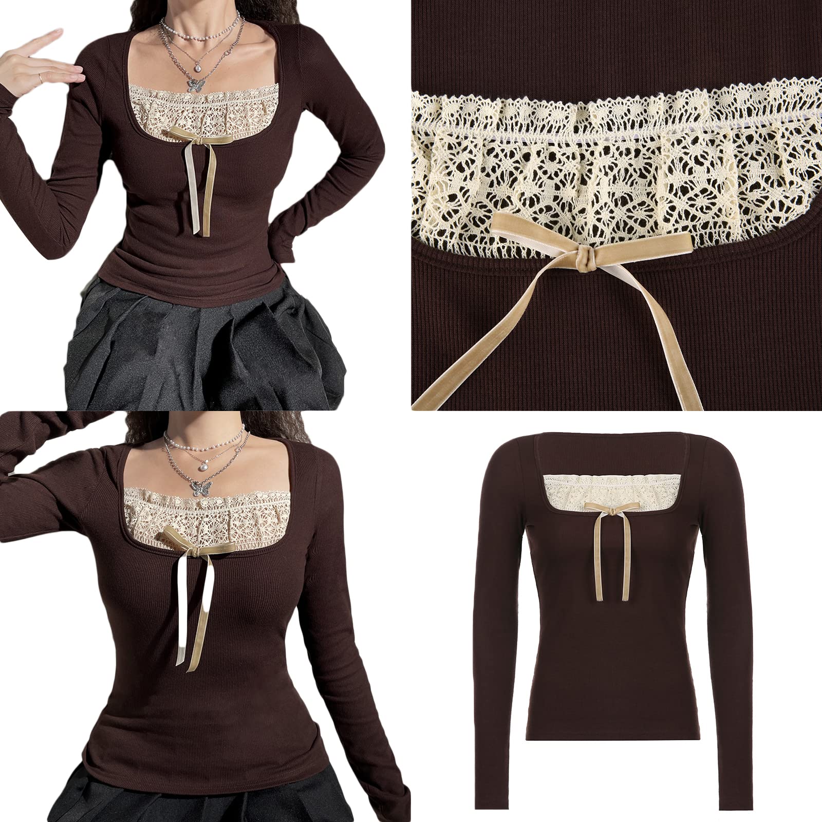 FEATURES: Women y2k tops fairy grunge shirts, long sleeve, solid color, lace trimmed square collar, ribbed knit, lace patchwork, slim fit blouse tops, tight shirts for women, ribbed y2k tops, y2k goth aesthetic clothing, trendy teens 90s egirl Harajuku gothic clothes fall streetwear.