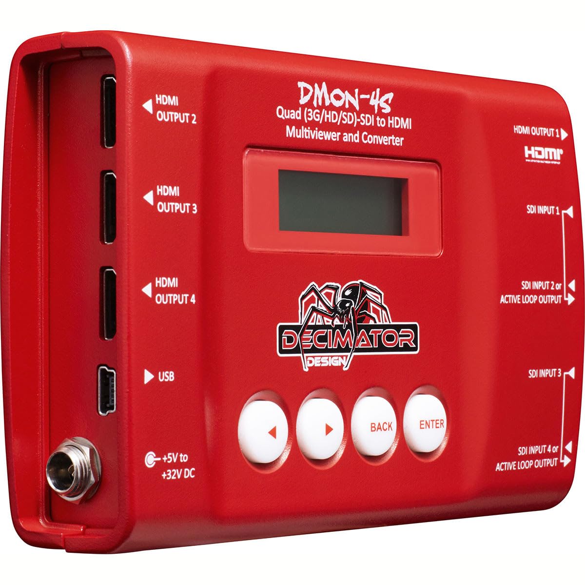 It is with great precision and professional-grade technology that the DMON-4S Quad (3G/HD/SD)-SDI to HDMI Multiviewer and Converter stands out in the realm of video conversion. This innovative device is engineered by Decimator Design, a brand synonymous with high-quality video equipment, ensuring a sophisticated and reliable solution for video professionals.The DMON-4S is not just a converter; it's a versatile tool that offers unparalleled flexibility for various video applications. With four independent SDI inputs and four independent HDMI outputs, users can effortlessly configure the device as a Quad Split for SDI to HDMI conversion, a straightforward SDI to HDMI converter, or even as a 1 to 4 distribution amplifier. This multifunctionality makes it an advanced and cost-effective addition to any production setup.The user-friendly interface, featuring an intuitive LCD and button control system, eliminates the need for complex LED/button configurations, dip switches, or the necessity of a computer for simple setting adjustments. This high-tech design simplifies on-the-fly changes, making it a breeze for users to access the device's full range of features.The DMON-4S's independent I/Os allow for a myriad of configurations, including but not limited to: four independent SDI inputs to an HDMI Quad-Split output, four separate SDI to HDMI converters, three SDI to HDMI converters with a Quad-Split output, two SDI to HDMI converters with loop-through, and one