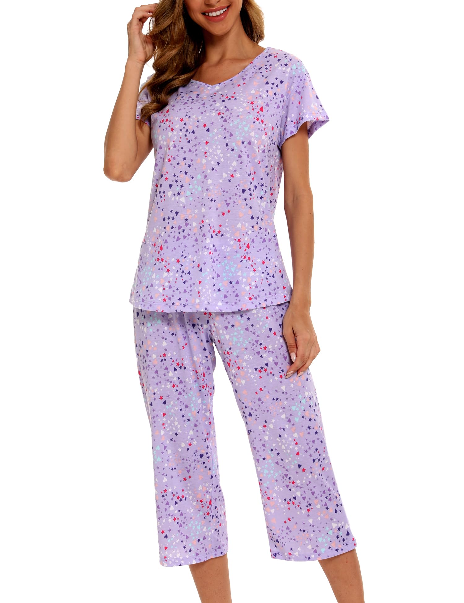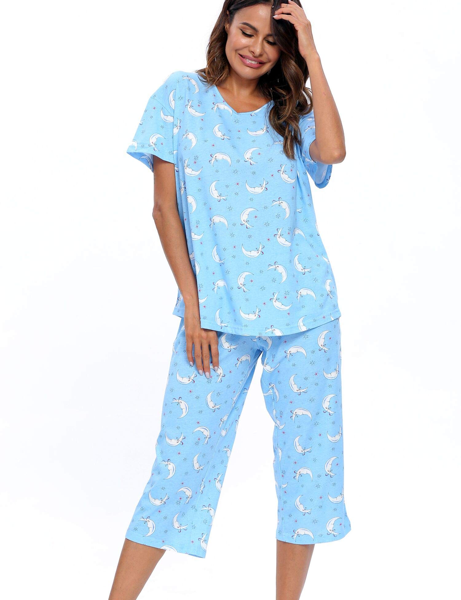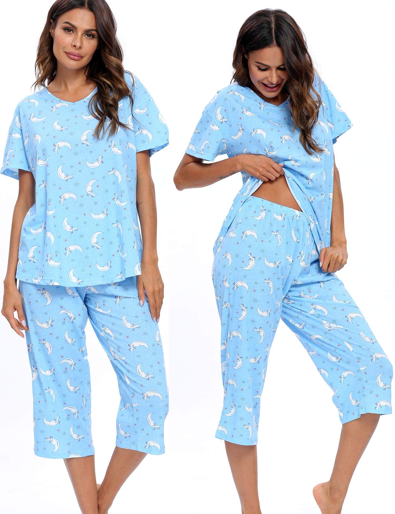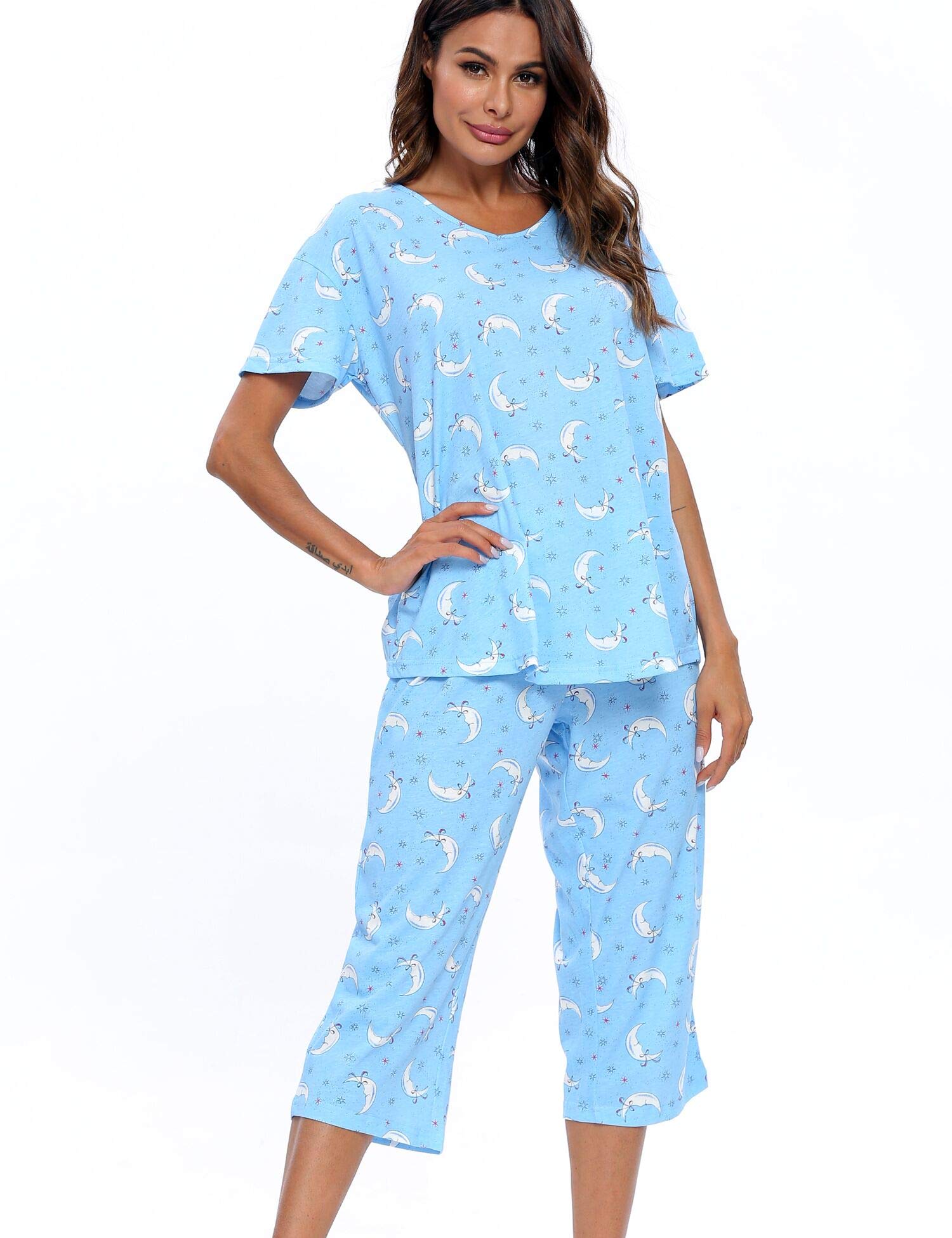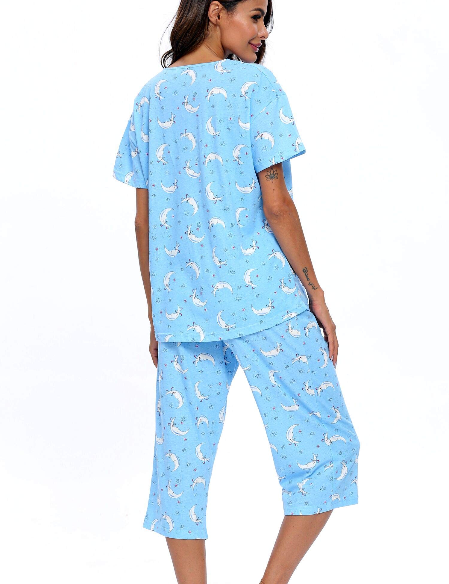 Design Features: Womens tow-piece pajamas set, Comfortable elastic waist capri pants, matching with V-neck short sleeve shirt (Part Round Neck),Beautiful prints and cute animal prints make these nightwear set cute and stylish.It is the perfect choice for home leisure.