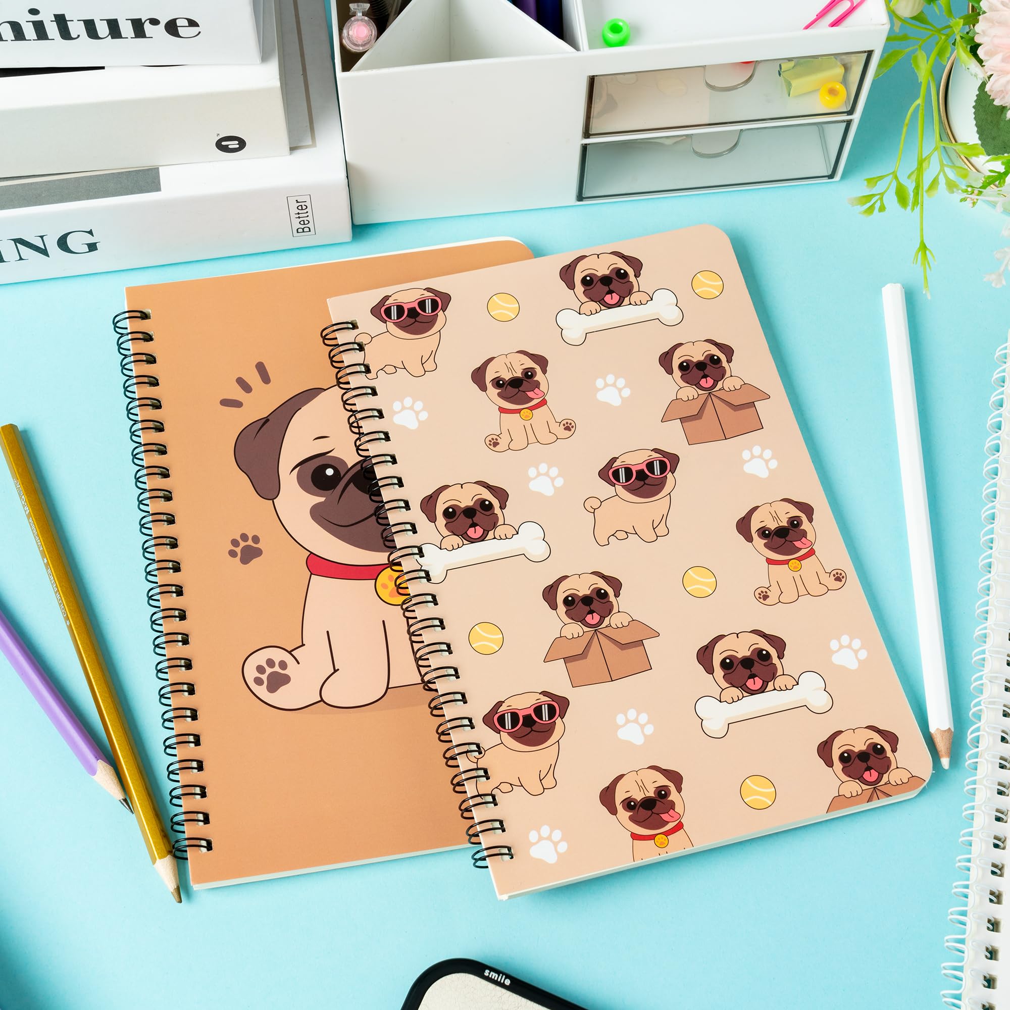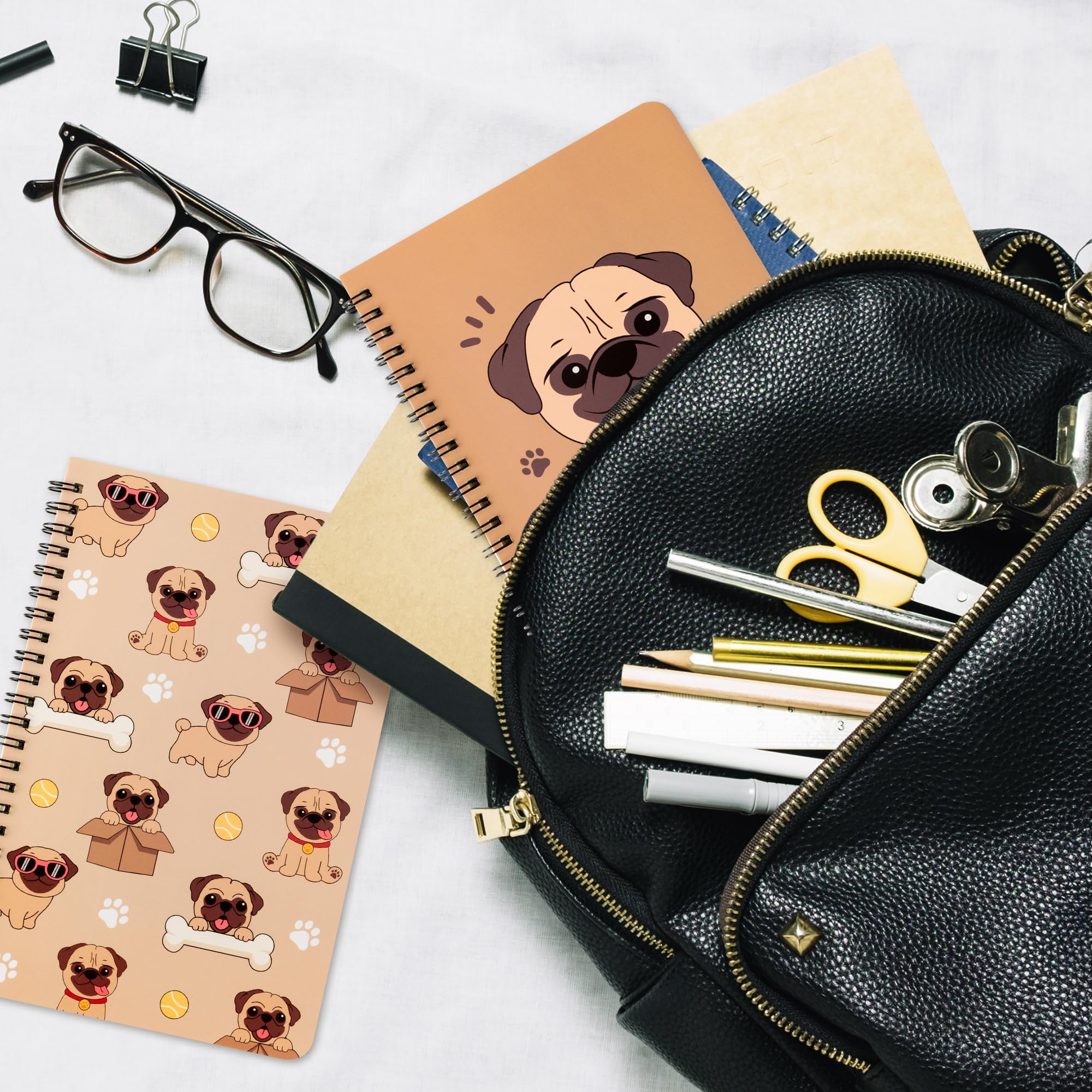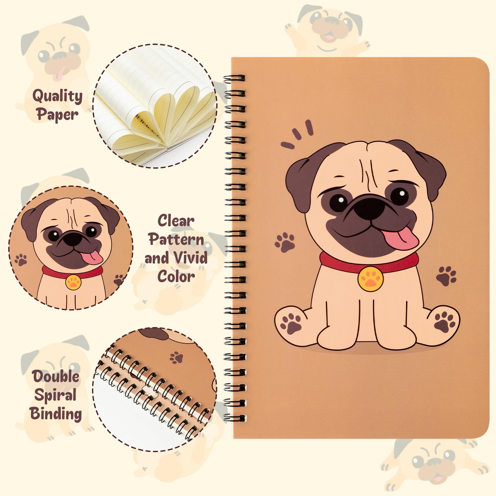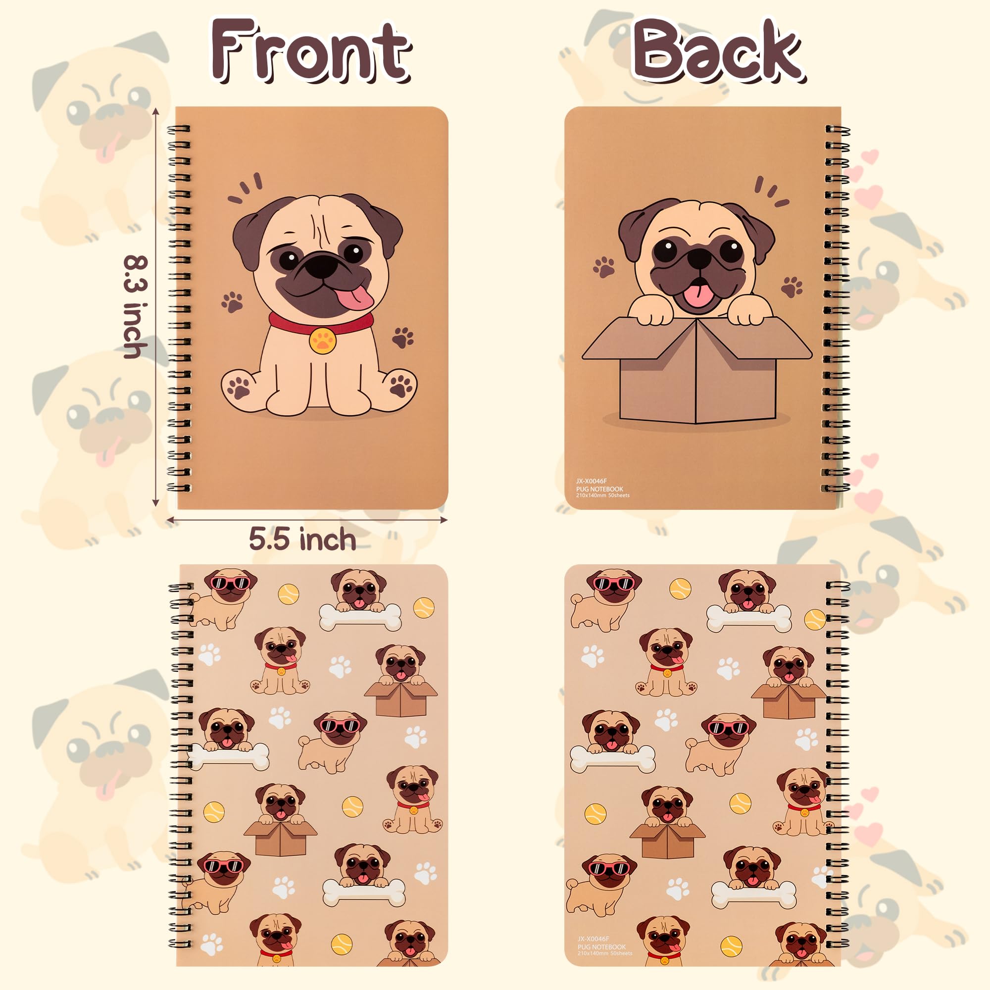 Pug Themed Spiral Notebook: You will get 2 pack pug themed spiral notebooks in different designs, and the notebook is 50 sheets and 8.3 x 5.5 inches. The cover designed with cute cartoon pug pattern, which is visually appealing notebooks