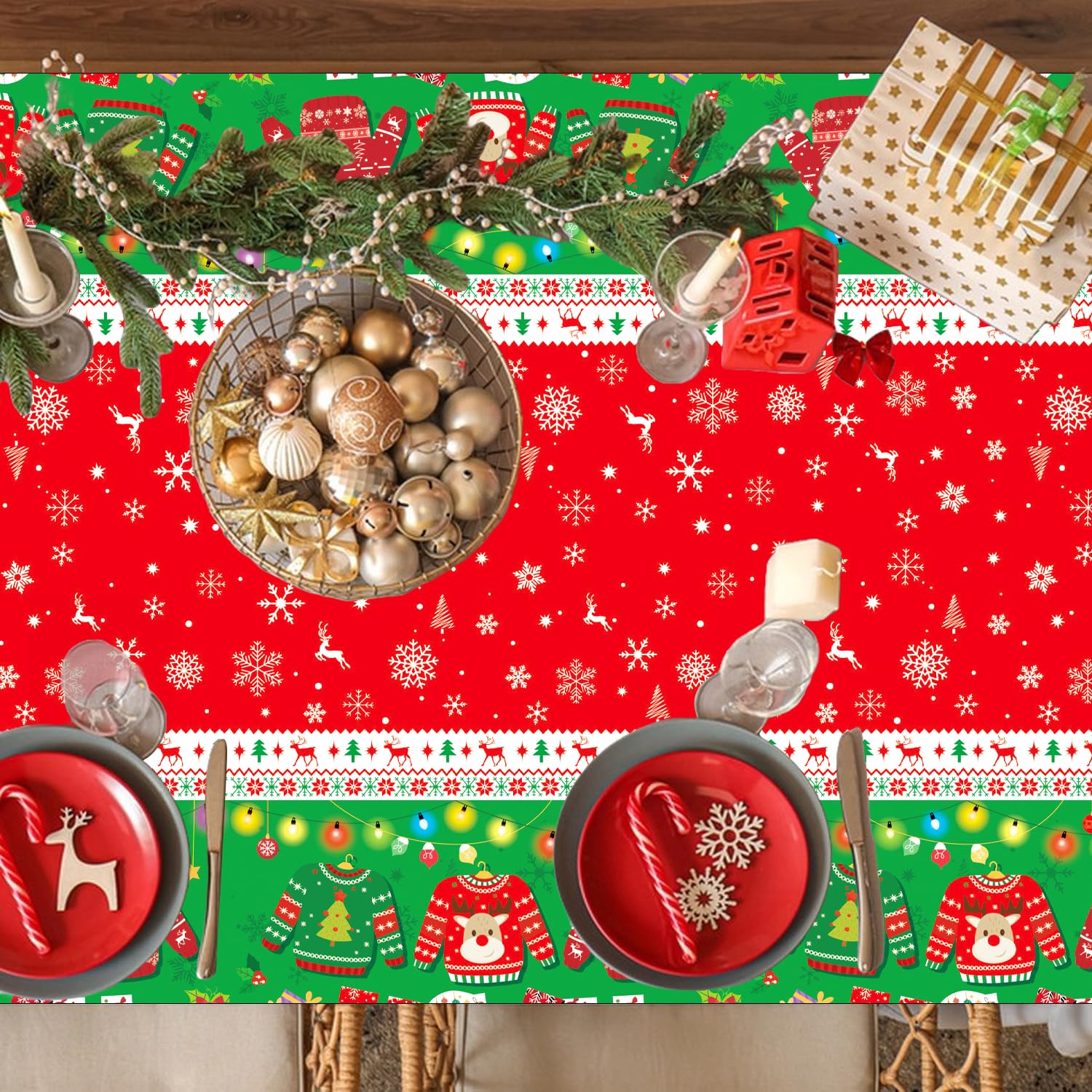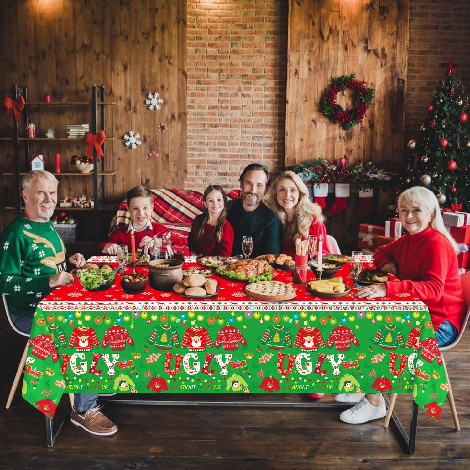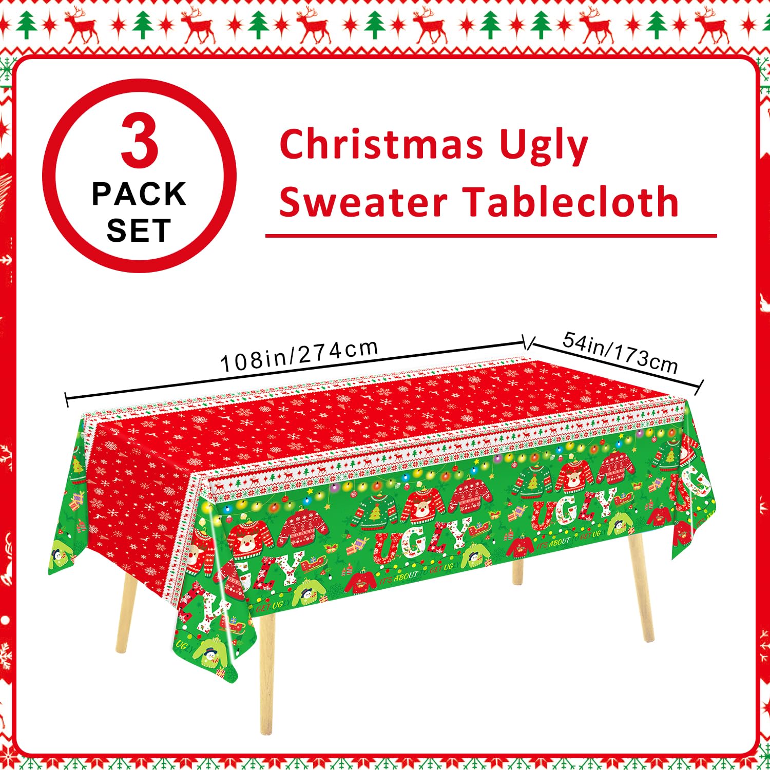 FESTIVE UGLY SWEATER DESIGN: This Christmas tablecloth features a fun and vibrant "Ugly Christmas Sweater" theme, with colorful sweaters, holiday decorations, and bold lettering. It's the perfect addition to your Ugly Sweater party or any holiday celebration. Decorating your party with these Christmas party tablecloths would be a great choice