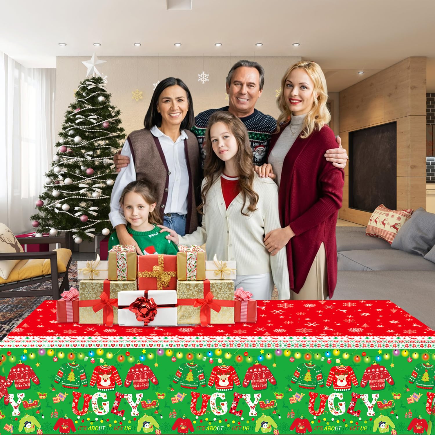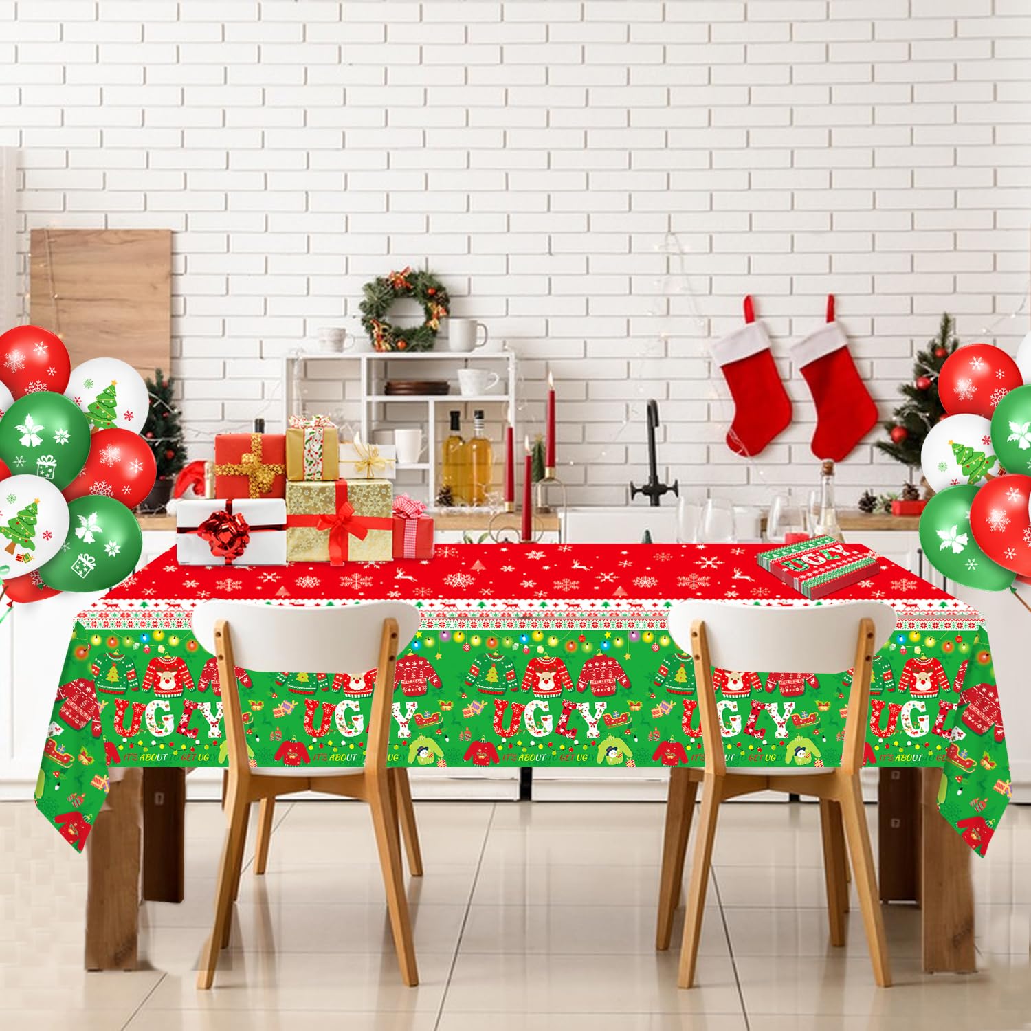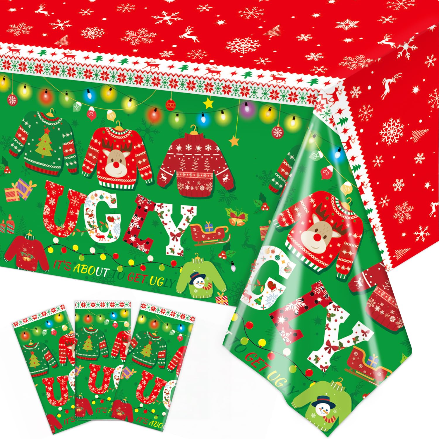 FESTIVE UGLY SWEATER DESIGN: This Christmas tablecloth features a fun and vibrant "Ugly Christmas Sweater" theme, with colorful sweaters, holiday decorations, and bold lettering. It's the perfect addition to your Ugly Sweater party or any holiday celebration. Decorating your party with these Christmas party tablecloths would be a great choice