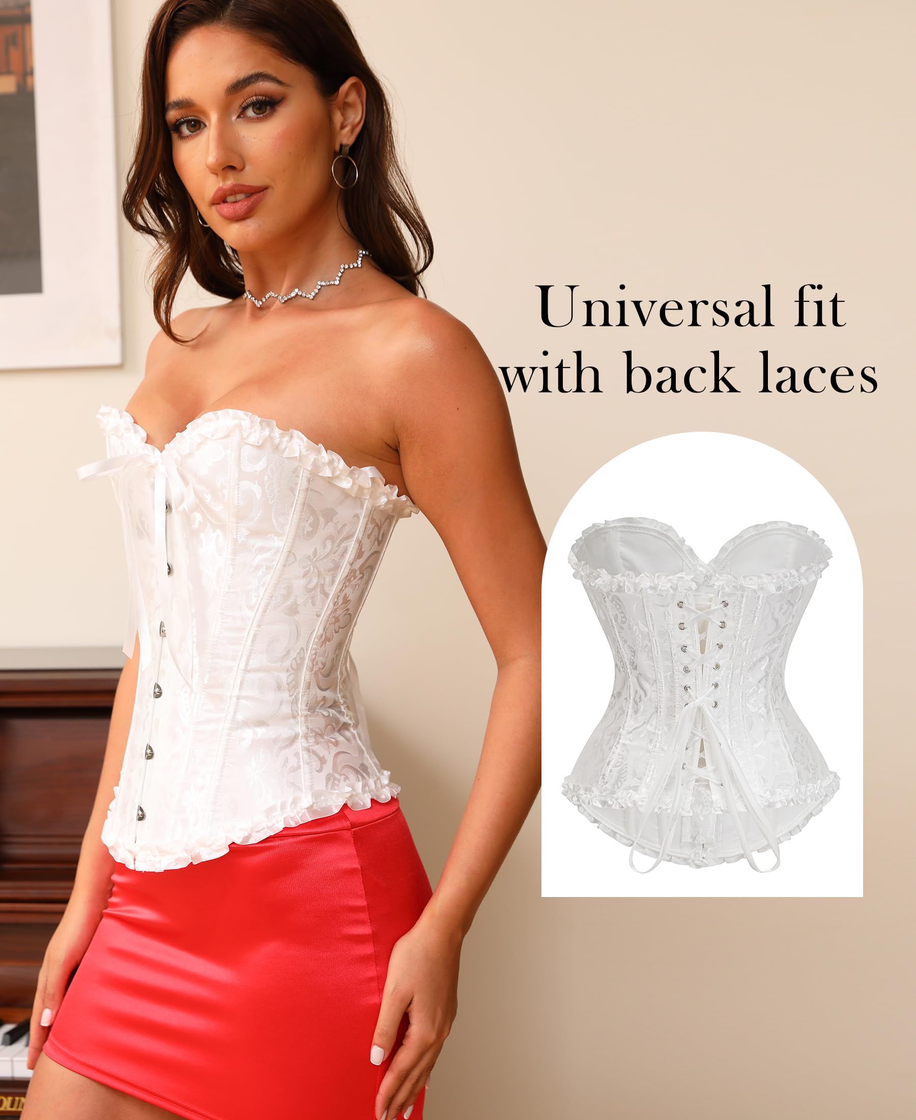 ALL DAY COMFORT: Our overbust corset top is a harmonious blend of comfort and elegance, made with materials that caress your form while ensuring freedom of movement. The waist corset unique 12 plastic bone structure is engineered to support an upright posture, reducing back strain. Designed for wearability from dawn until dusk, the waist cincher corset is the ideal everyday companion. Our lace corset top aligns with your body's needs and your heart's desires.
