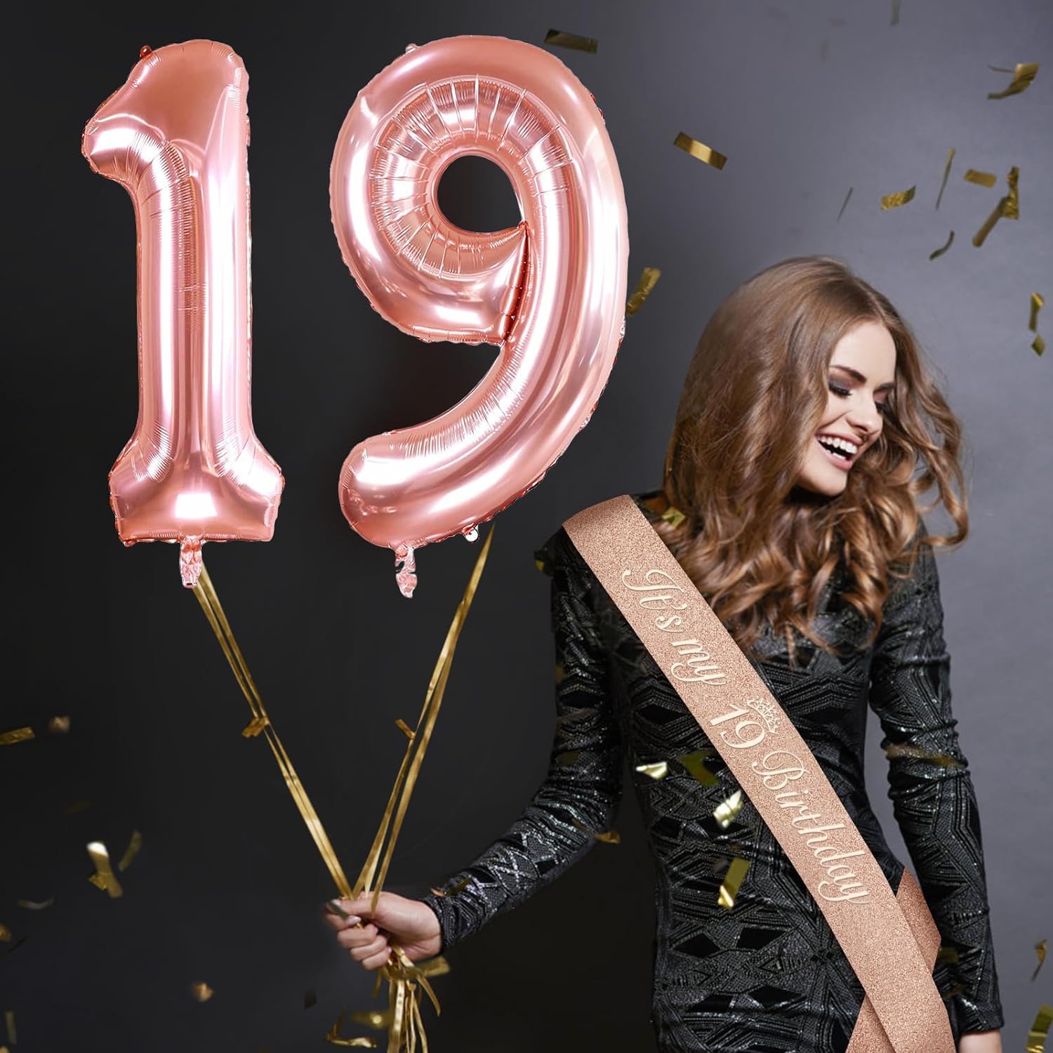 19th Birthday Decorations Set: Package Coming with Glittery Rhinestone 19th Birthday Tiara/Crown x 1pc, Rose Gold 19th Birthday Sash x 1pc, Happy 19th Birthday Cake Topper x 1pc, Number 19 Birthday Candles x 1set, Big Rose Gold Numeral 19 Balloons x 1set, Birthday Card x 1pc. This great valuable 19th birthday gift for girls has been packed in a beautiful gift box for ready presentation