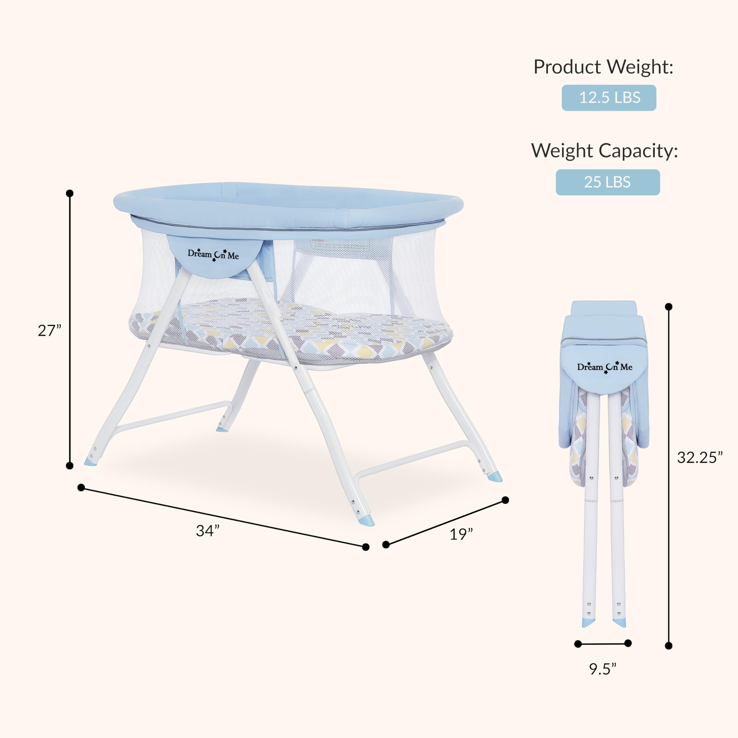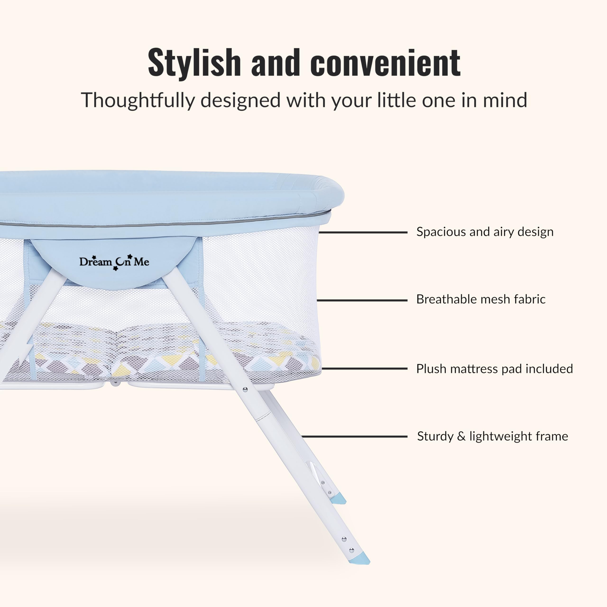 Parenthood moves quickly, and your baby gear should move with you. The Dream On Me Poppy Bassinet was designed for modern families who need comfort, convenience, and mobility—all wrapped into a sleek, stylish design that fits effortlessly into every part of daily life. From the moment you unpack it, the Poppy is ready to go. Lightweight and mobile, it sets up in seconds with simple snap-on legs and a one-piece top structure that makes assembly effortless. Whether you're moving from the bedroom to the living room or heading out for a weekend trip, its durable aluminum frame keeps it easy to carry. When it’s time to store or travel, the Poppy folds down compactly and slides right into the included travel bag—making it a true portable companion for growing families. Inside, comfort meets functionality. The bassinet is crafted from soft, safe polyester foam fabric that feels gentle against your little one’s skin and is easy to clean. A full mesh design surrounds the sleeping area, offering optimal ventilation and clear visibility so you can always keep an eye on your baby. Whether they’re dozing or playing, the Poppy creates a safe, breathable space for your newborn. The removable padded mattress adds another layer of convenience. It provides cushioned support for naps or tummy-time play and folds neatly for storage without losing shape. Measuring 16.75" L x 31" W x 1" H, it offers the perfect balance of comfort and practicality—and cleaning it is as simple as wiping it down. True to its name, the Poppy brings fresh style to every room. Its clean, contemporary design features a roomy interior and comes in four beautiful single and double-tone finishes, making it a favorite among parents who love modern, minimalist décor. Safety remains at the heart of every Dream On Me product, and the Poppy is no exception. The bassinet is JPMA Certified, meeting all ASTM and CPSC safety standards so your baby rests in a secure sleep environment. With a space-saving collapsible frame, it folds down to just 9.5" L x 32.25" H—perfect for small spaces, shared rooms, or families who prefer clutter-free living. When assembled, the sleeping area measures 34" L x 19" W x 27" H and safely supports babies up to 25 lbs. or 3 months of age. Backed by a 1-year limited warranty, the Poppy Bassinet is built to offer comfort, reliability, and peace of mind—no matter where your journey takes you.