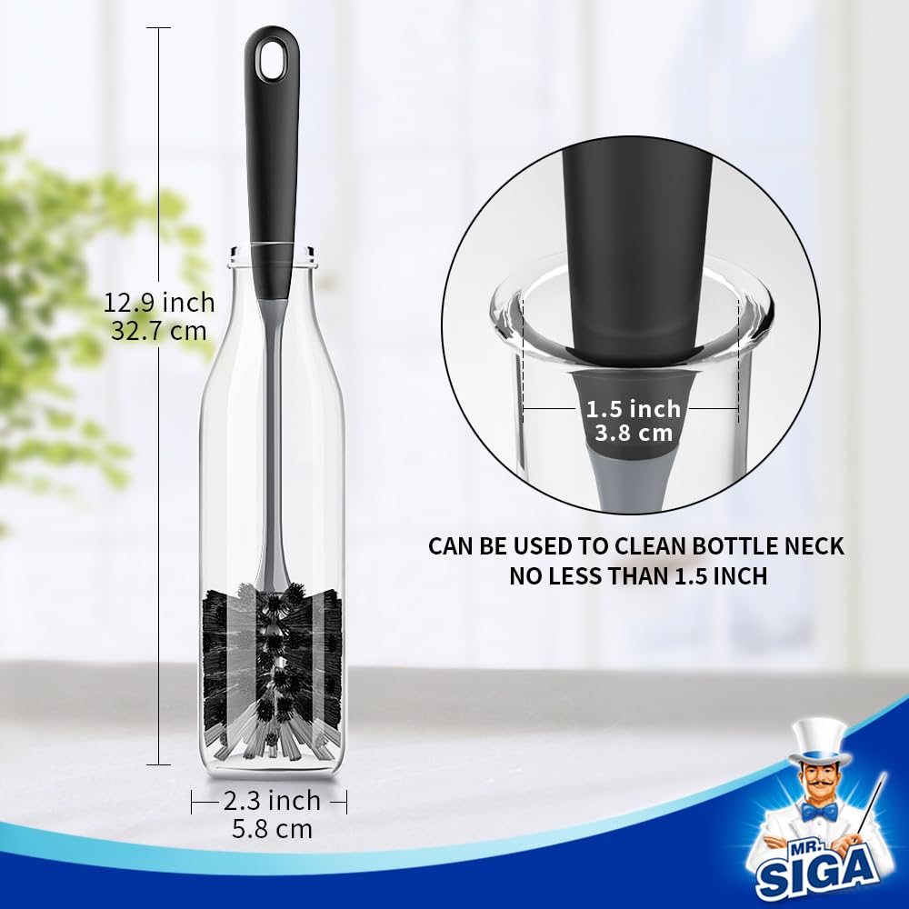 Long reach 12.9 inch handle provides more convenience and helps reach deep into bottles and glasses. 2.3 inch brush head easily reaches into bottles, glass pitchers, and carafes.