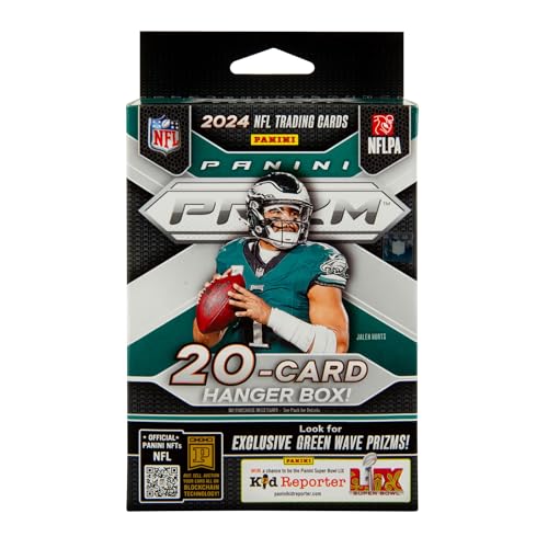 Panini presents the 2024 NFL Prizm Football Trading Card Hanger Box. Each box contains 20 cards. Look for Exclusive Green Wave Prizms.