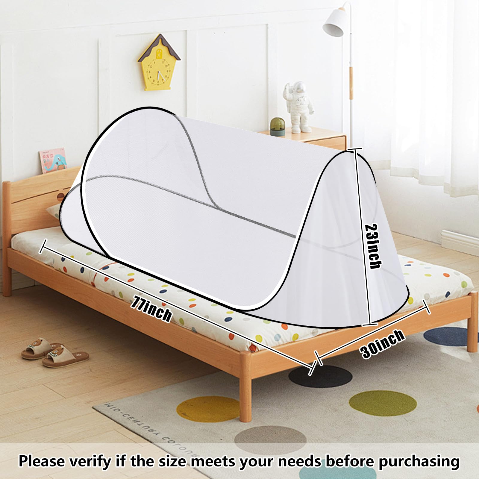 Pop Up Mosquito Net Size: L77 * W30 * H23inch -Out of box, no installation required -Good breathability, high-density mesh -Portable, easy to carry -Double zipper design, easy to enter and exit