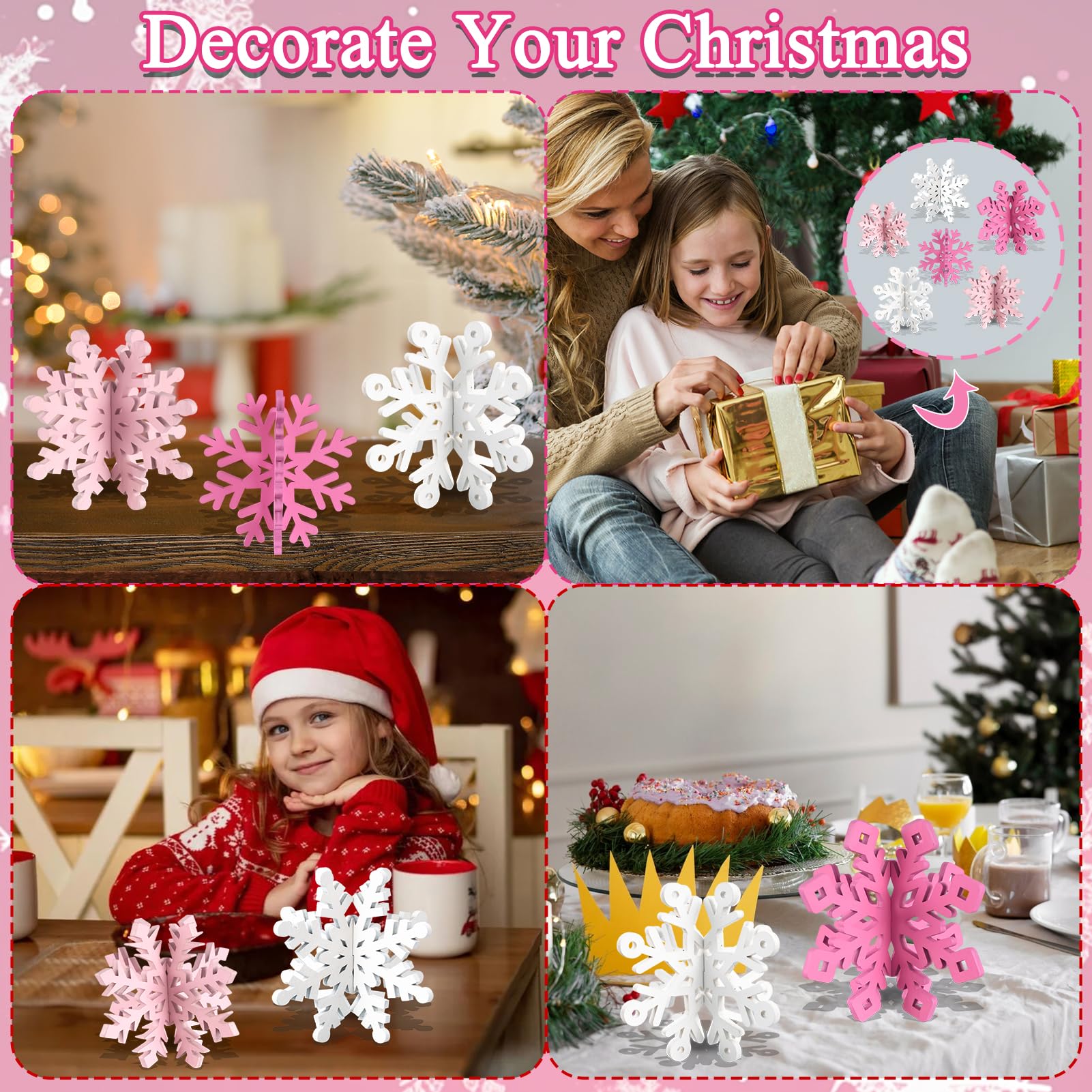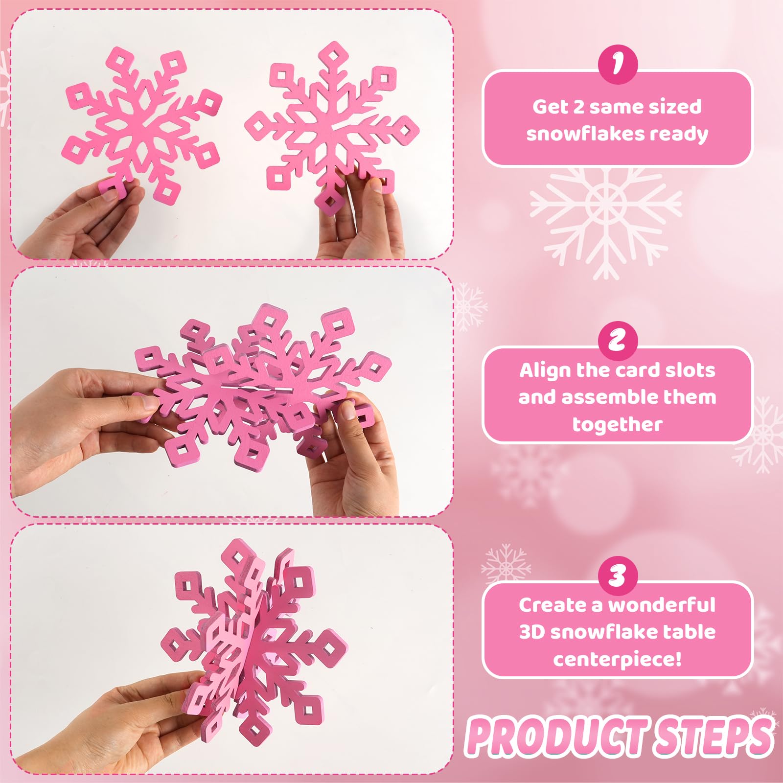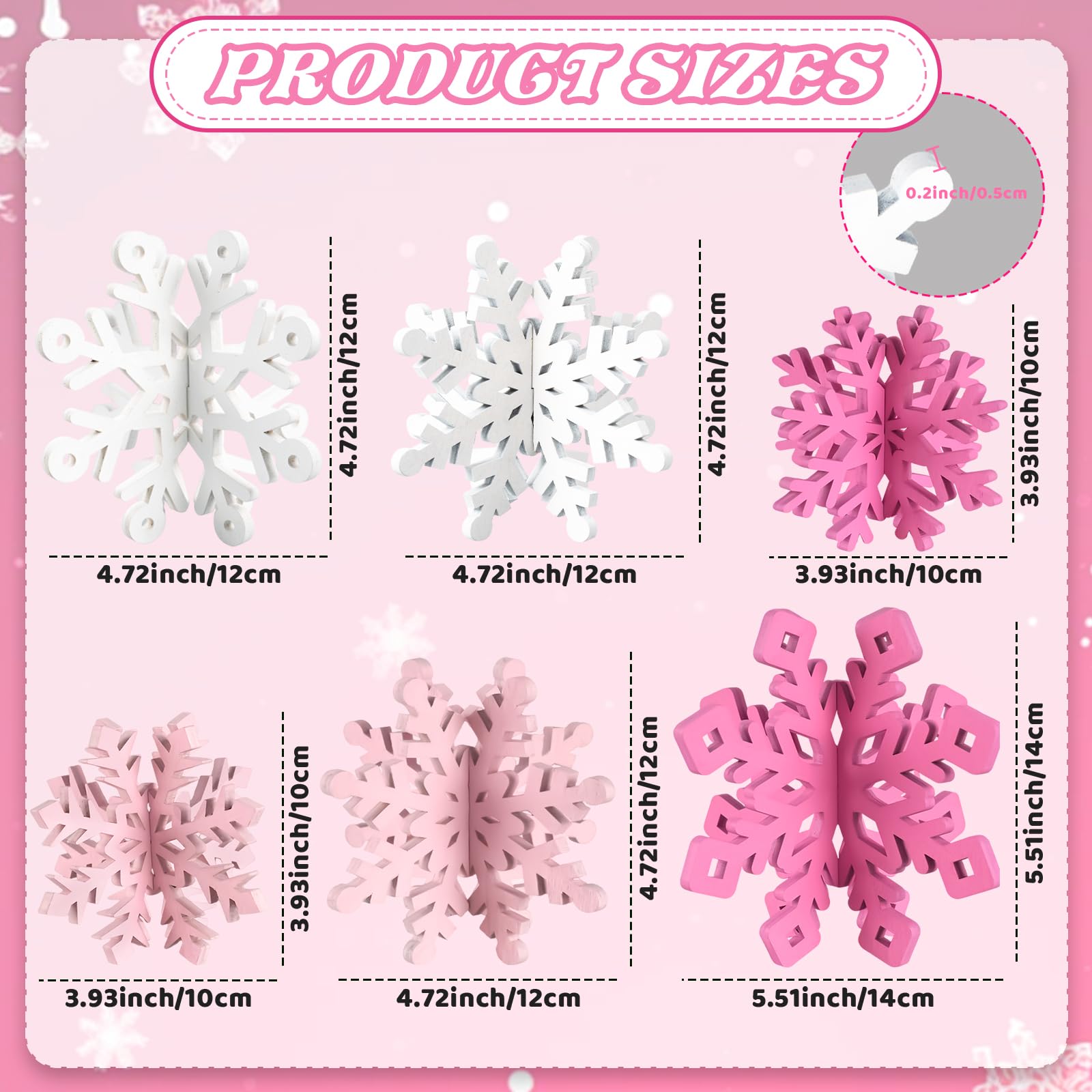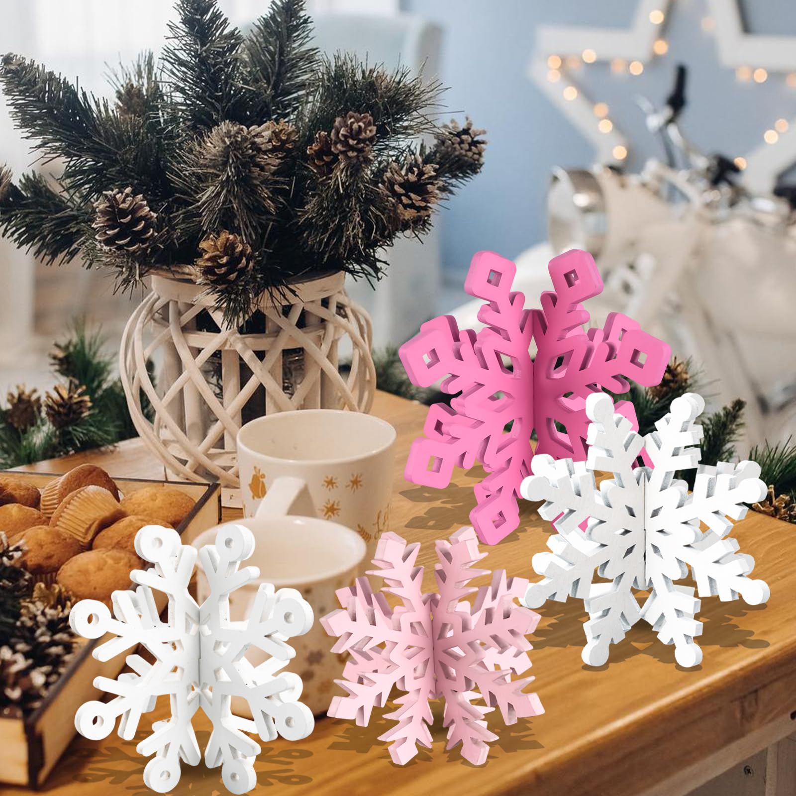 Elegant Snowflake Centerpieces: Turn your holiday table into a festive winter wonderland with our wooden snowflake decoration set. Including 4pcs white wooden snowflakes, 4pcs pink wooden snowflakes and 4pcs light pink wooden snowflakes in 5 distinct styles and 3 sizes—3.9", 4.7", and 5.5" in diameter—these 3D snowflake table centerpieces are simple to assemble into 6 stunning sets