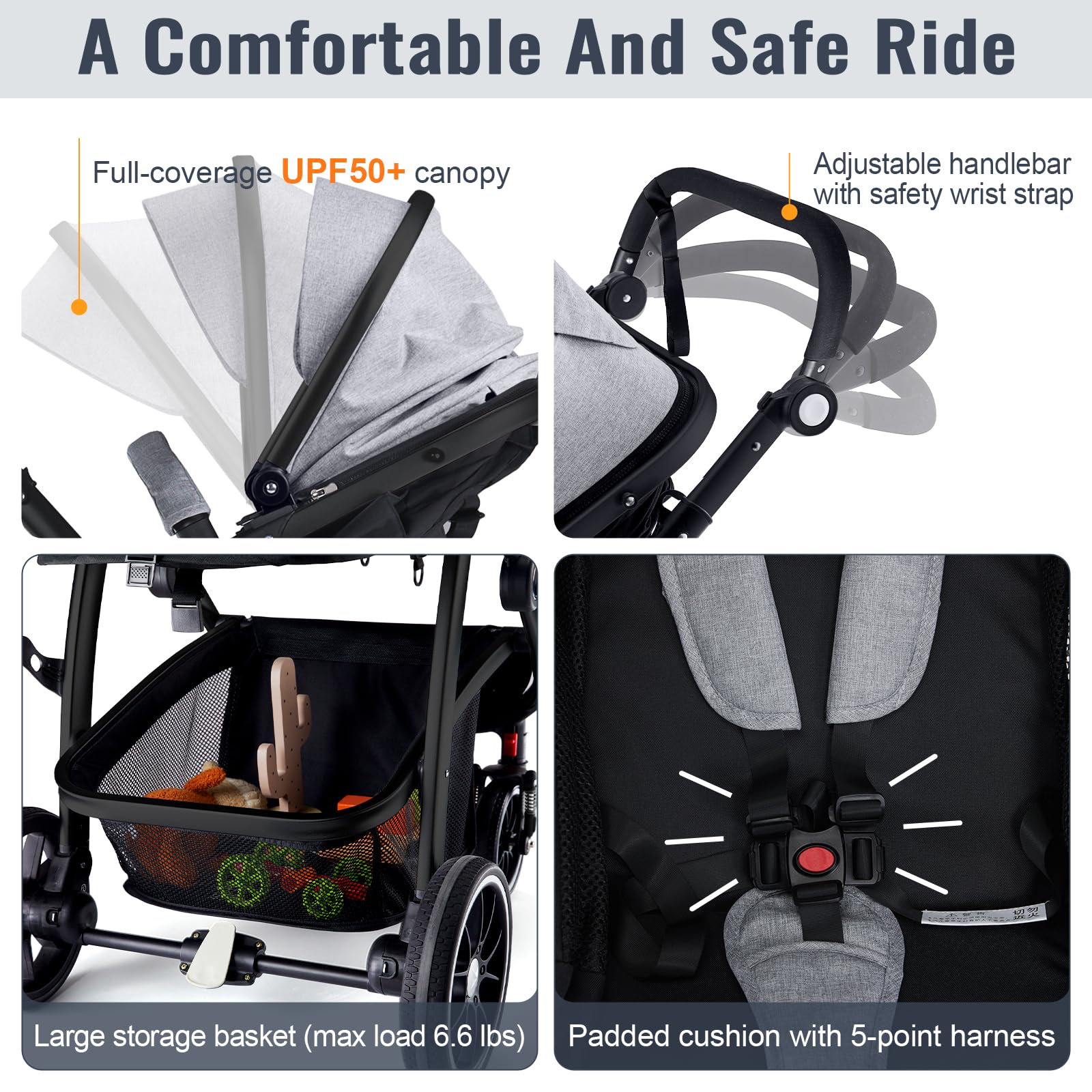 SAFETY DESIGN: The newborn stroller is equipped with 5-point harnesses to keep the baby secure. The pram stroller also features a one-foot brake, shock absorbers, and a sun canopy to enhance safety in different conditions.