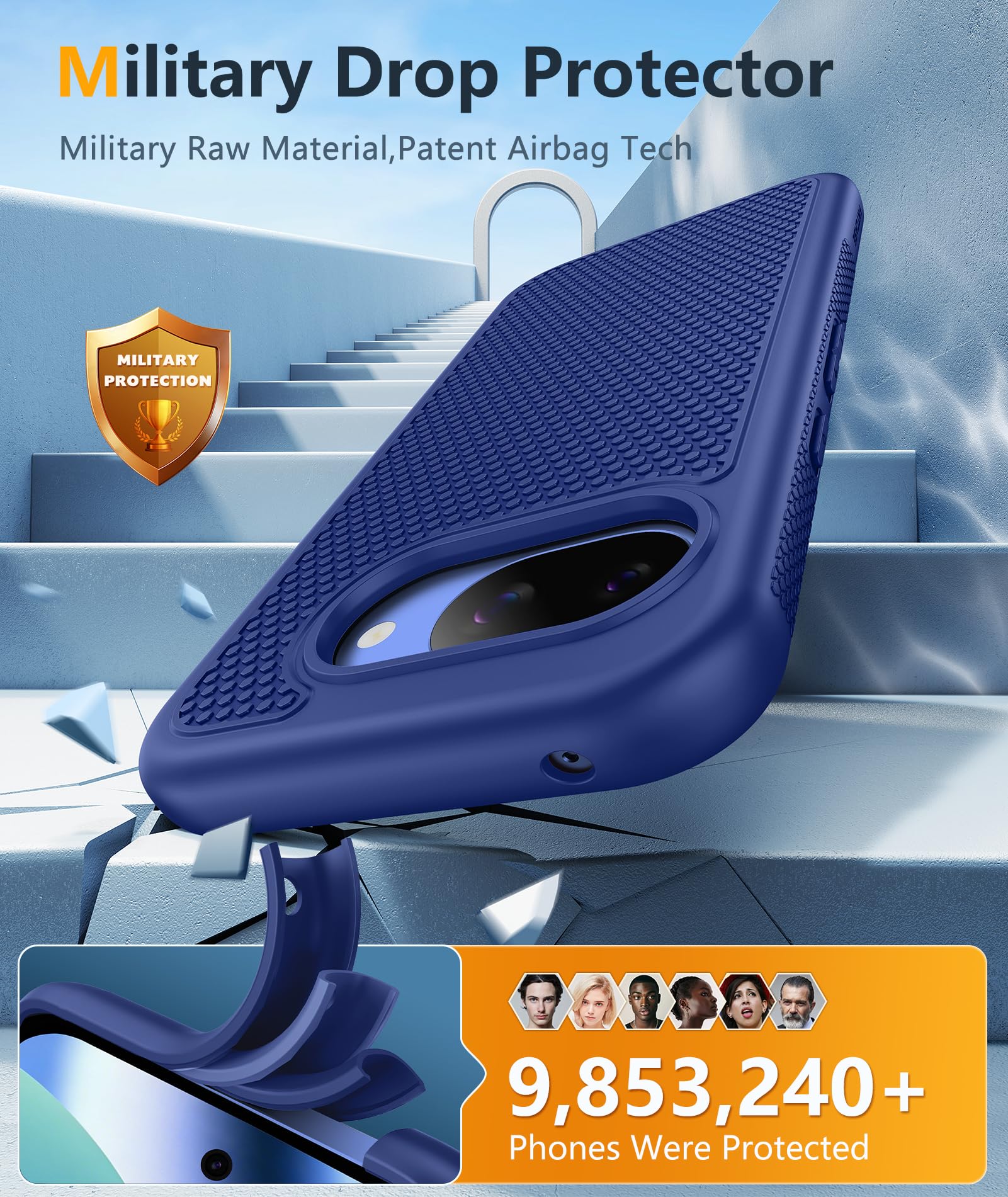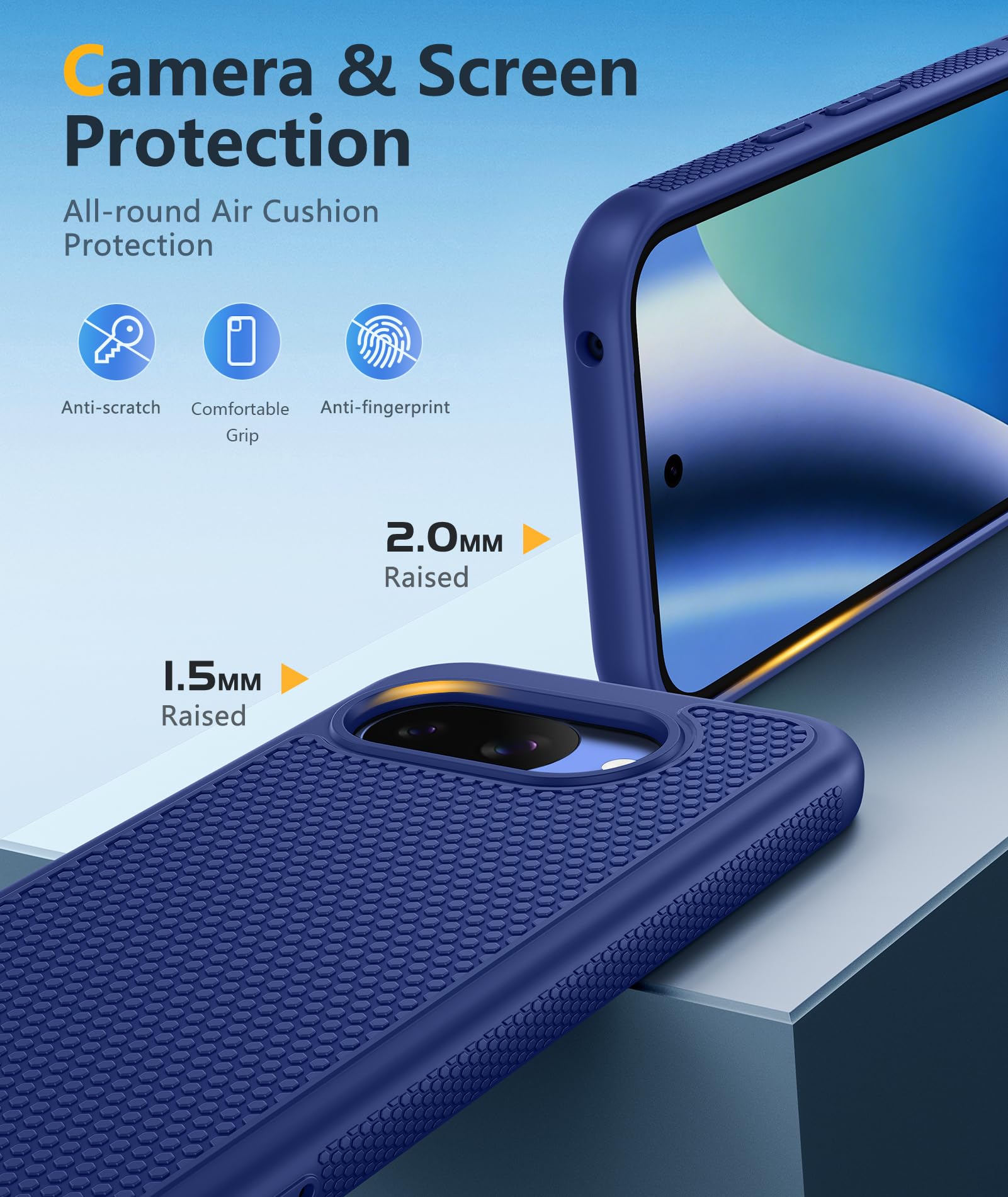 TPU Soft Case: Features four-corner airbags and a honeycomb inner design for shock absorption and heat dissipation, delivers strong impact resistance against accidental drops with 14-foot military-grade drop protection, and is equipped with a 2.0mm raised bezel camera guard plus a 1.5mm raised front edge to prevent screen scratches