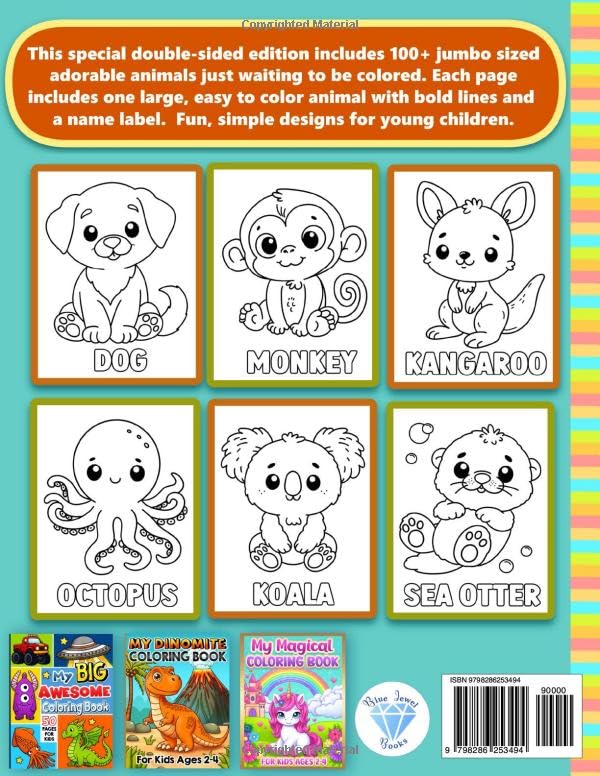 ⭐⭐New Book - Special Launch Pricing⭐⭐ 🐷100 Jumbo Animals Coloring Book for Kids🐯 This book includes a huge collection of fun coloring pages featuring 100 adorable animals. Features zoo and safari animals, farm animals, pets, ocean animals and sea creatures, insects, reptiles and more!! Here's why you and your child will ❤️love❤️ this book: 🐴 100 Unique and fun pages to color featuring adorable animals. Each page features a single jumbo-sized animal. Simple designs with bold lines, perfect for young children. 🐭 Each picture is labelled to help your child identify letters and learn basic vocabulary. 🐣 Suitable for boys and girls ages 2 and up. Fun for toddlers, preschoolers and kids. 🦁 Our adorable glossy cover makes this book perfect for gifting 🐰 Double-sided printing on 8.5 x 11”, high quality, white paper pages. 🐶 Check out the pictures of our interior pages to see for yourself just how cute this coloring book is!! 🐱 Great for boys and girls who love animals! This book features double-sided printing. If you prefer single-sided printing check out our other titles: Happy Ocean, Happy Farm and Happy Zoo which feature many of the same animals but in a single-sided format. ⭐ Pick up your copy of today⭐ The Book Contains: ✔️100 double-sided coloring pages ✔️Premium glossy cover design ✔️Printed on high quality 55# white paper ✔️Perfectly sized at 8.5” x 11” 💎 Blue Jewel Books / BJB Publishing 💎 strives to provide high quality, original and educational books that are reasonably priced. Check out our author page to view our entire collection of coloring and activity books for all ages.