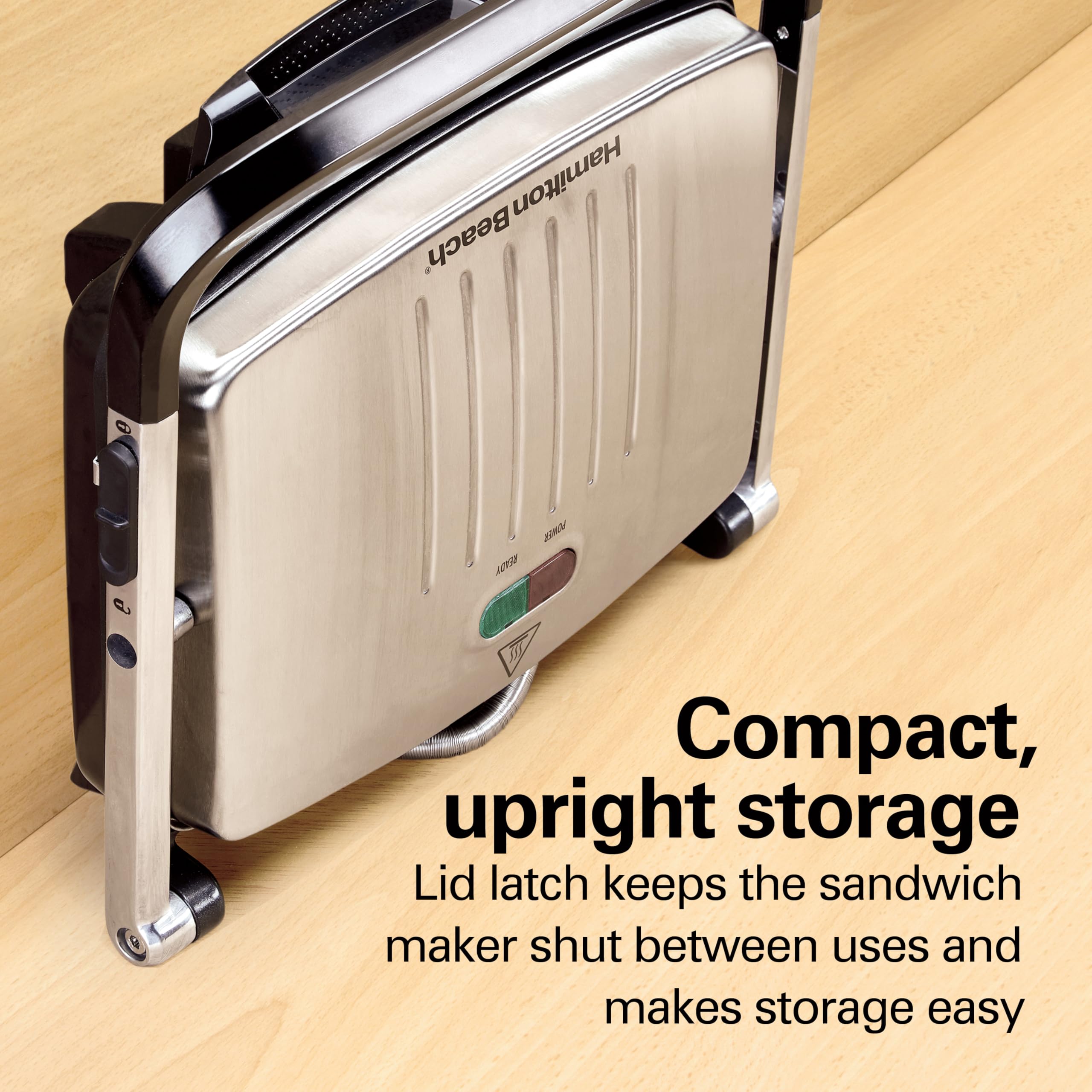COMPACT, UPRIGHT STORAGE: A lid latch keeps the panini press shut between uses and makes it easy to store either flat or upright