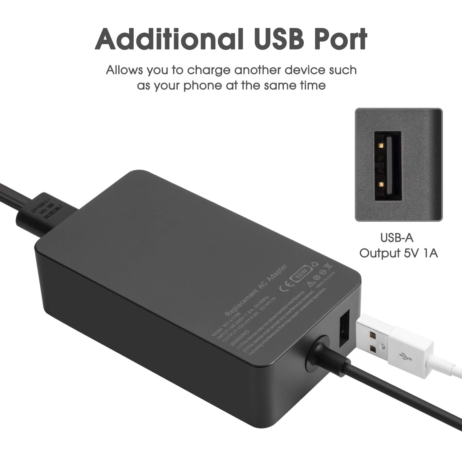 Features a convenient magnetic plug that attaches instantly and detaches safely. The included 6.2ft charging cord for Surface Pro offers flexibility for office or home use. The additional USB port lets you charge your phone simultaneously