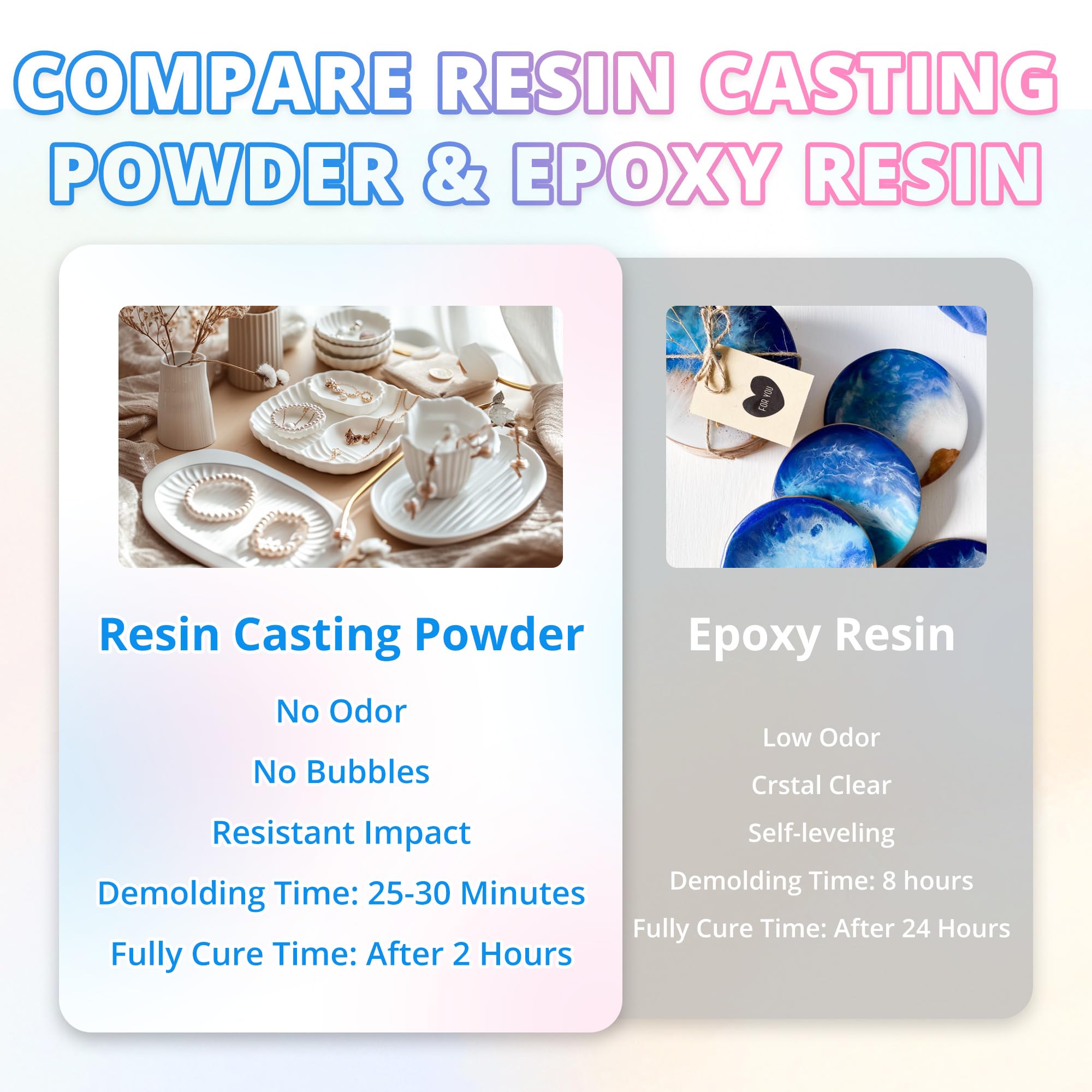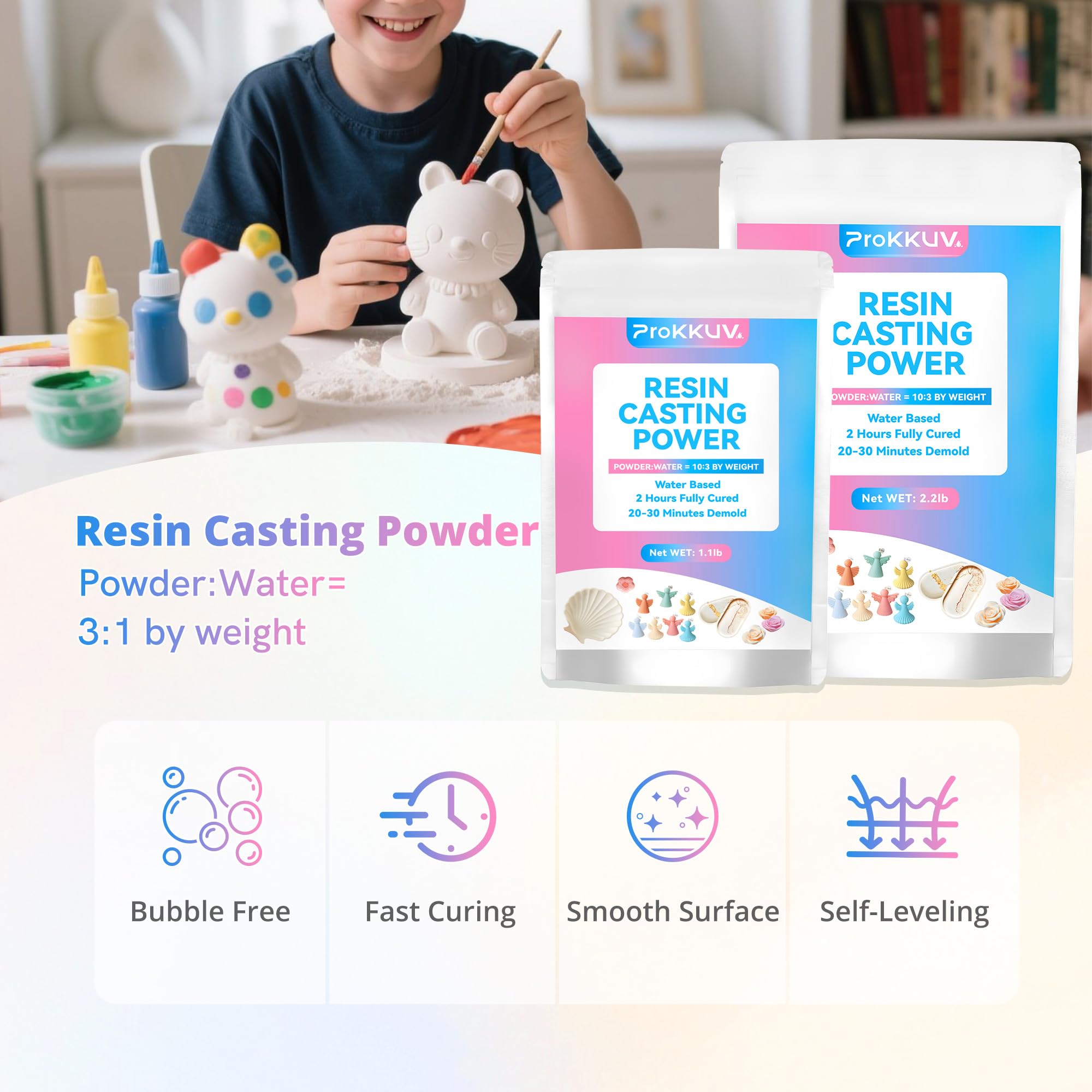【25~30 Minutes Demold & Bubble-Release】 Enjoy quick results with a demolding time of 20–30 minutes and full curing in just 2 hours. Be sure to wait until it’s fully cured before demolding to prevent damage to corners and edges. The powder’s excellent degassing properties guarantee results, with bubbles easily removed by gently tapping the silicone mold.