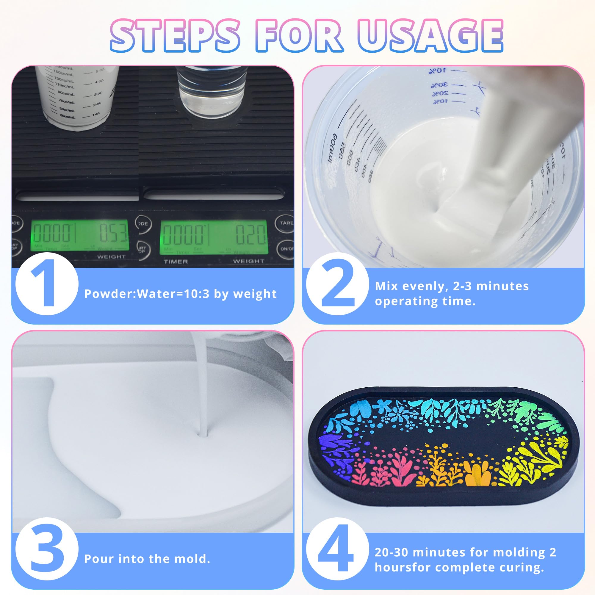 【Easy to Mix & Beginner Friendly】 Combine the powder and water in a 10:3 weight ratio for optimal results. Stir the mixture thoroughly for 2 minutes to prevent clumping and ensure an even texture.And pouring it into the mold.