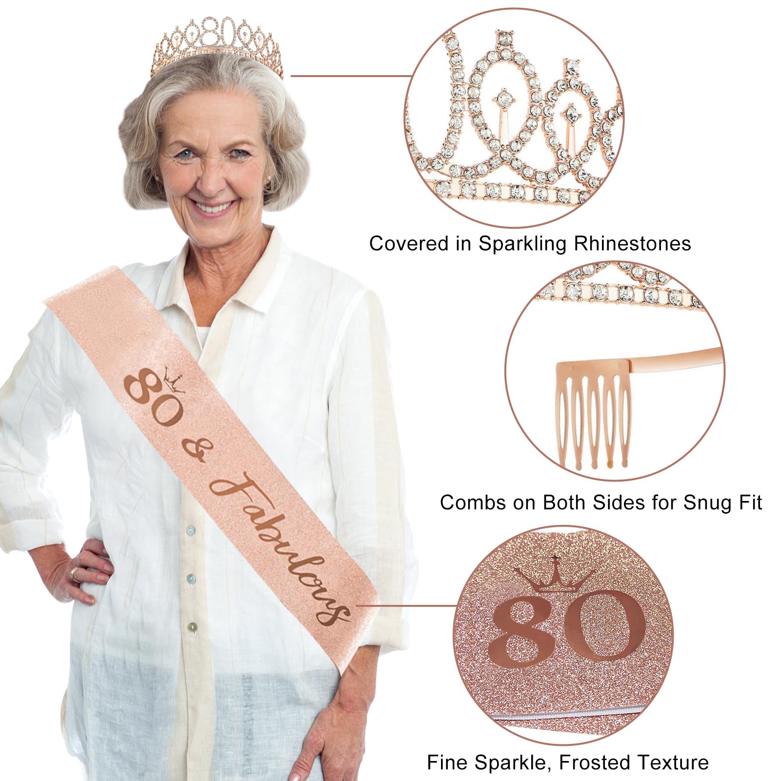 Happy 80th birthday decorations kit: The sparkling design of 80th birthday crown and sash suits women of all body shapes, makes the eighty birthday protagonist shine in the party
