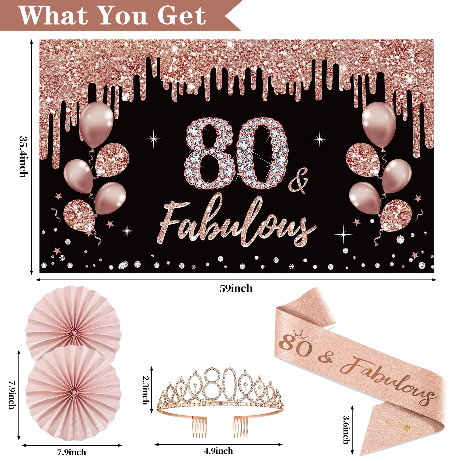80th birthday decorations for women: Celebrate in style with Uiorgui 80th birthday decor, featuring a complete 33 pieces set including a crown, sash, banner, backdrop, 21 latex balloons, 6 hanging swirls, and 2 paper fans for a 80 birthday party